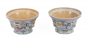 2 Asian glazed earthenware jardinieres/cache pot with flower and animal decorations on an octagonal base (PRICED EACH)