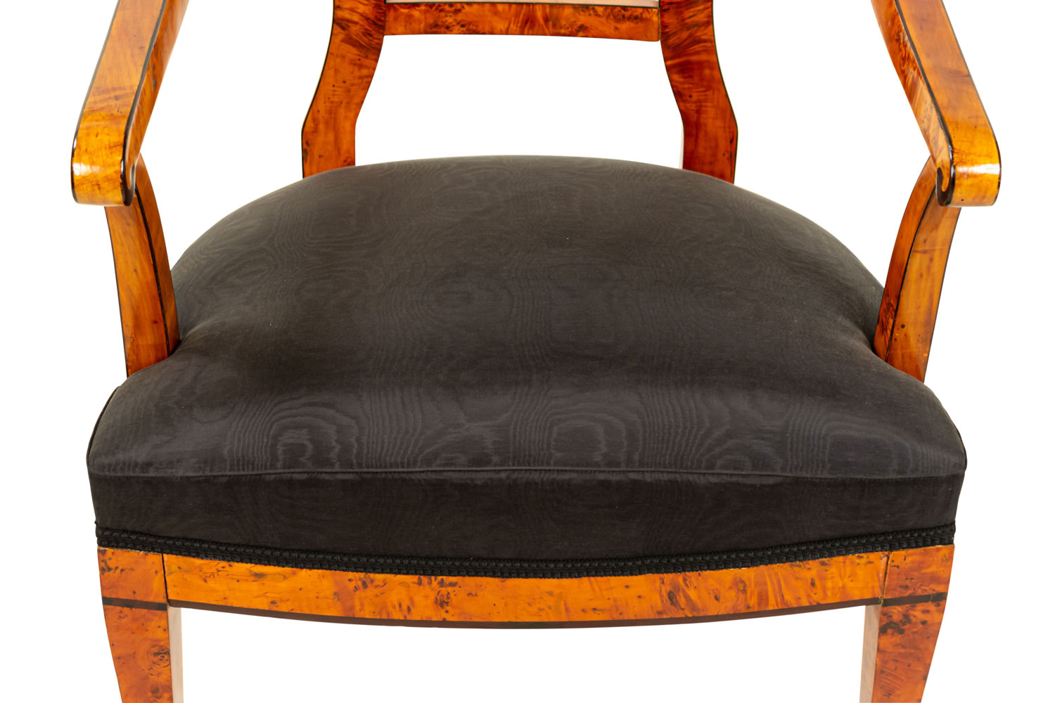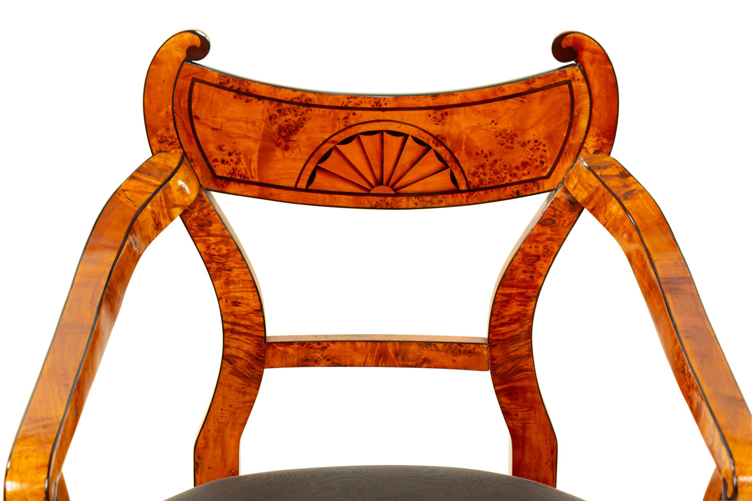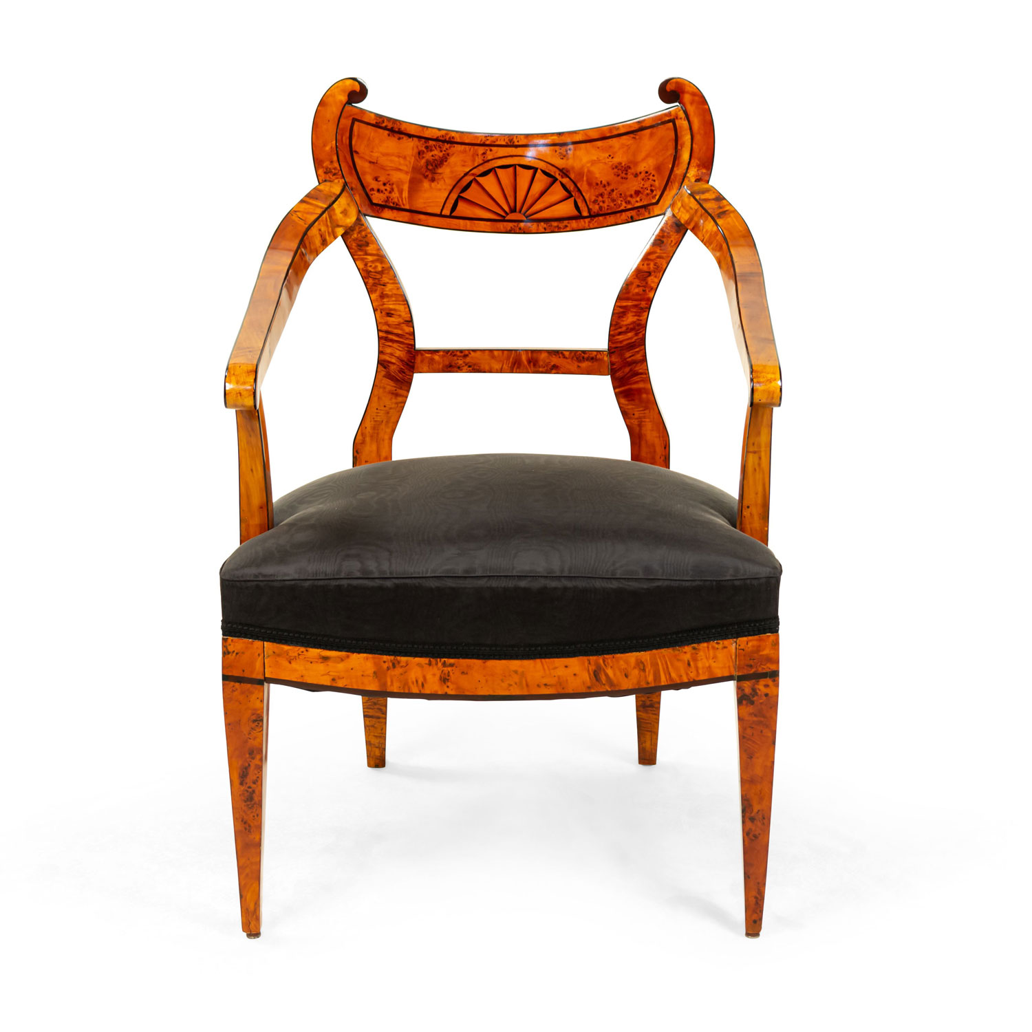 Austrian Biedermeier Karelian birch arm chair with ebonized & mahogany inlaid trim on back with scroll design finial. (Circa 1825)