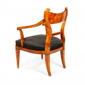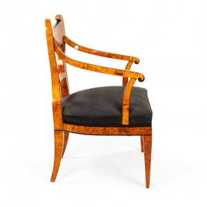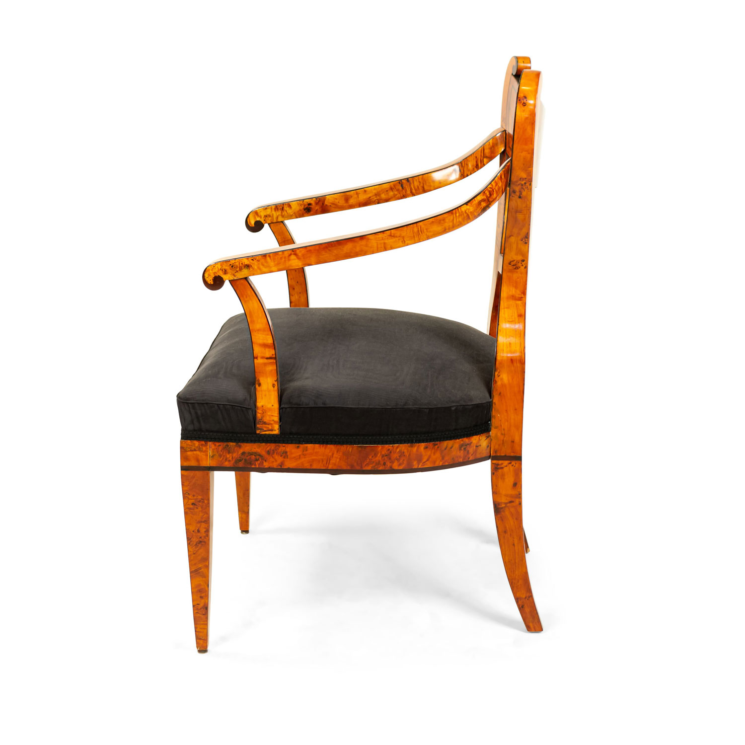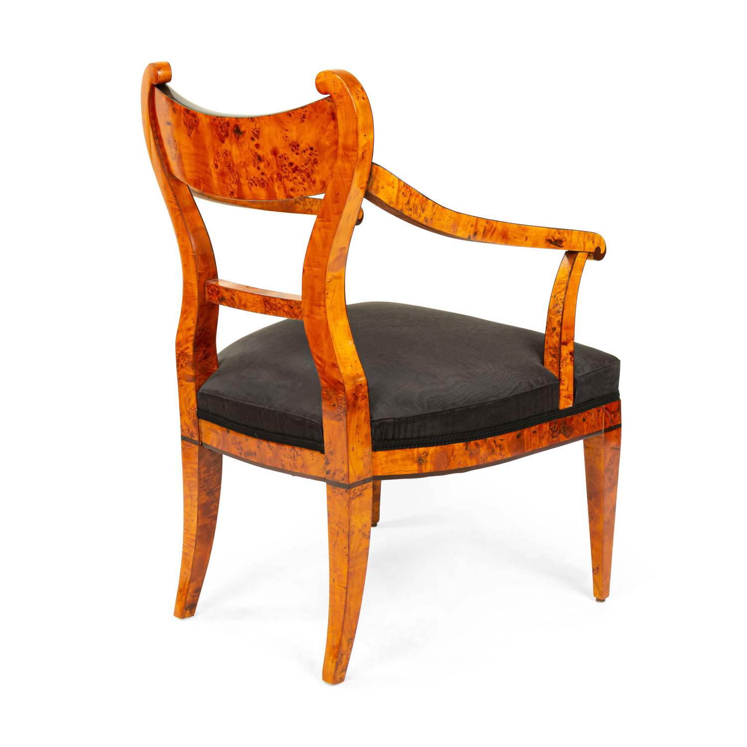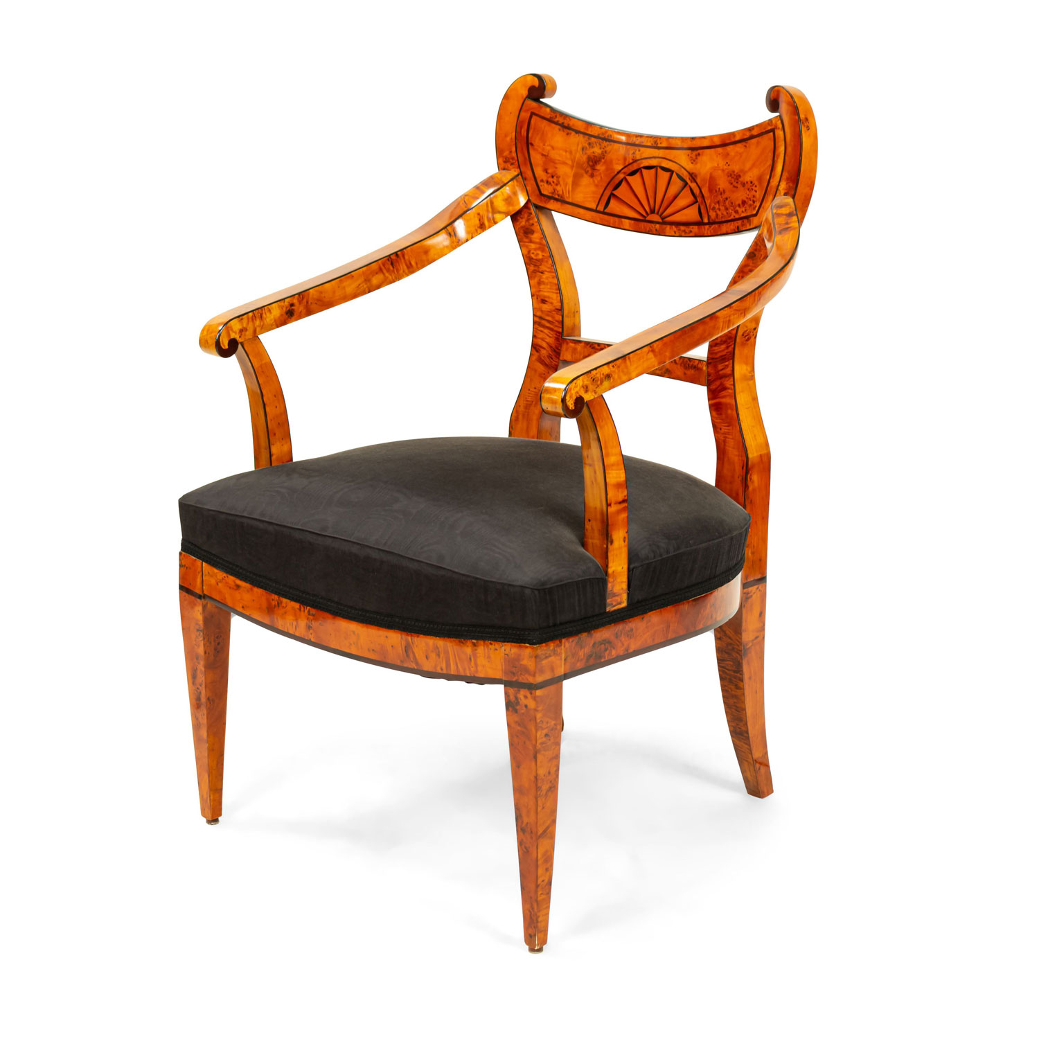 Austrian Biedermeier Karelian birch arm chair with ebonized & mahogany inlaid trim on back with scroll design finial. (Circa 1825)