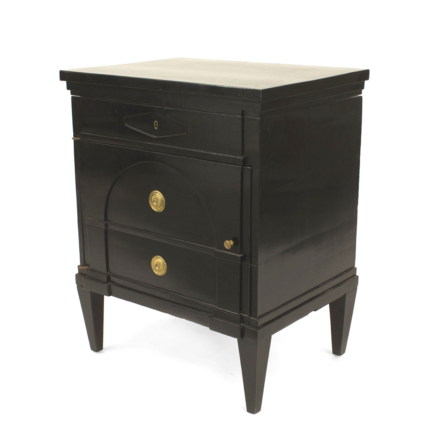 Austrian Biedermeier style (20th Century) ebonized commode with a bottom door revealing 2 shelves and a top faux drawer with a lift top.