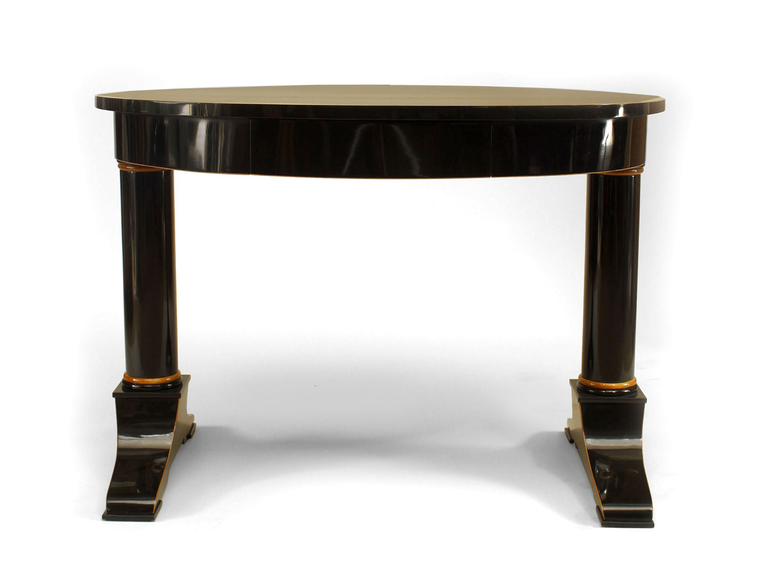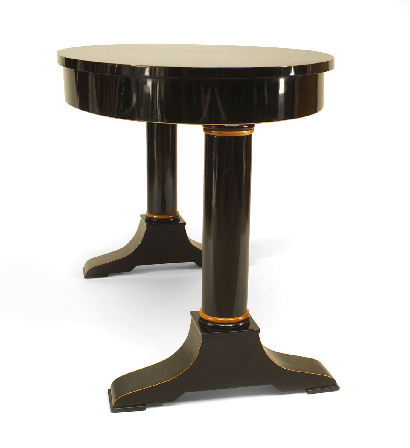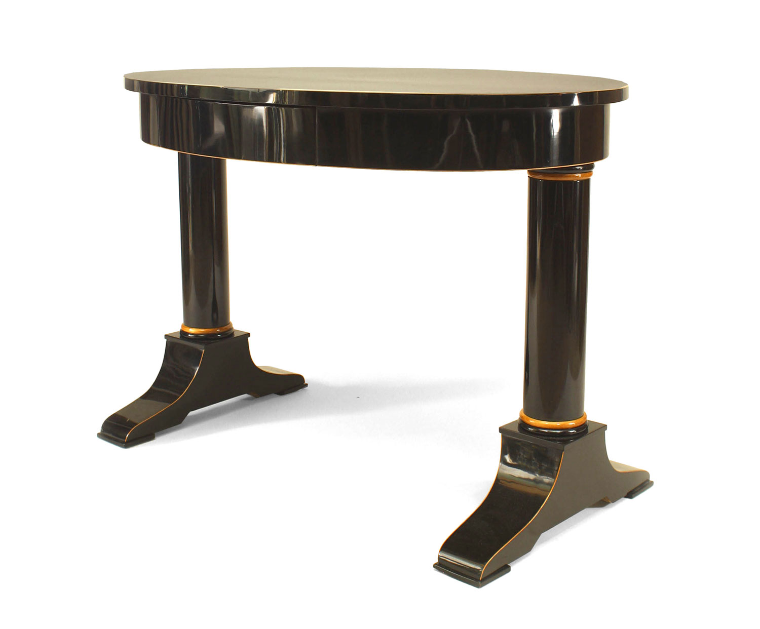 Austrian Biedermeier (circa 1825) ebonized oval top table desk with maple trim and pearwood inlaid banding and supported on 2 columns with a center drawer.