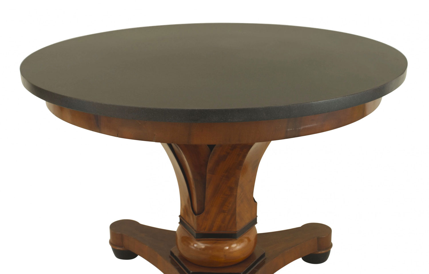 Austrian Biedermeier (circa 1830) black round marble topped mahogany center table having a palm leaf support over a tripartite base on padded feet.