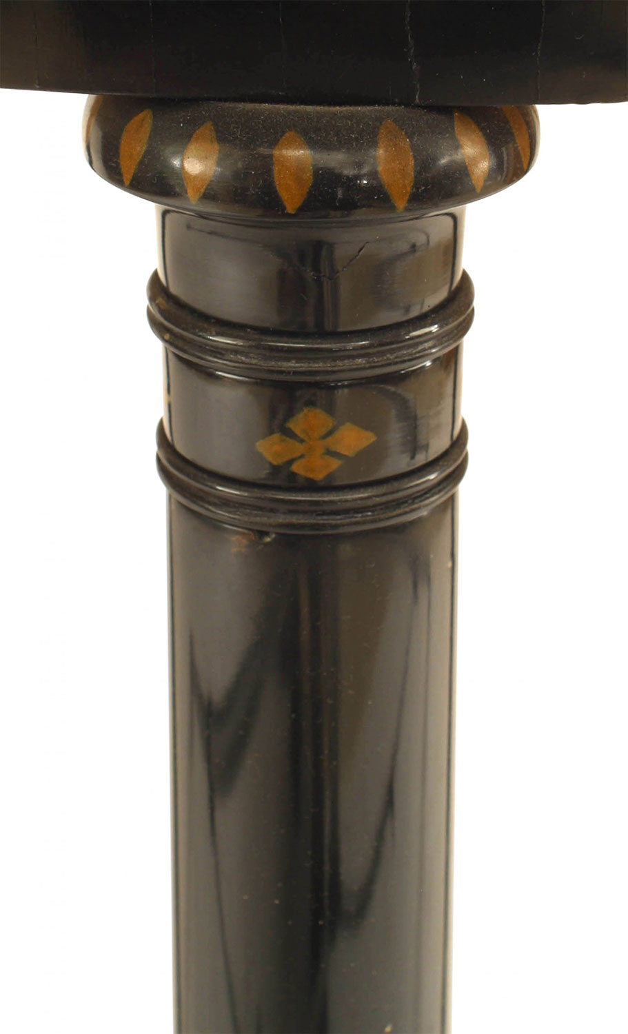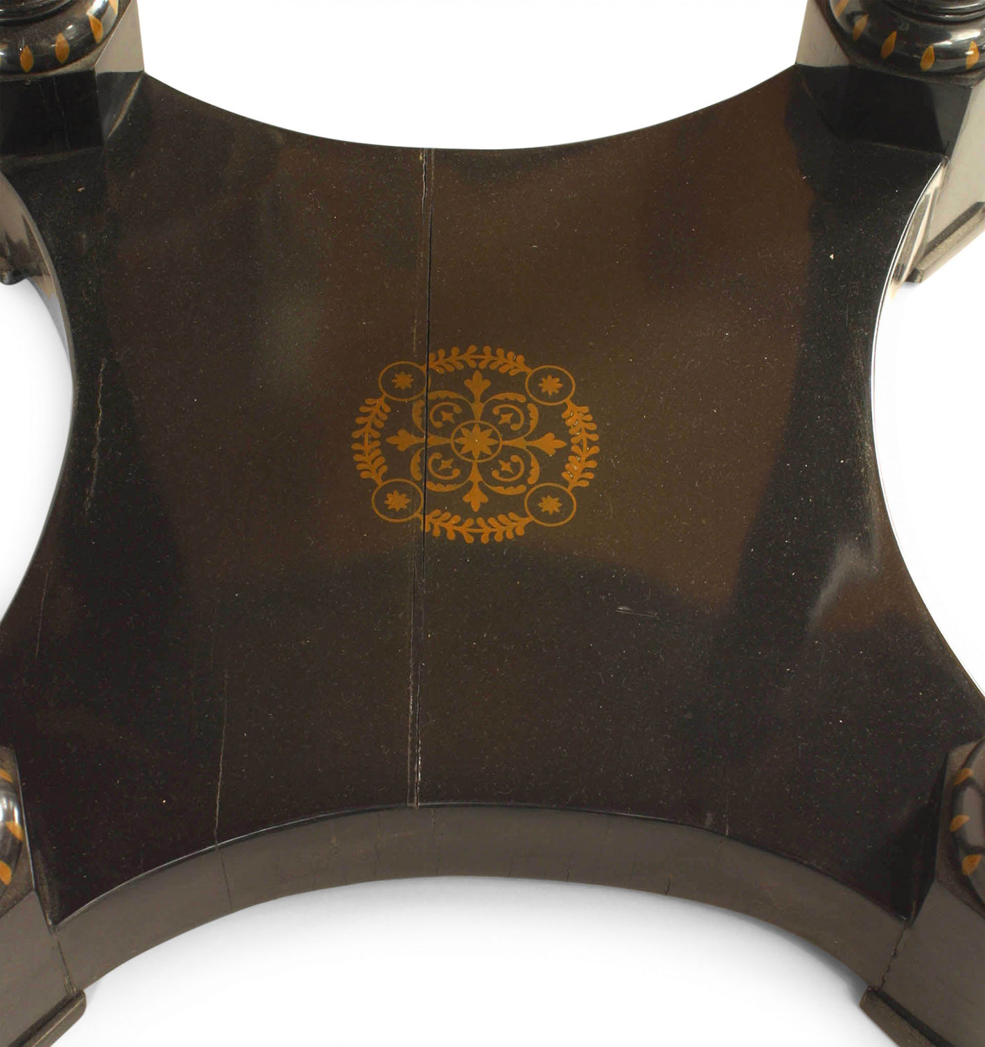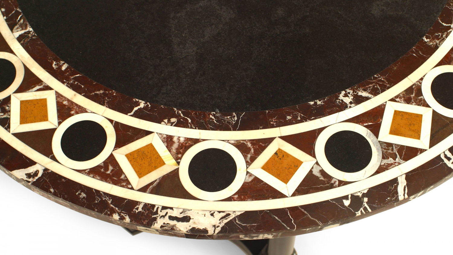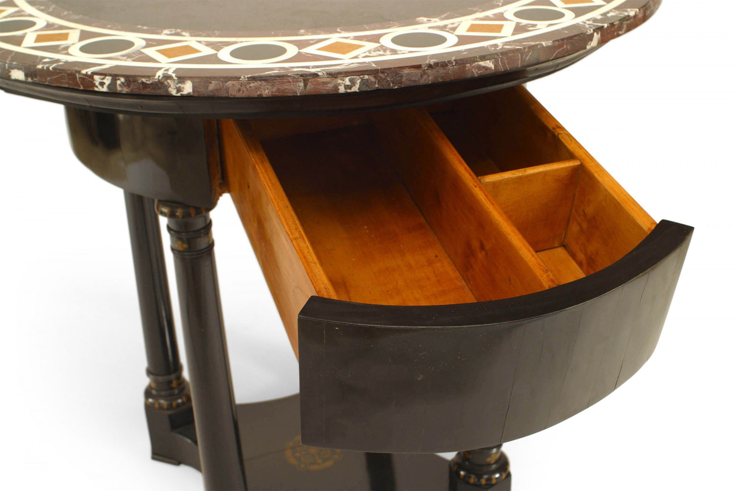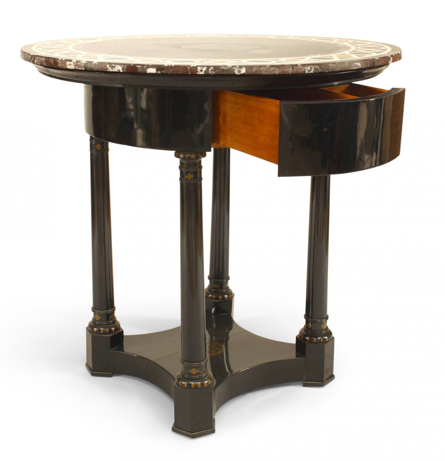 Austrian Biedermeier (circa 1820) round ebonized center table with inlaid marble top & drawer supported by 4 columns ending in a platform base with gold stenciled decoration..