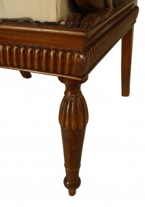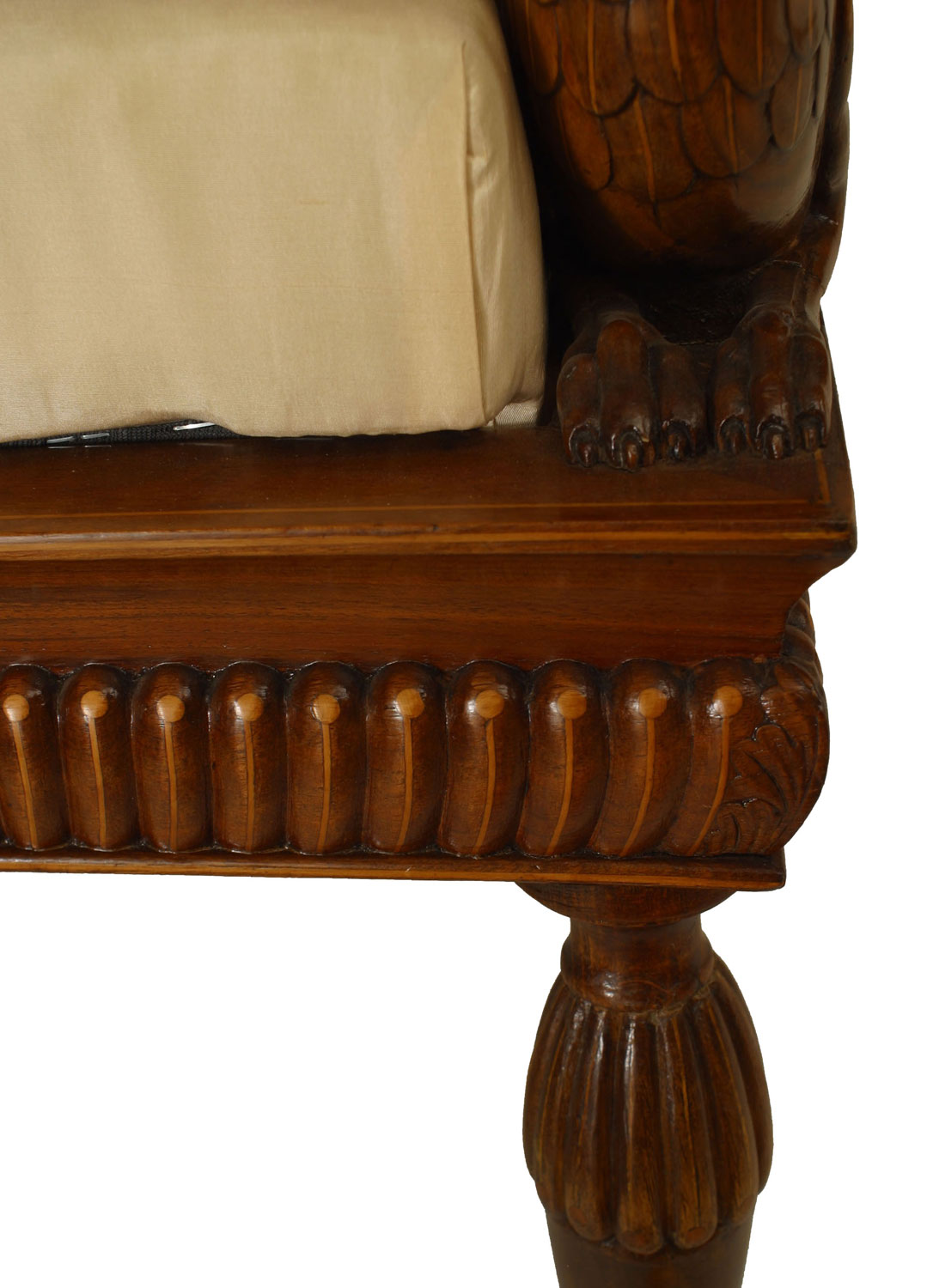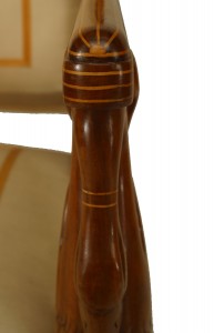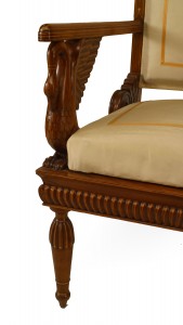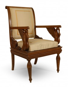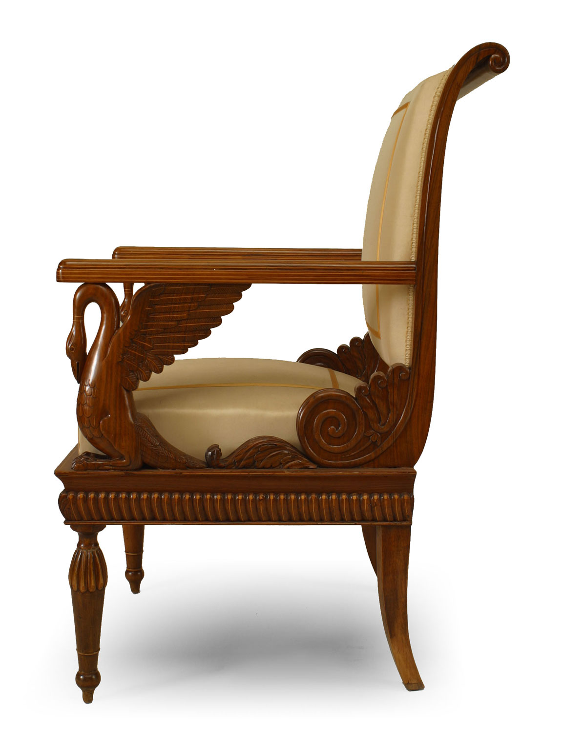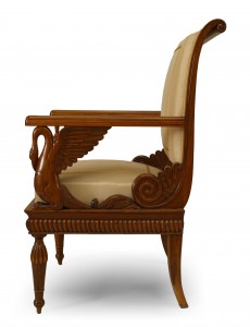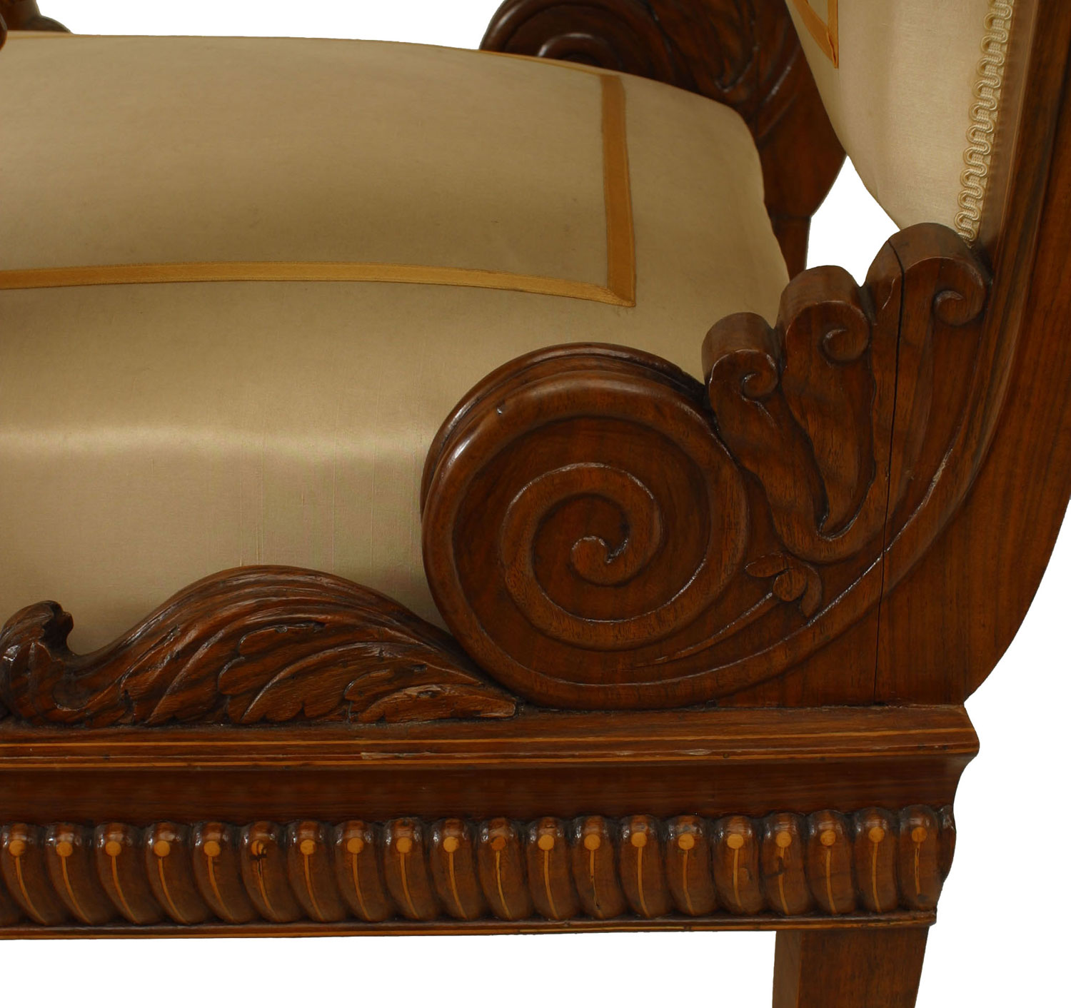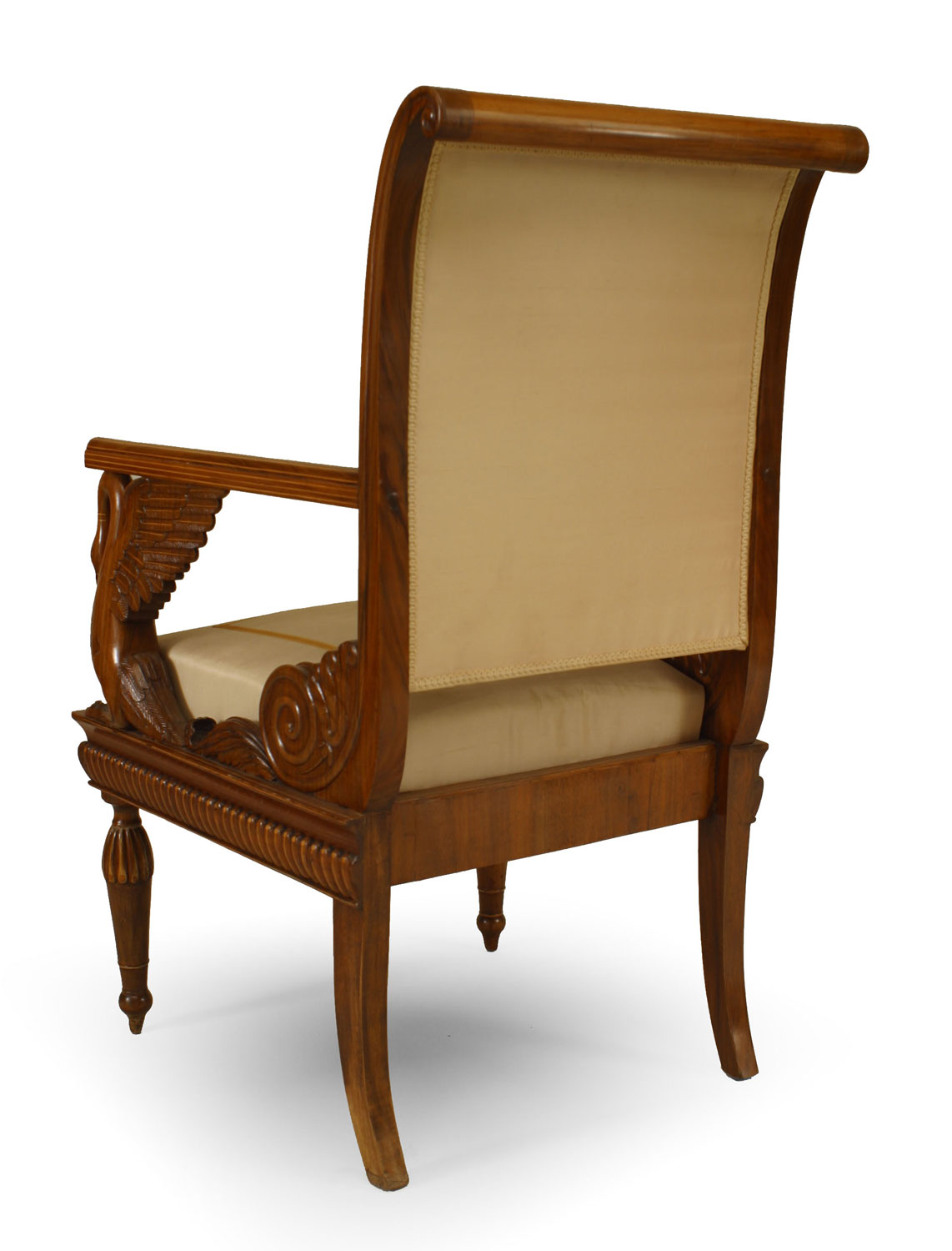 SET of 4 Austrian Neoclassic fruitwood inlaid walnut arm chairs upholstered in beige satin with sleigh back above swan arm supports and reeded turned legs (c.1820) (Original Upholstery ripped)