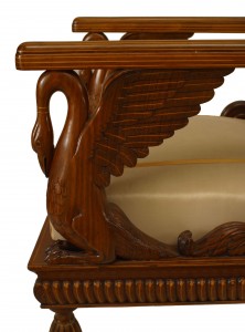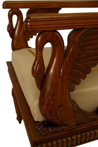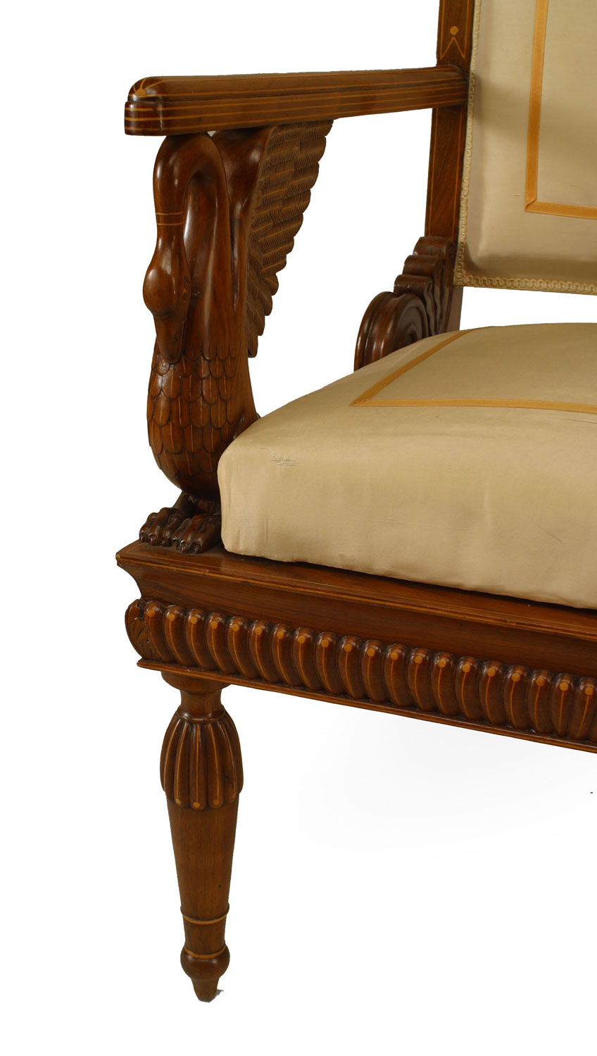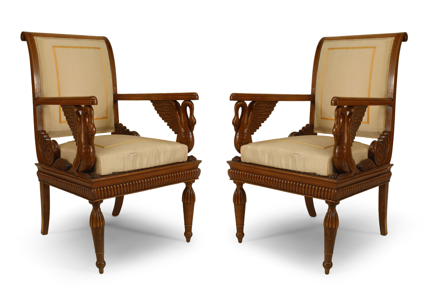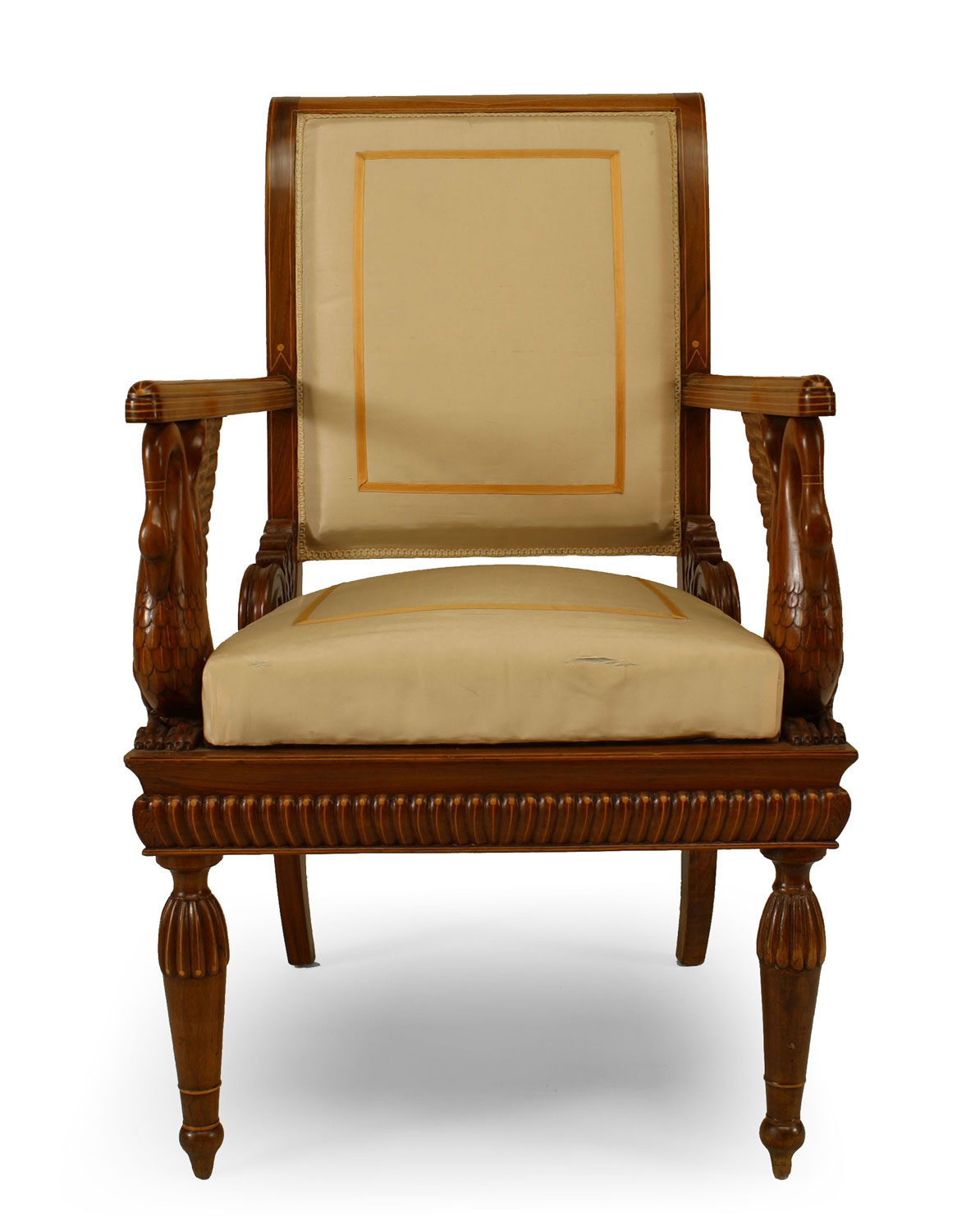 SET of 4 Austrian Neoclassic fruitwood inlaid walnut arm chairs upholstered in beige satin with sleigh back above swan arm supports and reeded turned legs (c.1820) (Original Upholstery ripped).