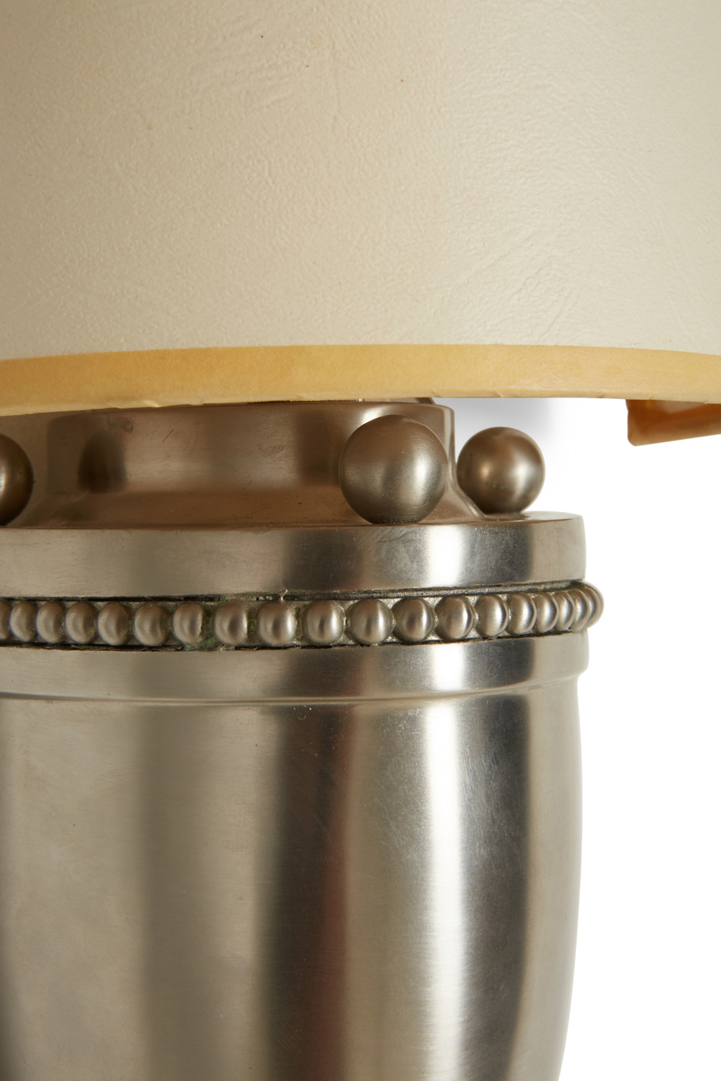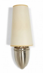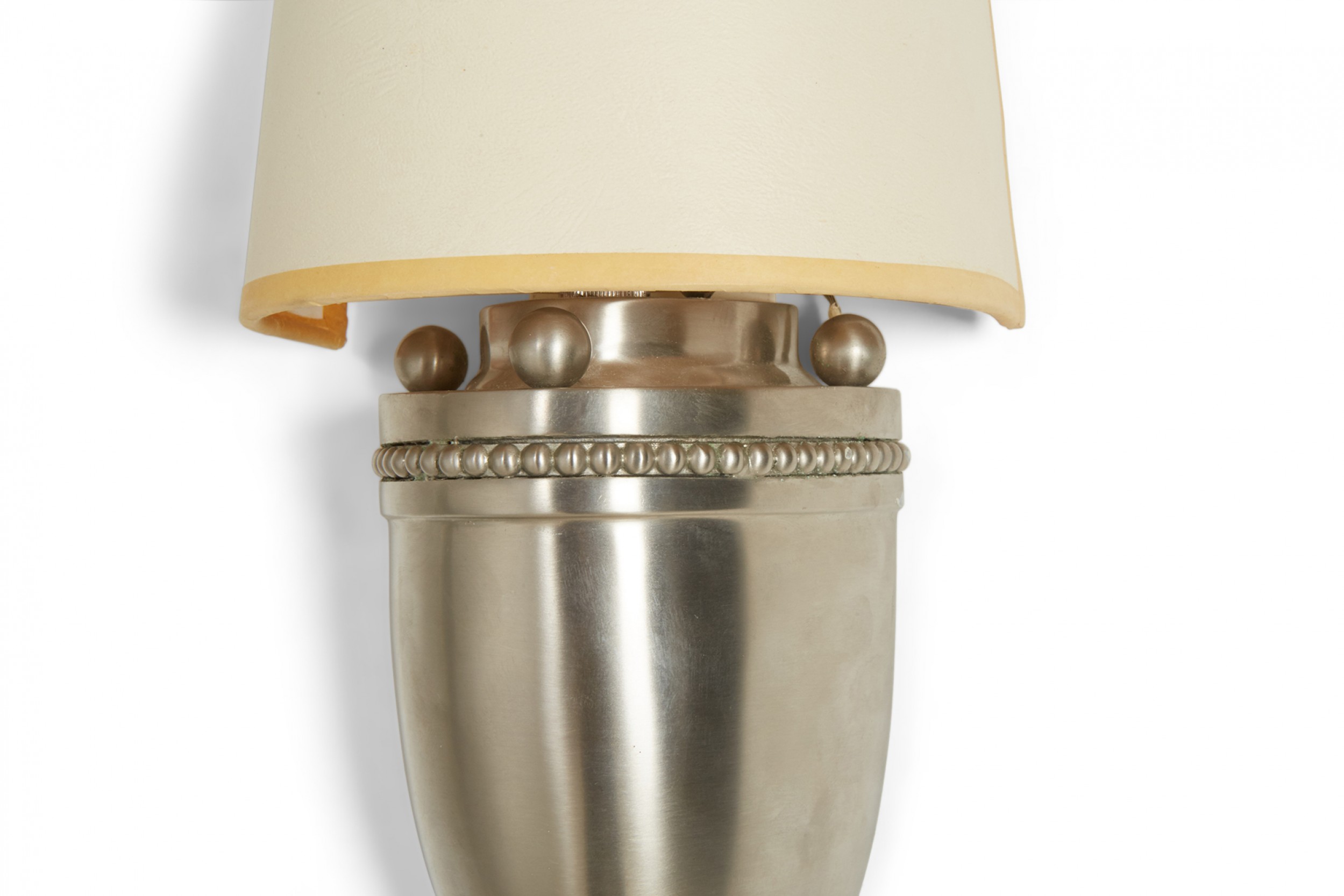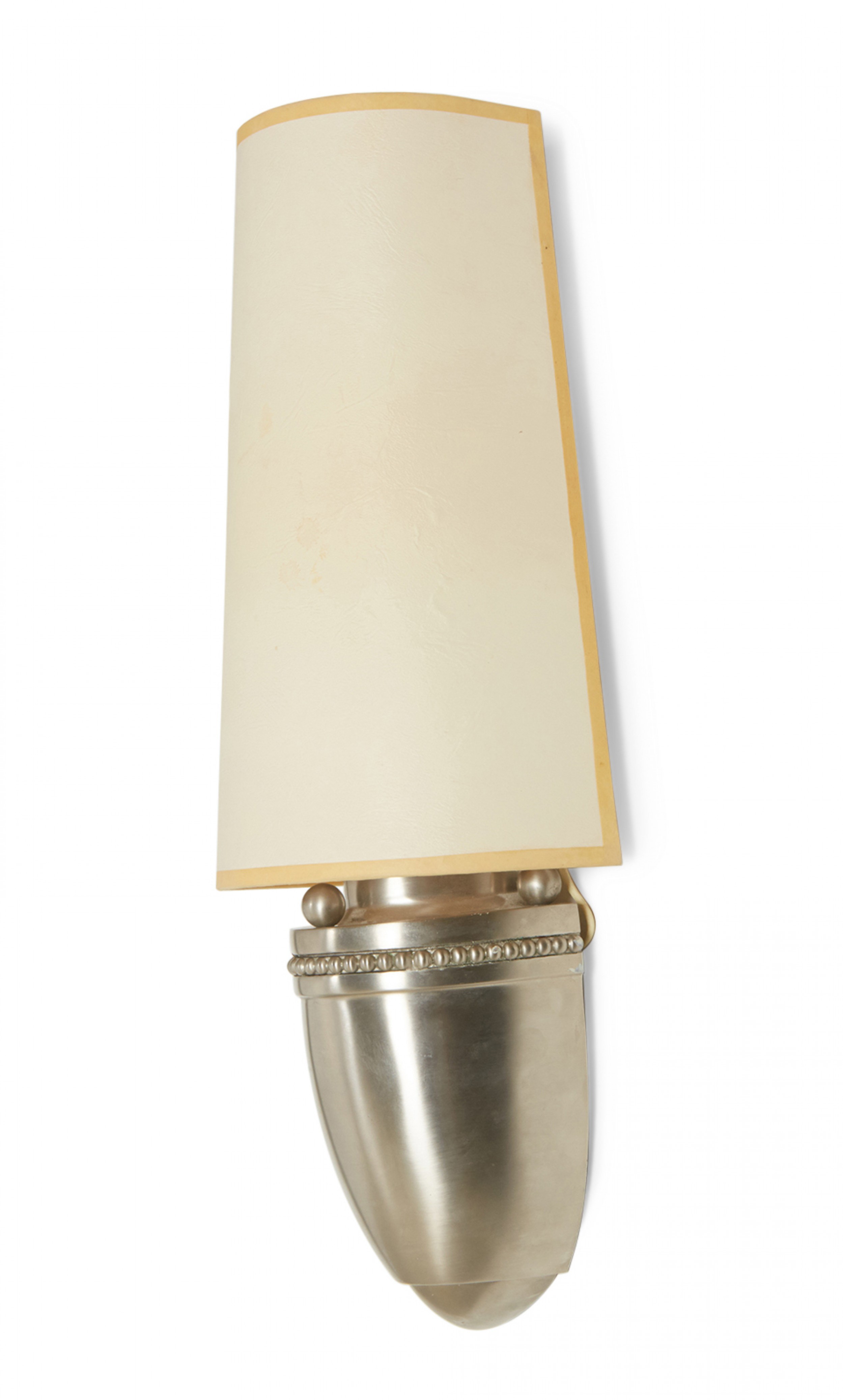 Mid-Century silver metal wall sconce with a rounded base with beaded trim and a tapered beige paper half-shade over a single light. (LOUIS BALDINGER & SONS ARCHITECTURAL LIGHTING).