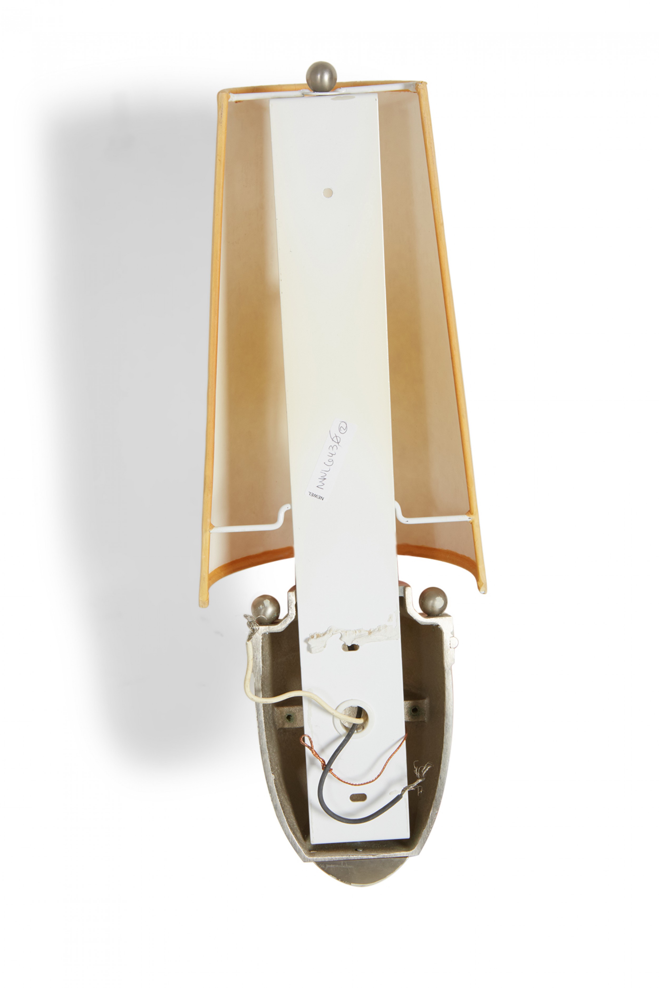 Mid-Century silver metal wall sconce with a rounded base with beaded trim and a tapered beige paper half-shade over a single light. (LOUIS BALDINGER & SONS ARCHITECTURAL LIGHTING)