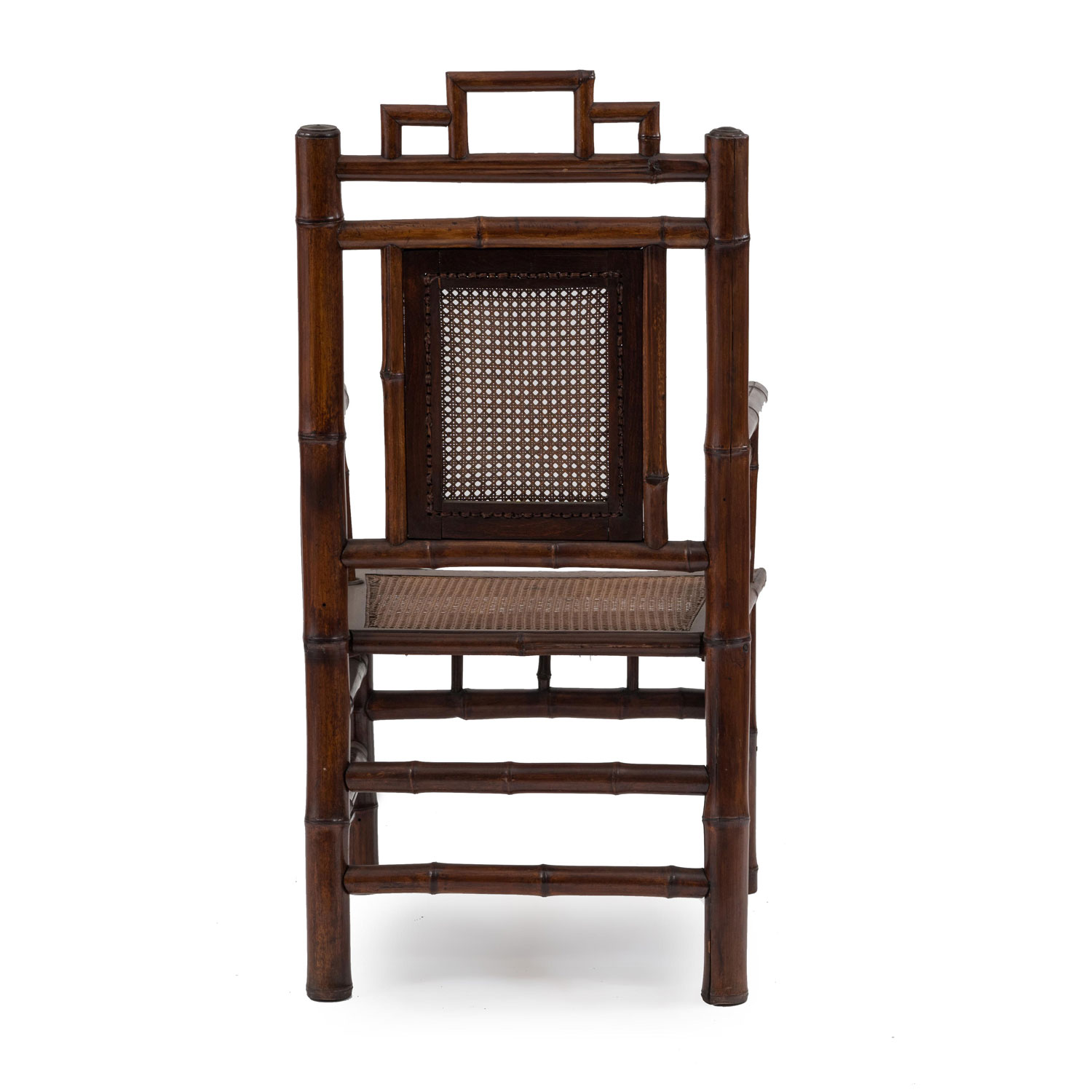 PAIR of bamboo Armchairs with spindle design on arms and cane seat and back panel (19/20th Cent.).