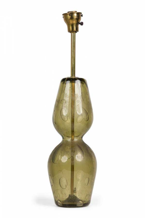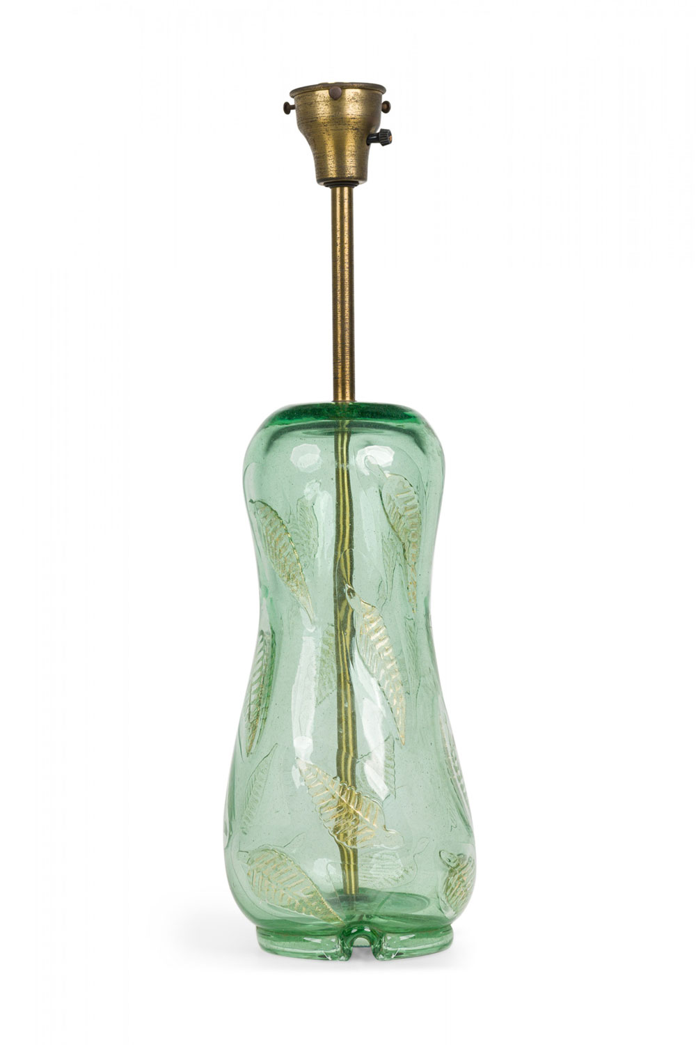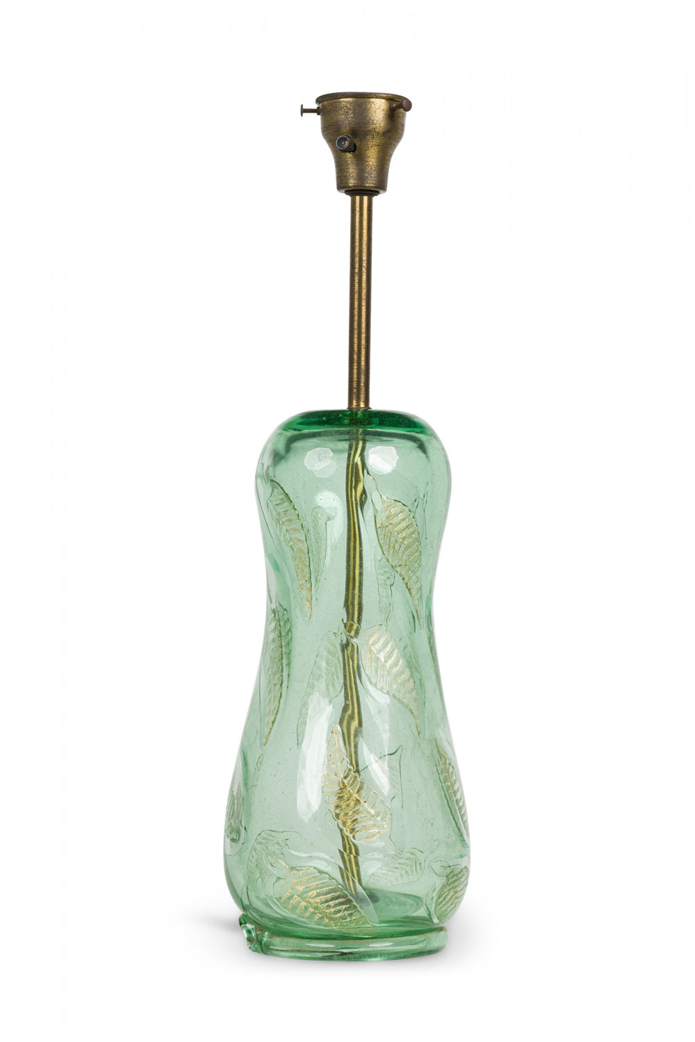 Mid-Century Italian Fallen Leaf handblown green glass table lamp in organic gourd form, connected to a brass stem and functioning cupped light switch socket, with an Art Nouveau-styled transparent body featuring an interior all-over leaf pattern. (BAROVIER ET TOSO)(Similar piece: DUL0026)