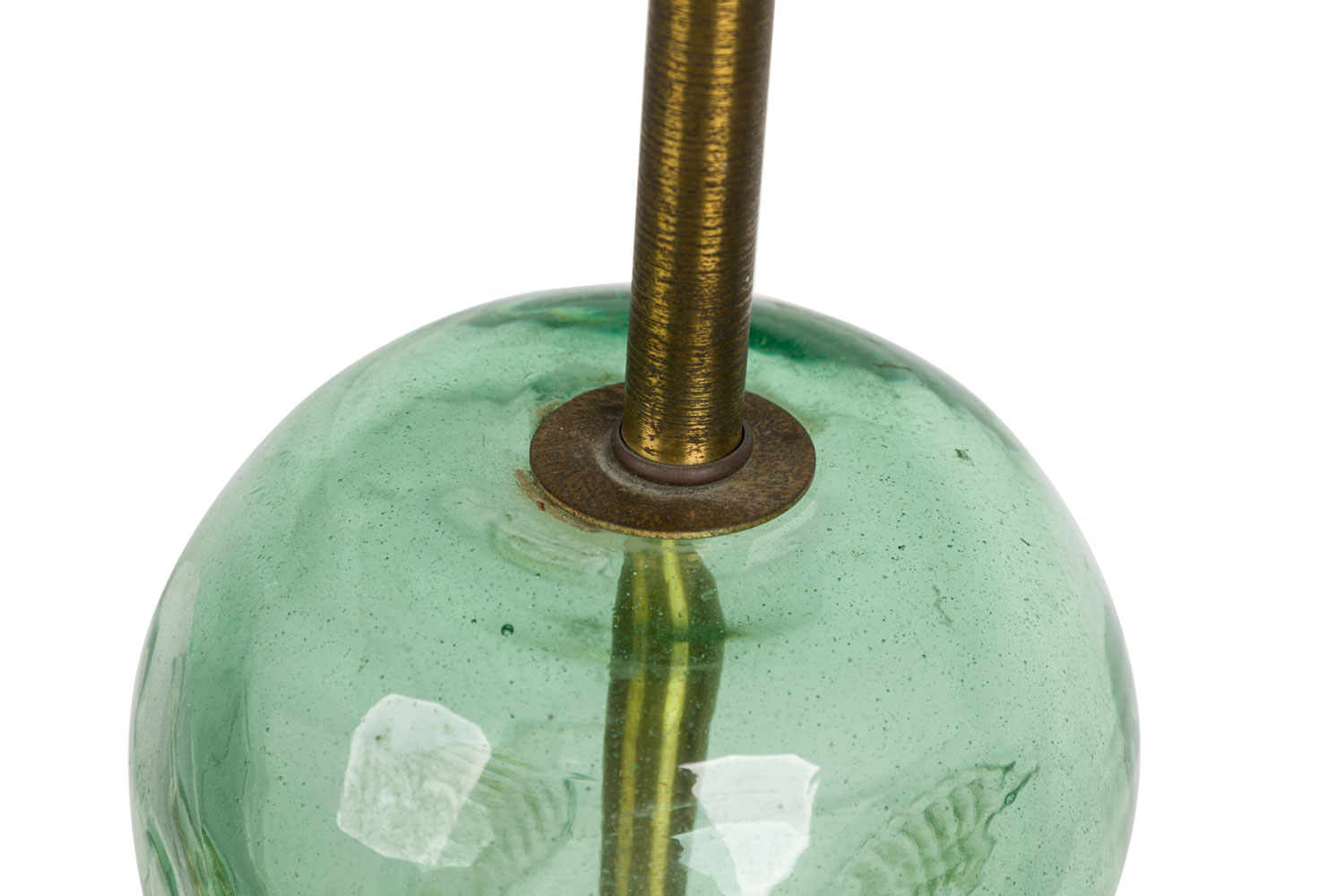Mid-Century Italian Fallen Leaf handblown green glass table lamp in organic gourd form, connected to a brass stem and functioning cupped light switch socket, with an Art Nouveau-styled transparent body featuring an interior all-over leaf pattern. (BAROVIER ET TOSO)(Similar piece: DUL0026).