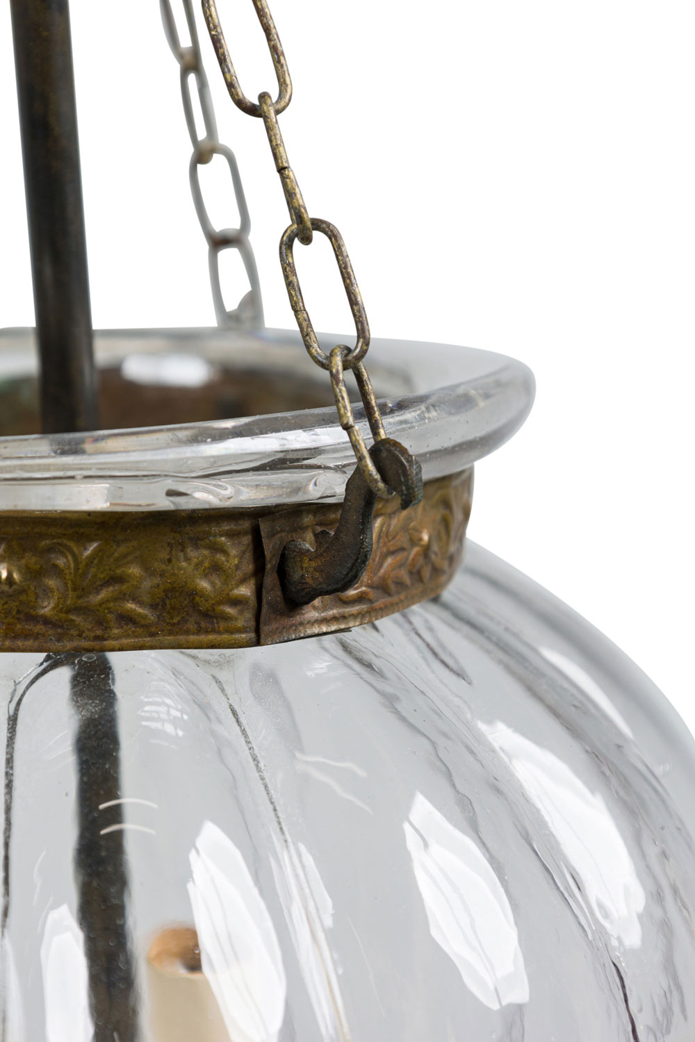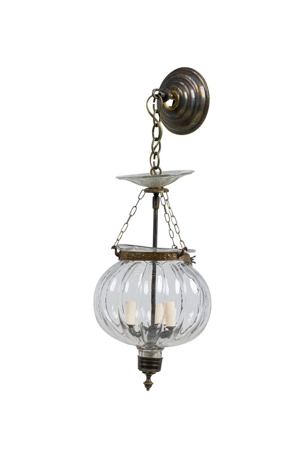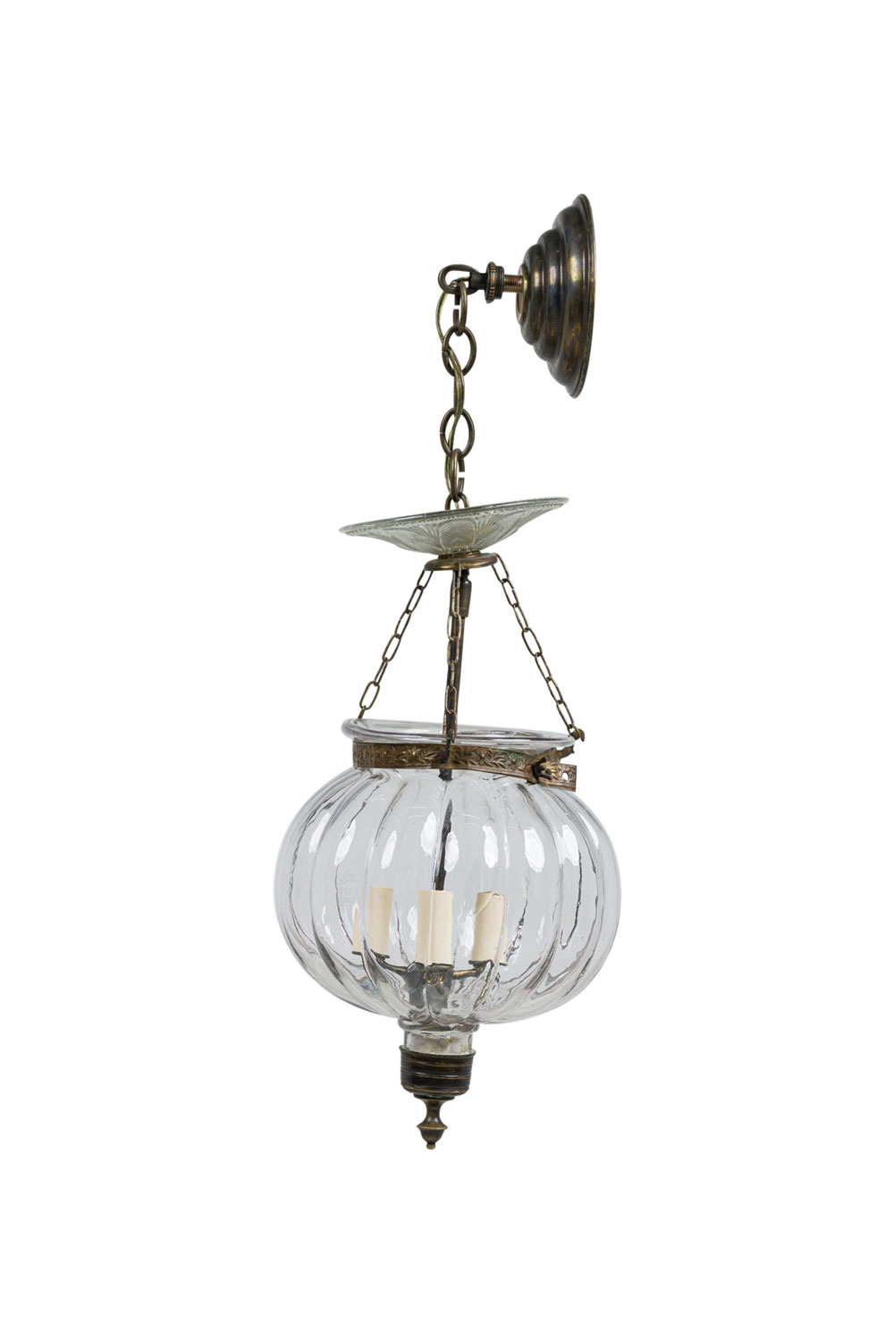 Continental Belgian (20th Century) style bell jar lantern with a fluted pumpkin shaped crystal jar having brass floral and vine repousse bands, a painted bronze stem and metal suspensions with 3 interior lights (Stamped: VAL SAINT LAMBERT)