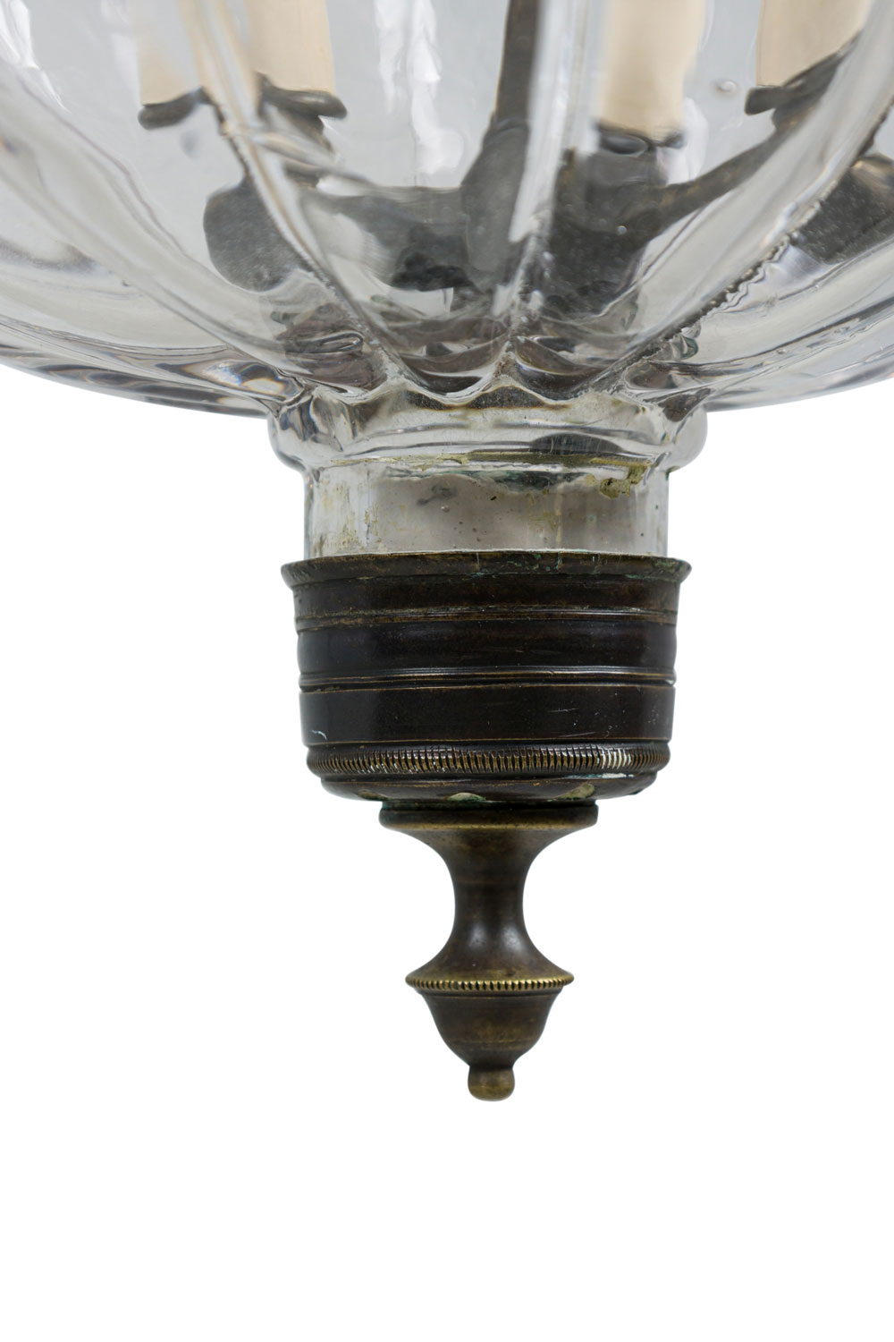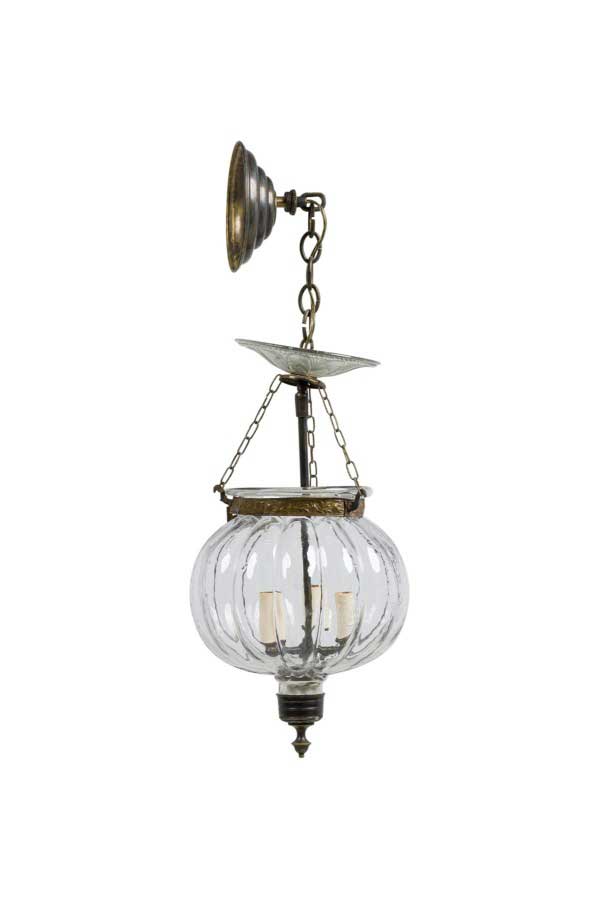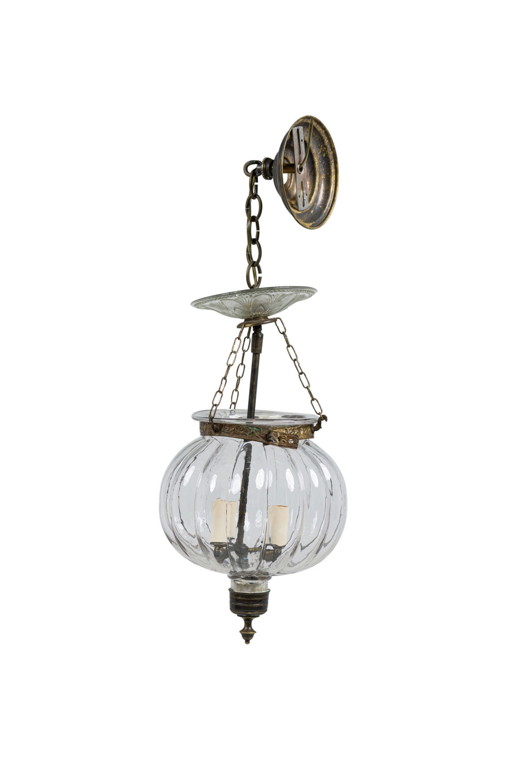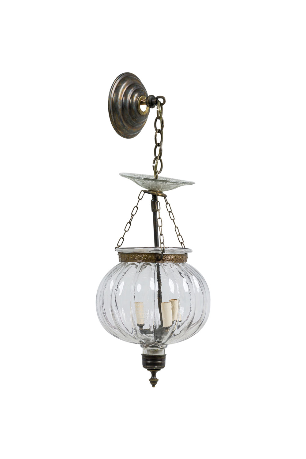 Continental Belgian (20th Century) style bell jar lantern with a fluted pumpkin shaped crystal jar having brass floral and vine repousse bands, a painted bronze stem and metal suspensions with 3 interior lights (Stamped: VAL SAINT LAMBERT)