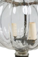 Continental Belgian (20th Century) style bell jar lantern with a fluted pumpkin shaped crystal jar having brass floral and vine repousse bands, a painted bronze stem and metal suspensions with 3 interior lights (Stamped: VAL SAINT LAMBERT).