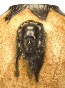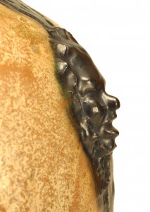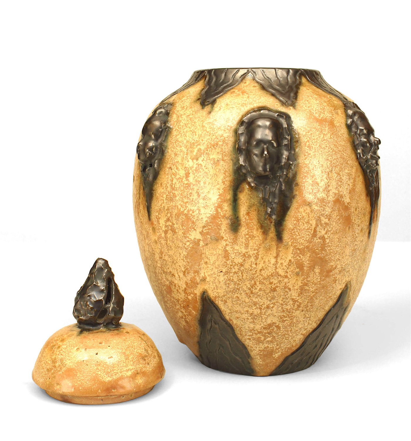 Belgian Arts & Crafts glazed beige porcelain vase with cover having an open black finial and trimmed with black decoration and various heads (signed: S HUBLET, marked 213D).