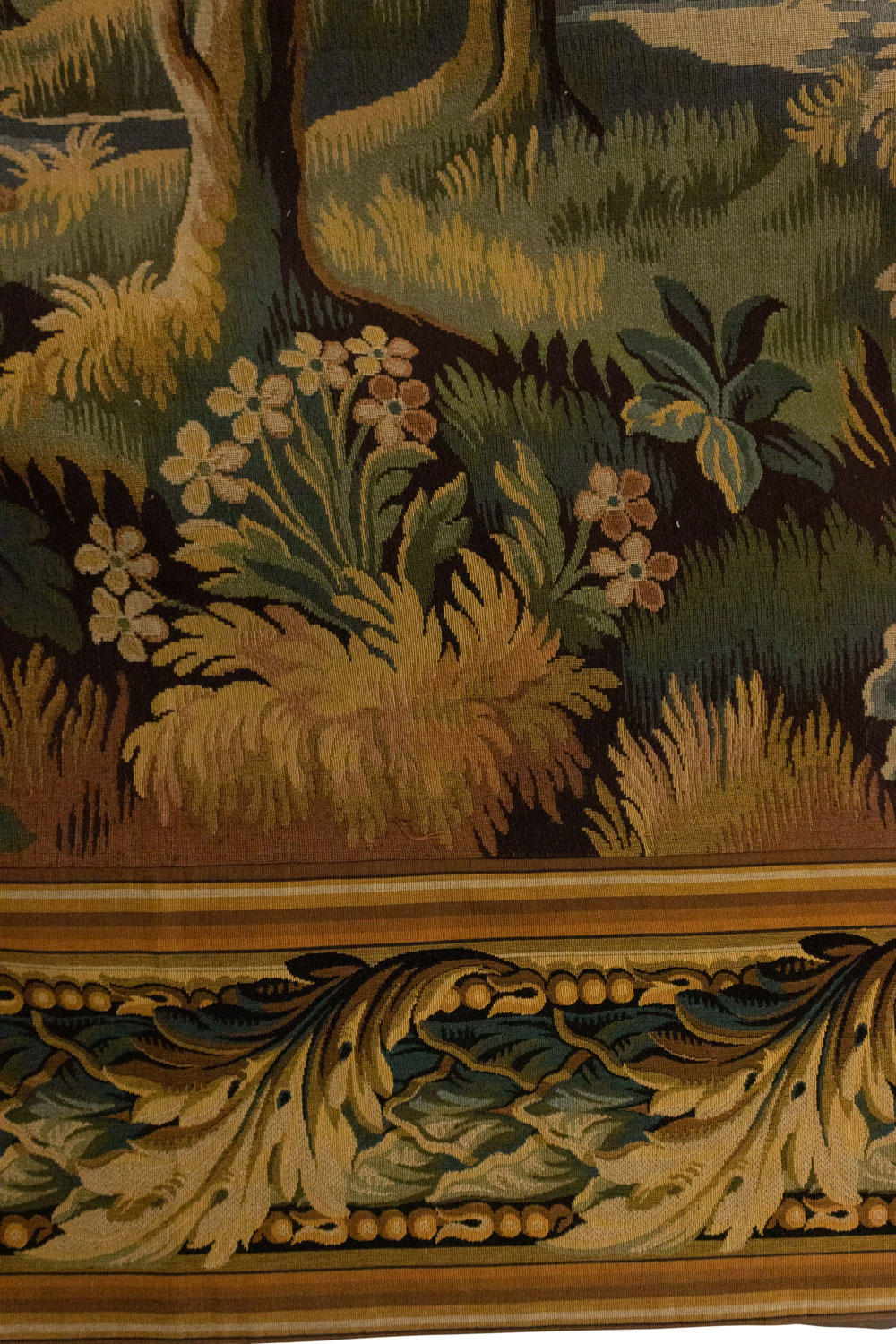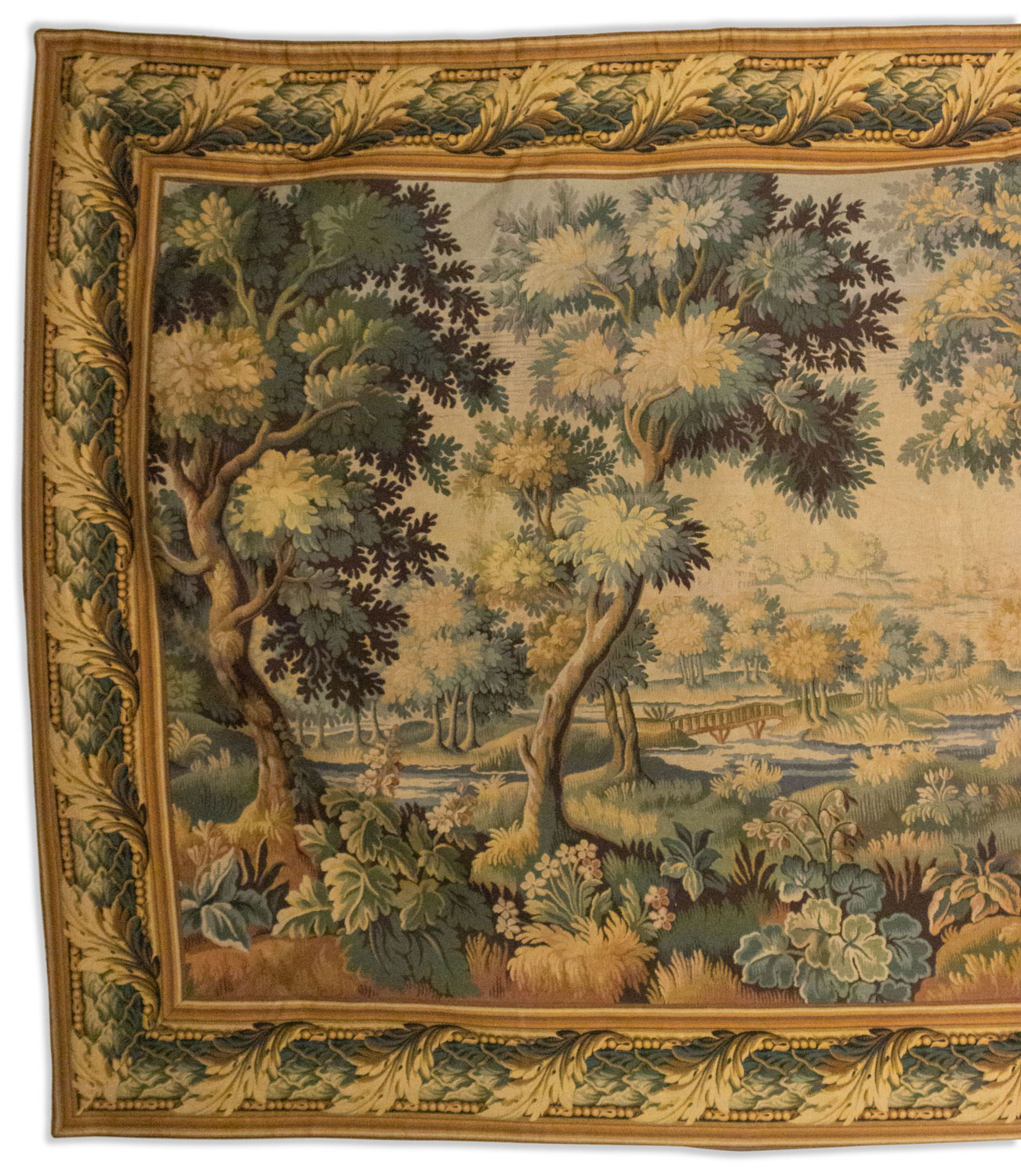 Belgian (20th Century) horizontal tapestry with floral scene with stream and small bridge.