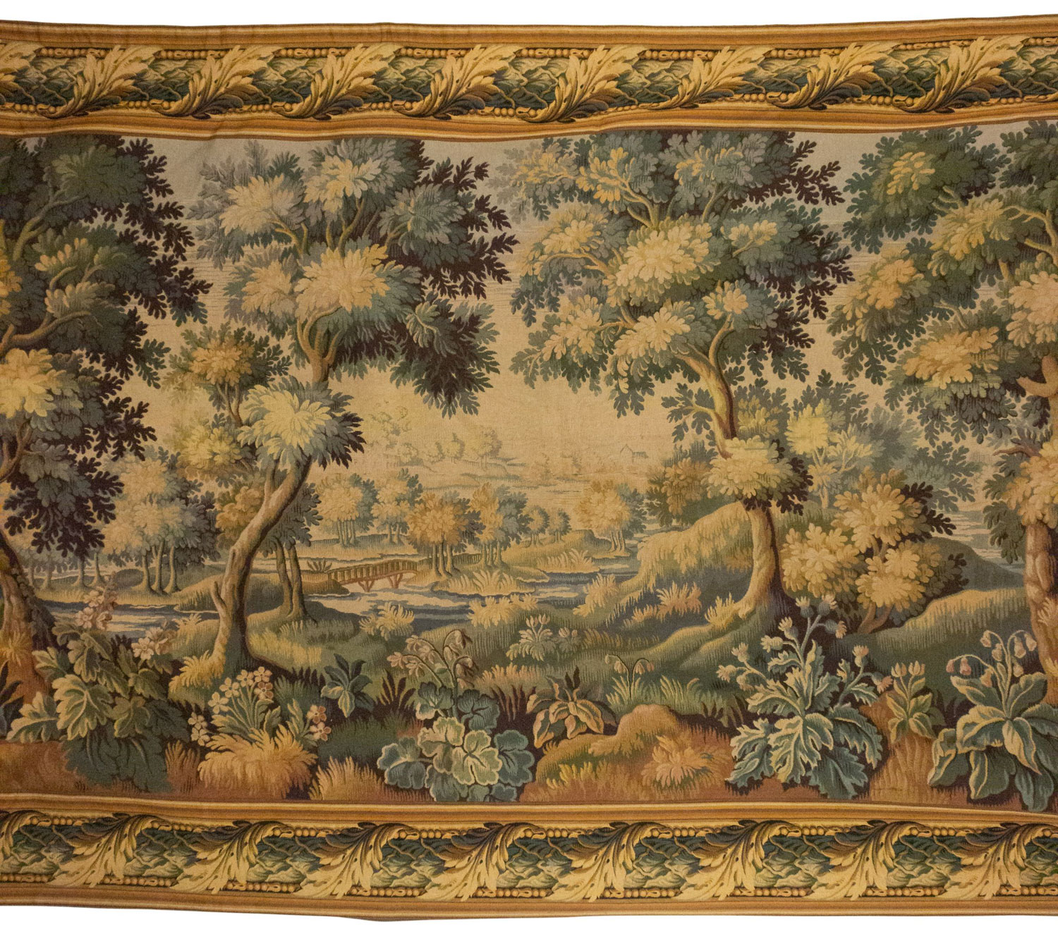 Belgian (20th Century) horizontal tapestry with floral scene with stream and small bridge..