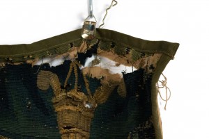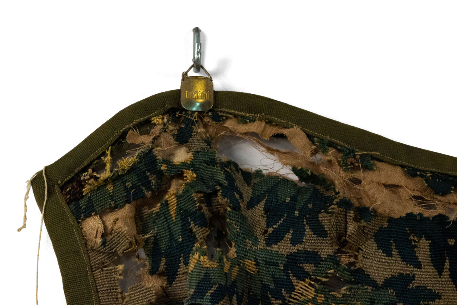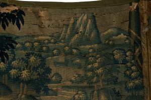 Style: Continental Materials & Techniques: Woven Category: Cleared Art, Rugs/Textile Condition: Antique condition, fading and wear, tears at top along border