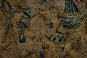 Belgian style (17/18th Century) vertical figurative woven tapestry depicting a crowd in the distance and two soldiers and a horse in the foreground.