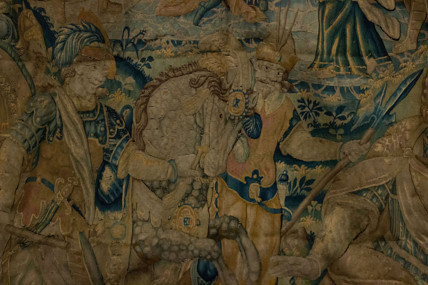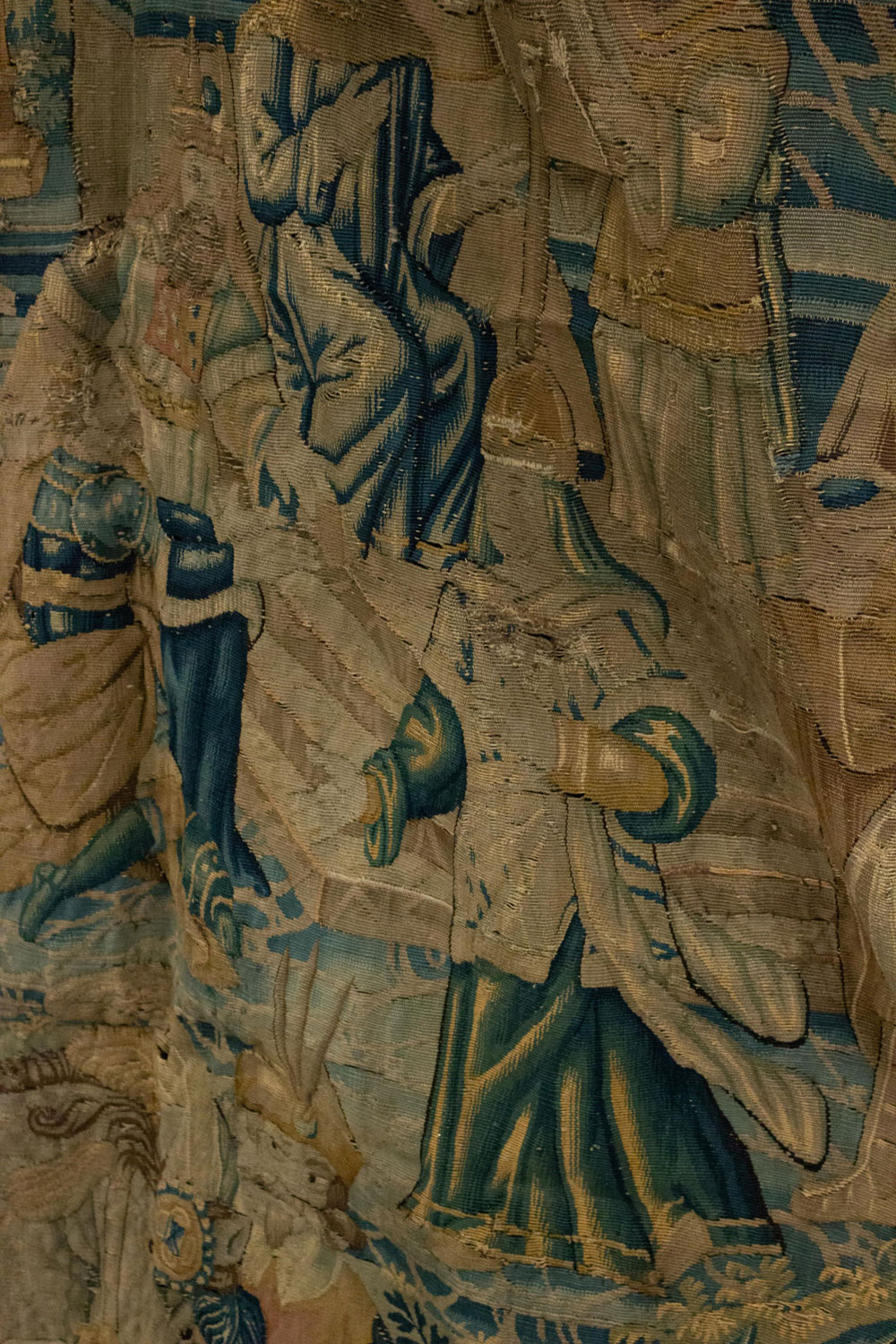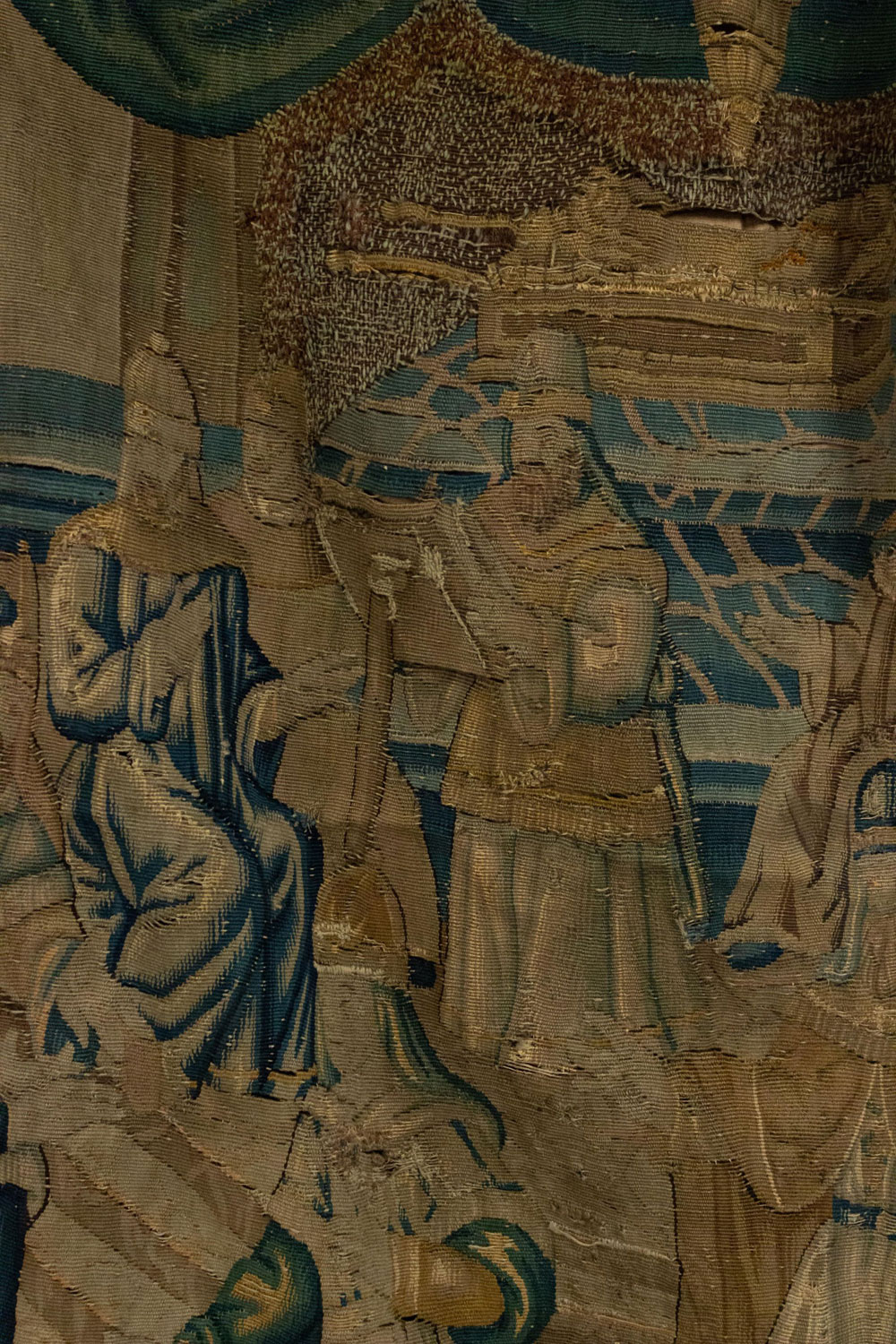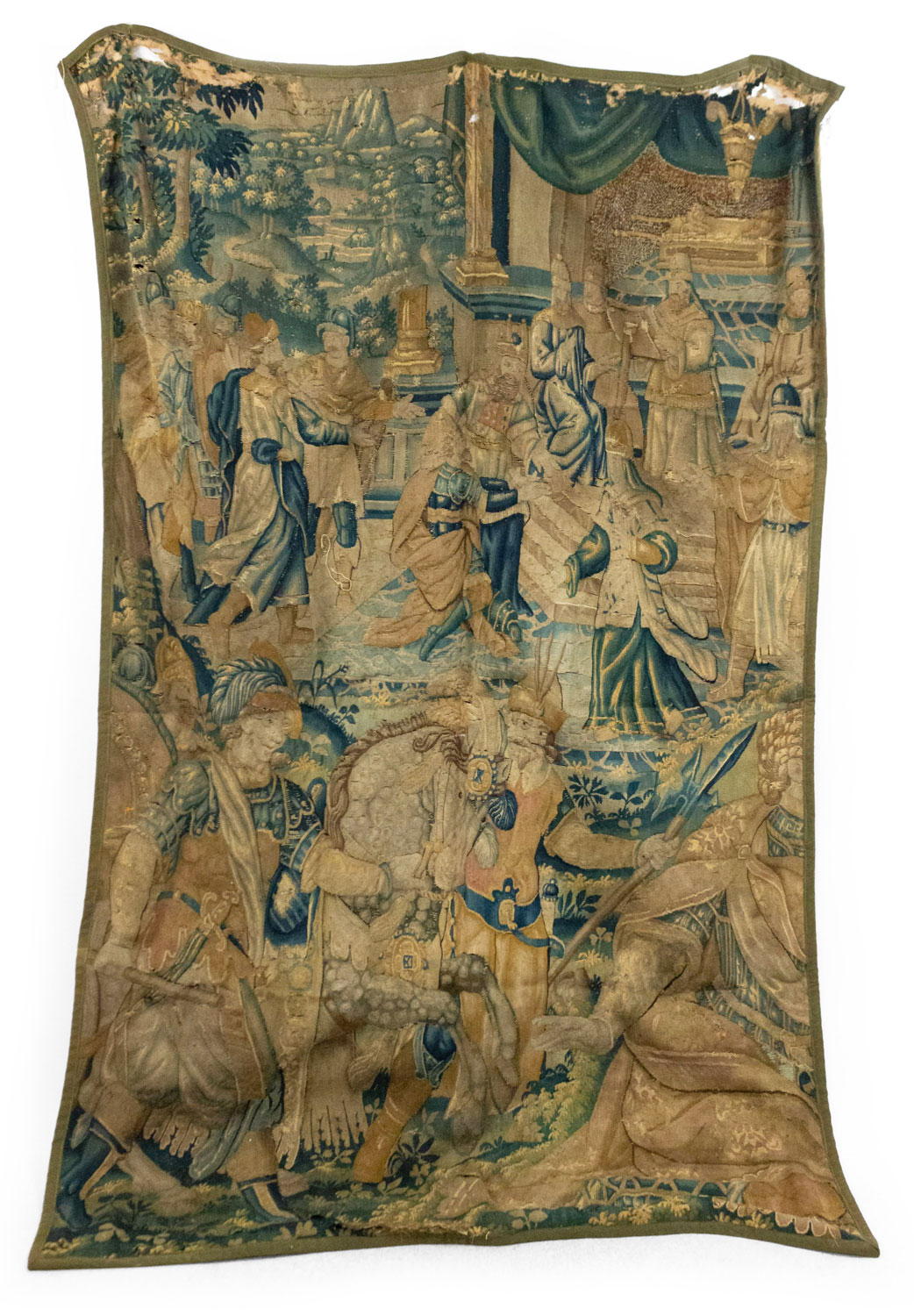 Belgian style (17/18th Century) vertical figurative woven tapestry depicting a crowd in the distance and two soldiers and a horse in the foreground..