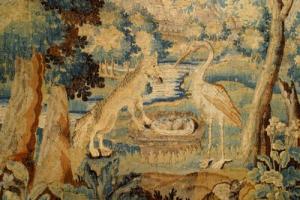 Belgian style (17th Century) horizontal Aubusson style tapestry of crane and fox in landscape with border (prior in collection of the Cincinnati Museum of Art).
