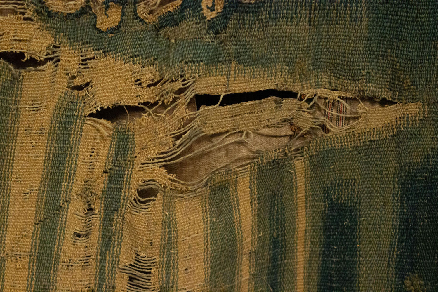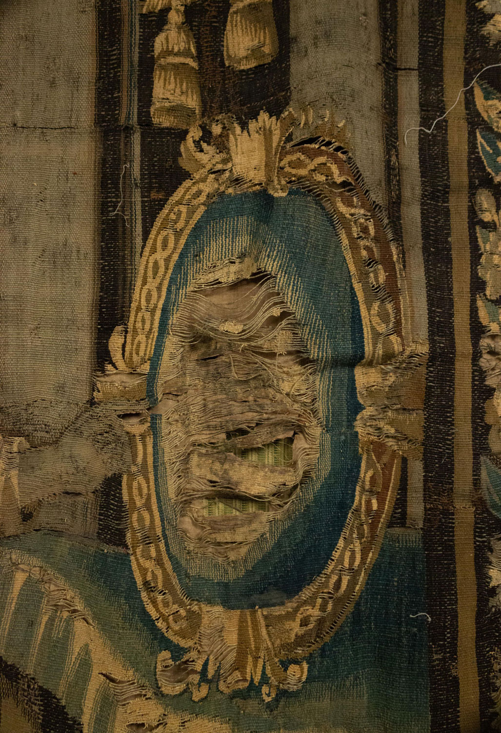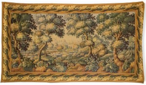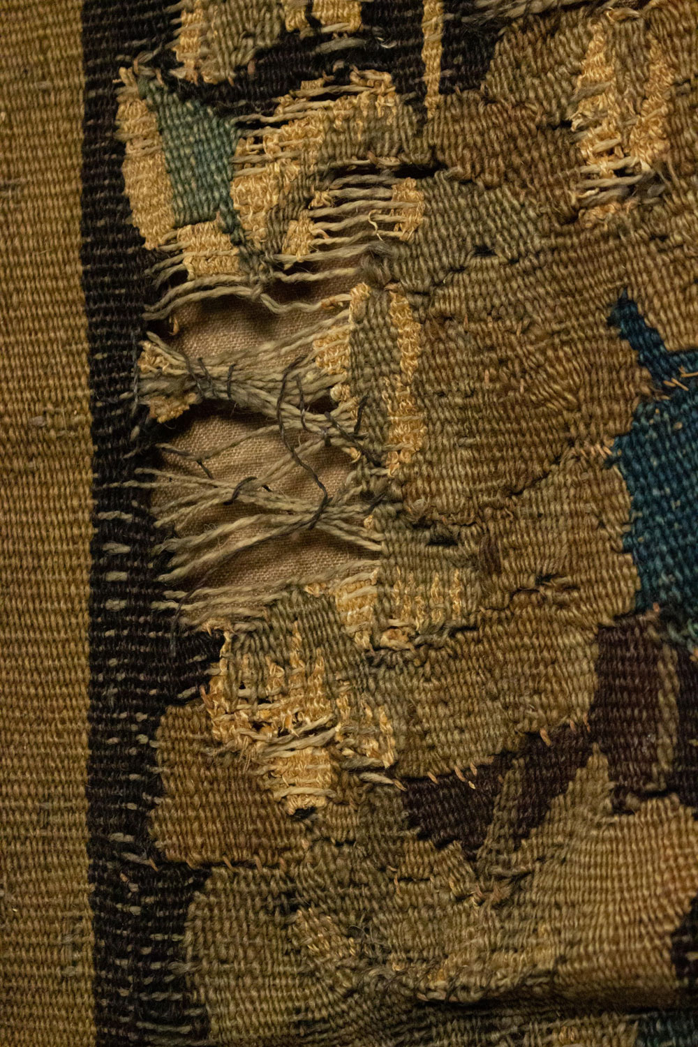 Style: Continental Materials & Techniques: Woven Category: Cleared Art, Rugs/Textile Condition: Tears in the tapestry. Hangs from a piece of wood on the top.