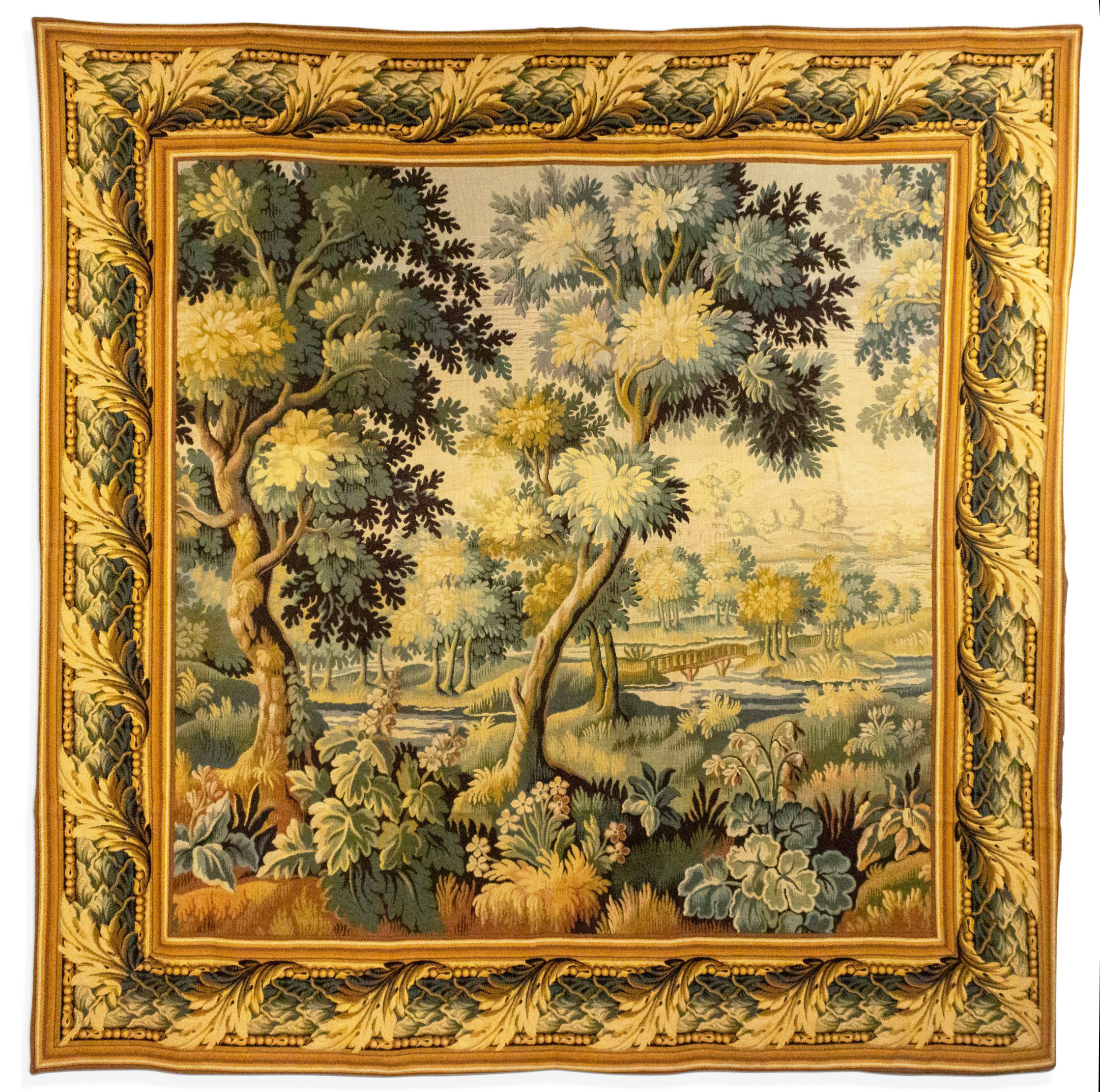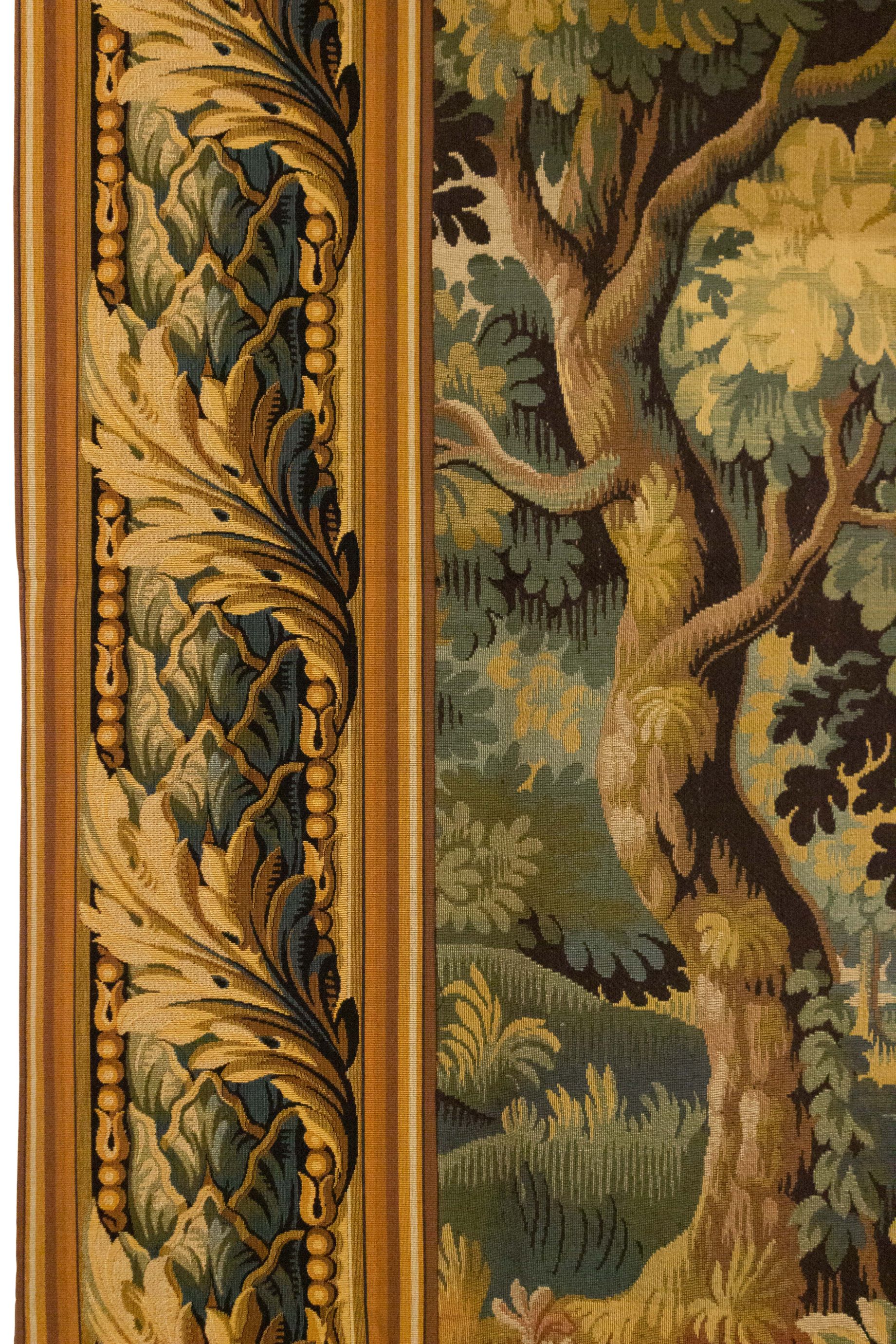 Belgian style (20th Century) woven tapestry of forest scene with floral border..