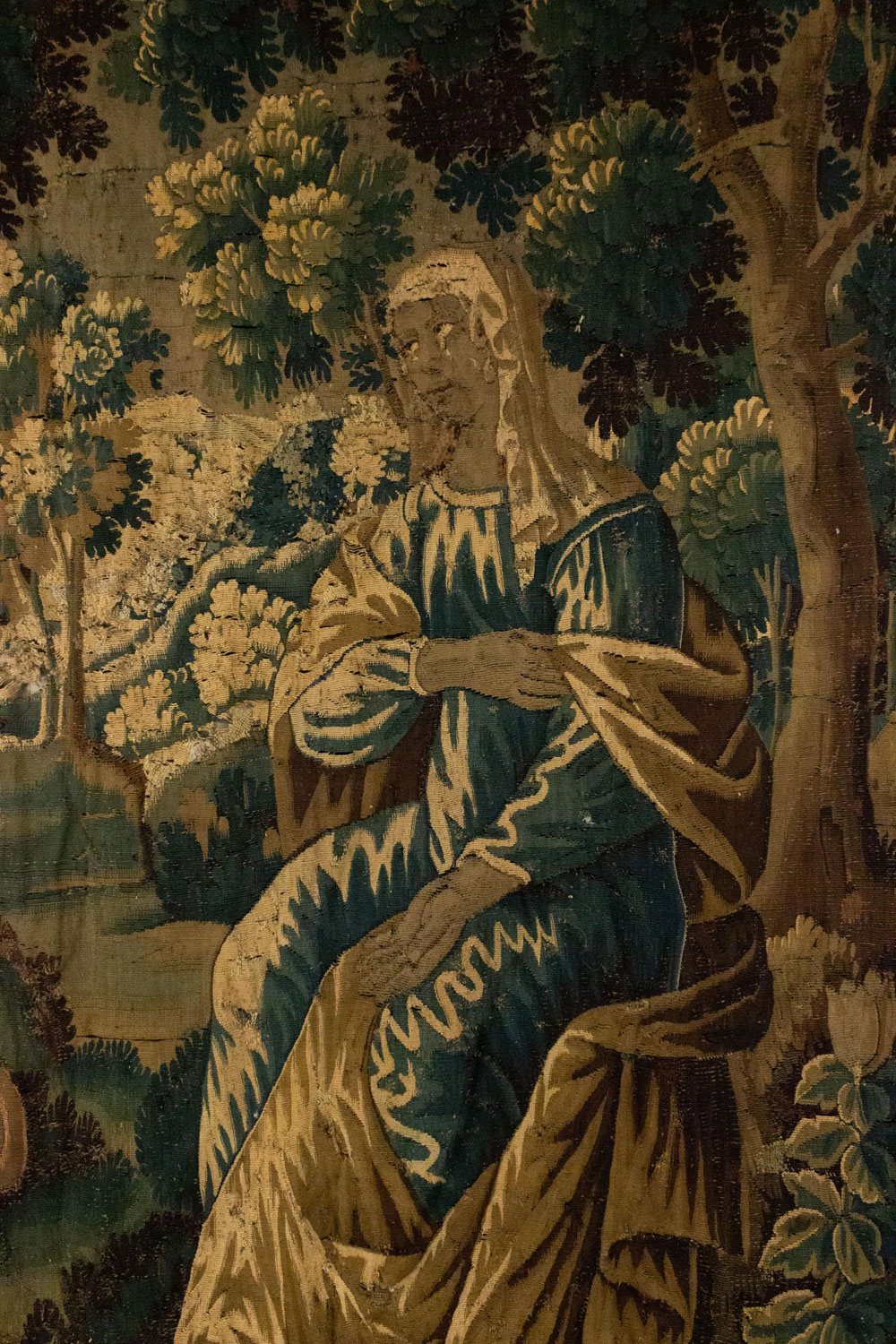 Belgian (17th Century) horizontal woven tapestry of a pastoral scene of an angel visiting a woman and child in forest surrounded by a floral border..