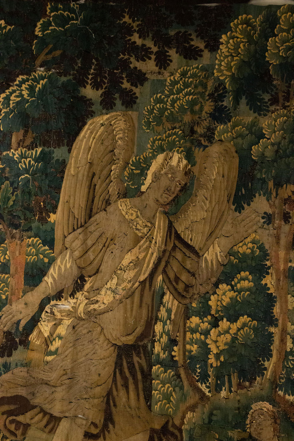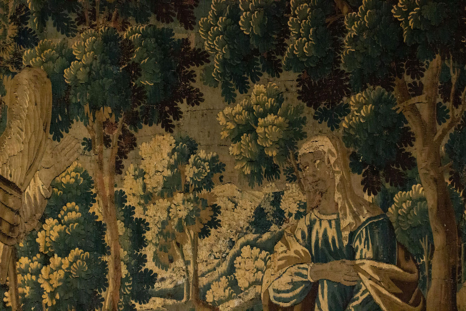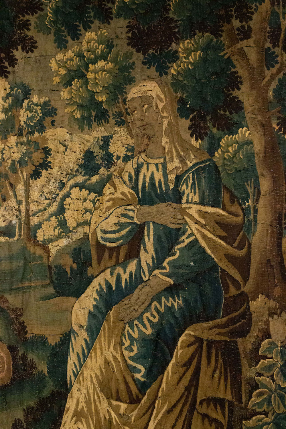Belgian (17th Century) horizontal woven tapestry of a pastoral scene of an angel visiting a woman and child in forest surrounded by a floral border.