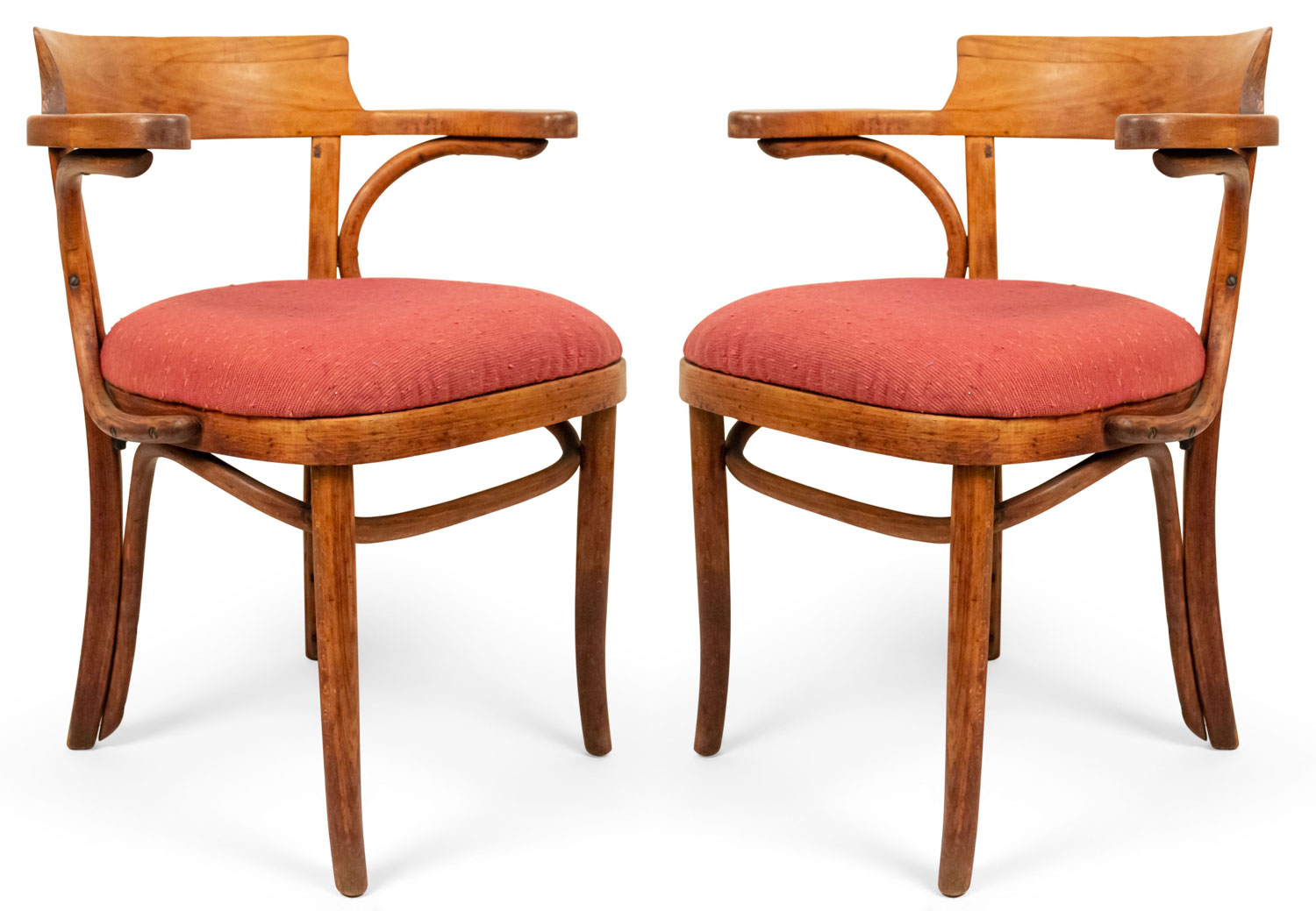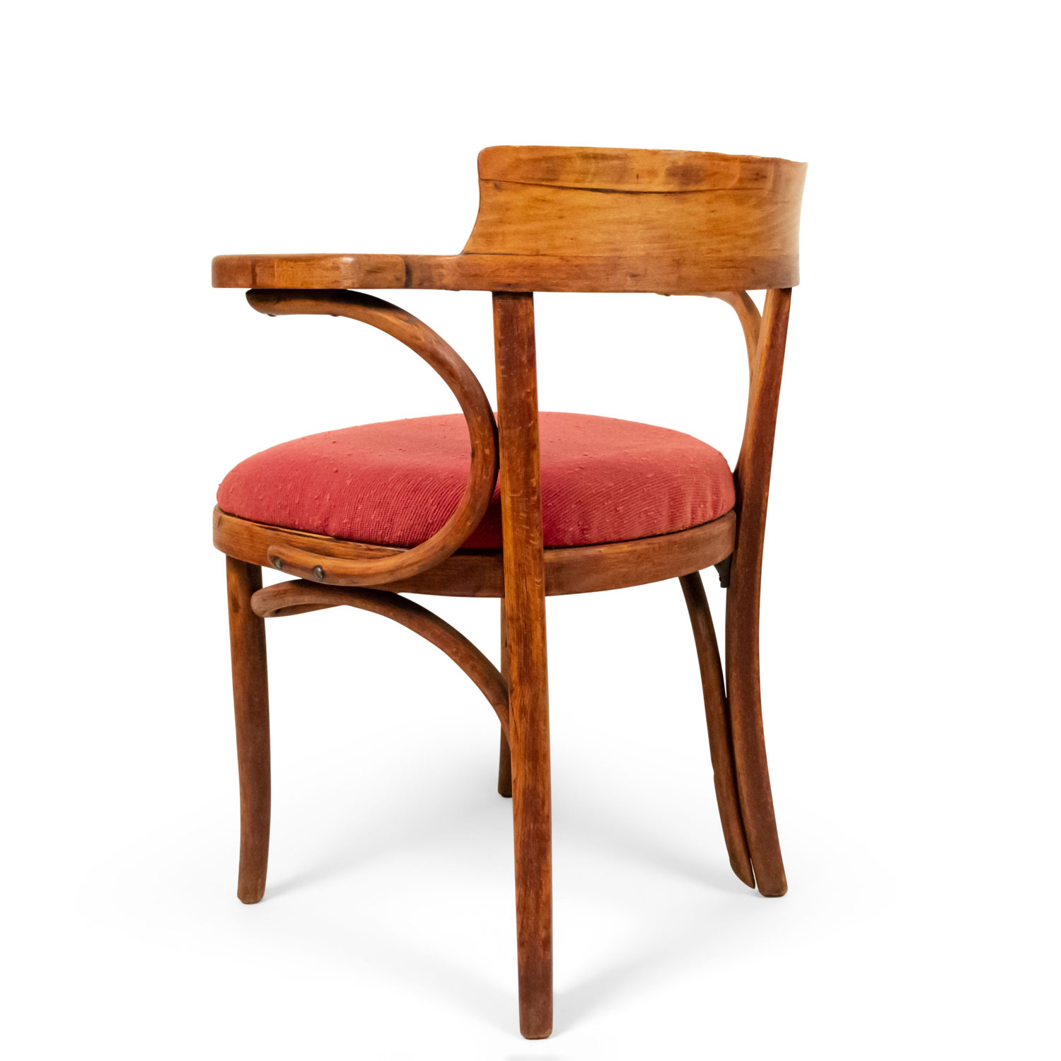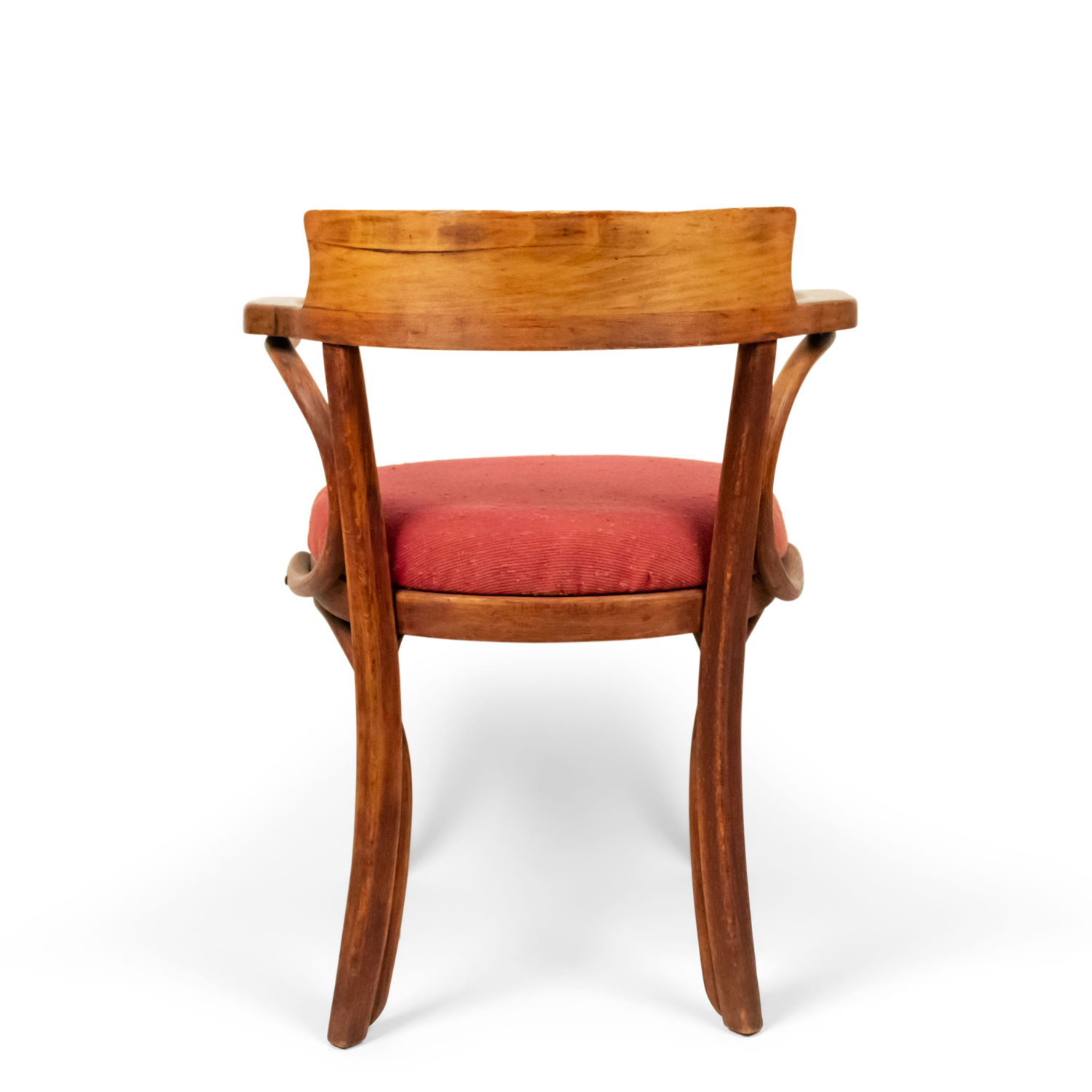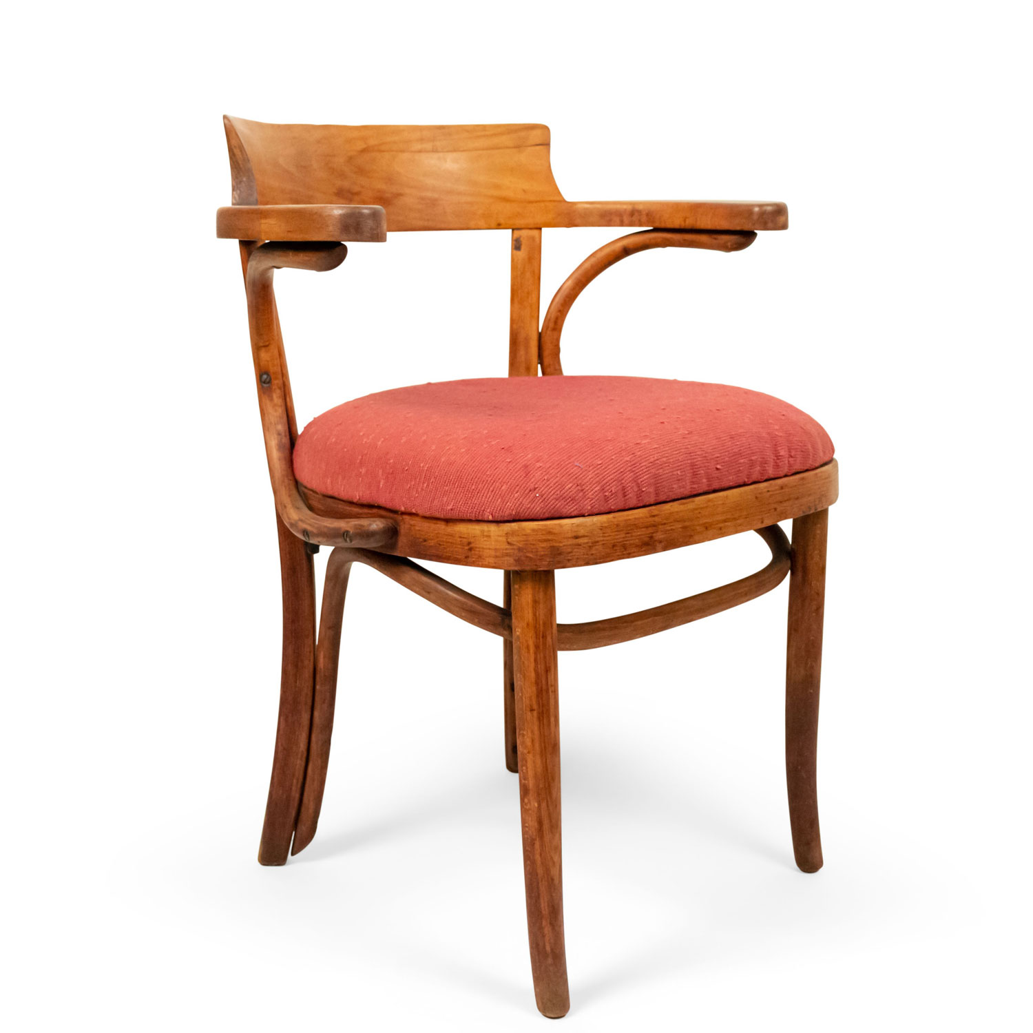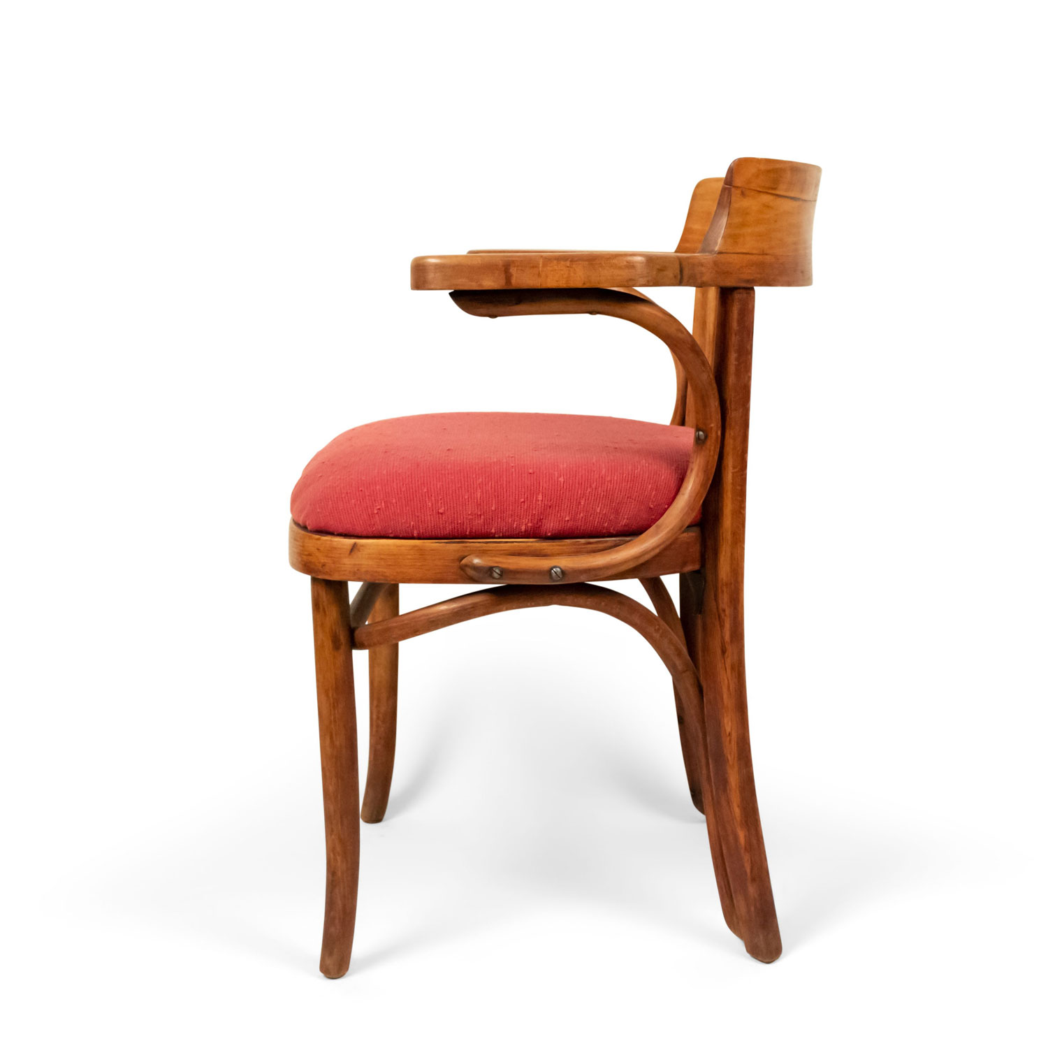 4 Bentwood (1st qtr 20th Cent) stripped pine and poplar wood round back captains chairs with red seat with label "Made in Poland. (PRICED EACH)