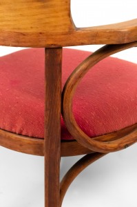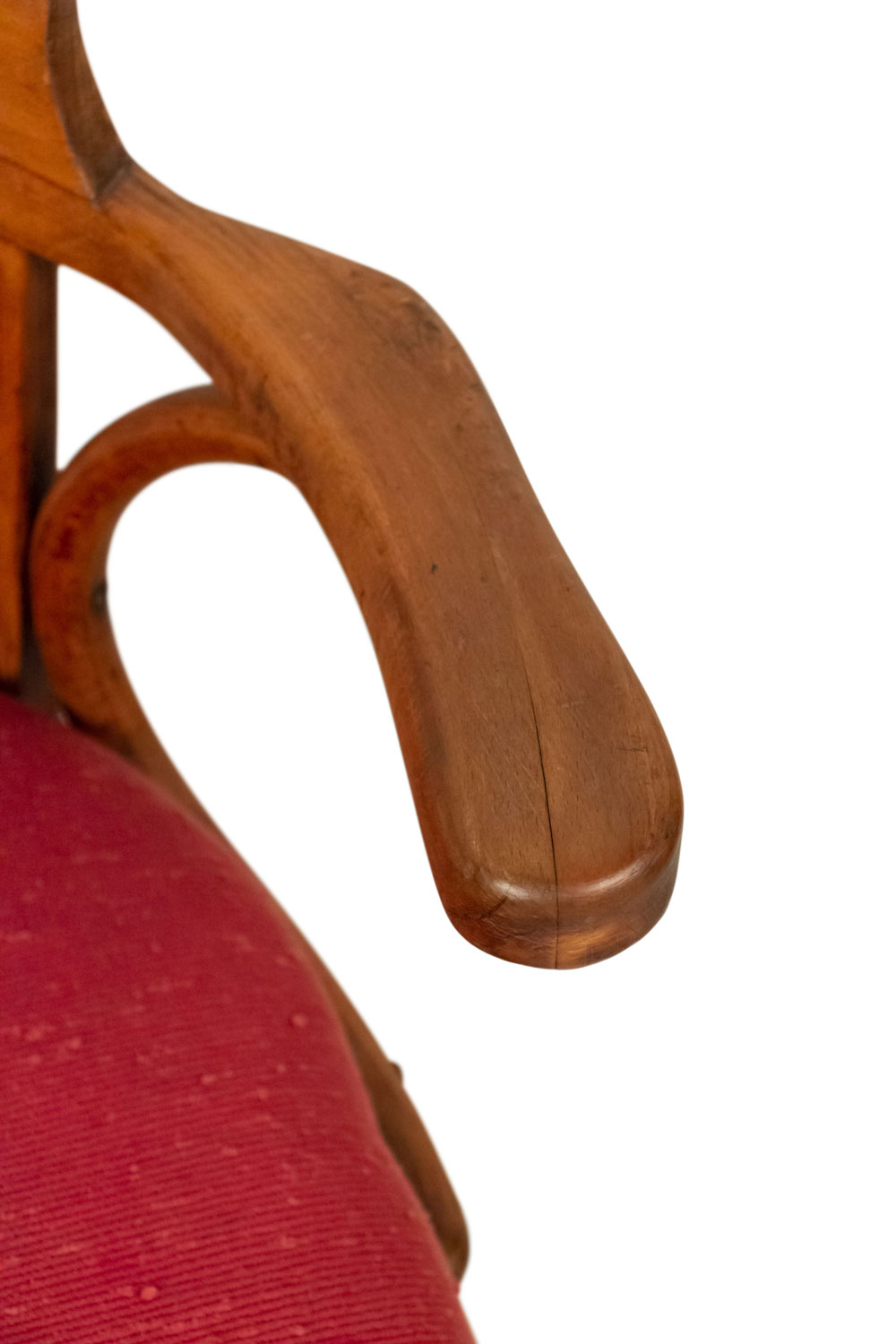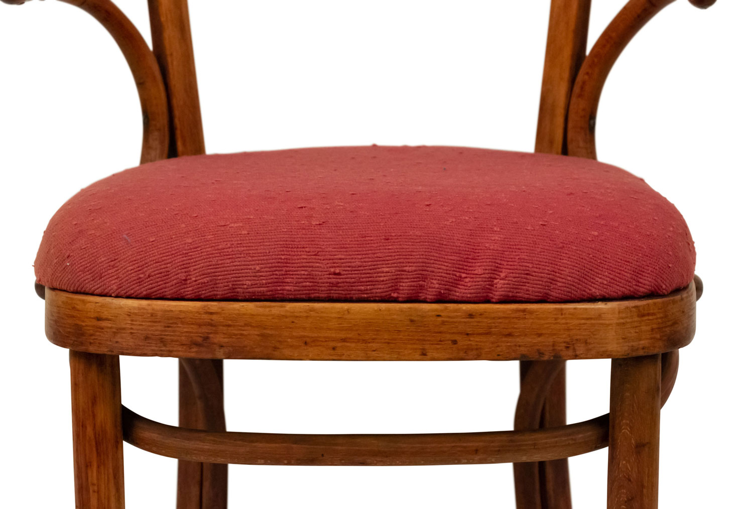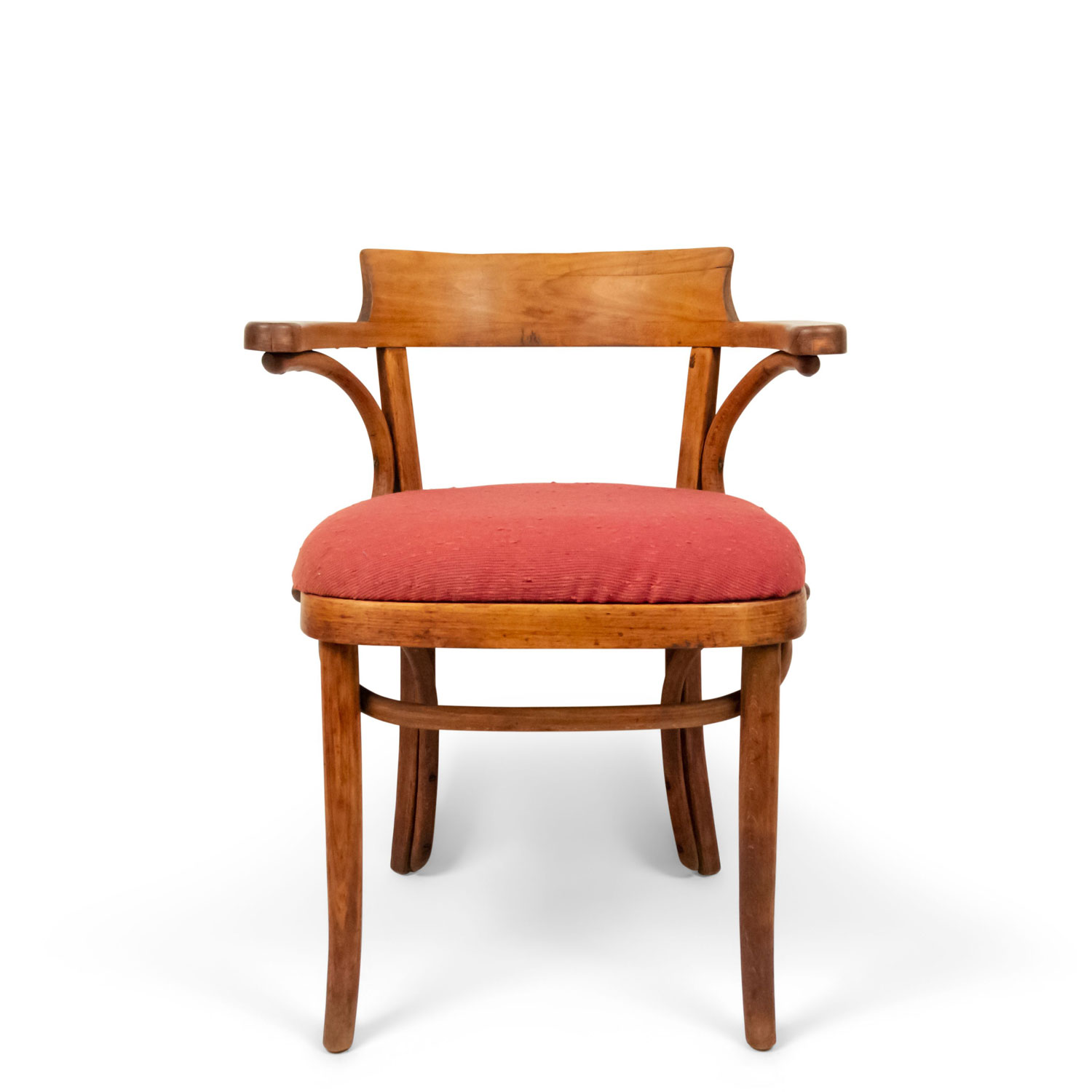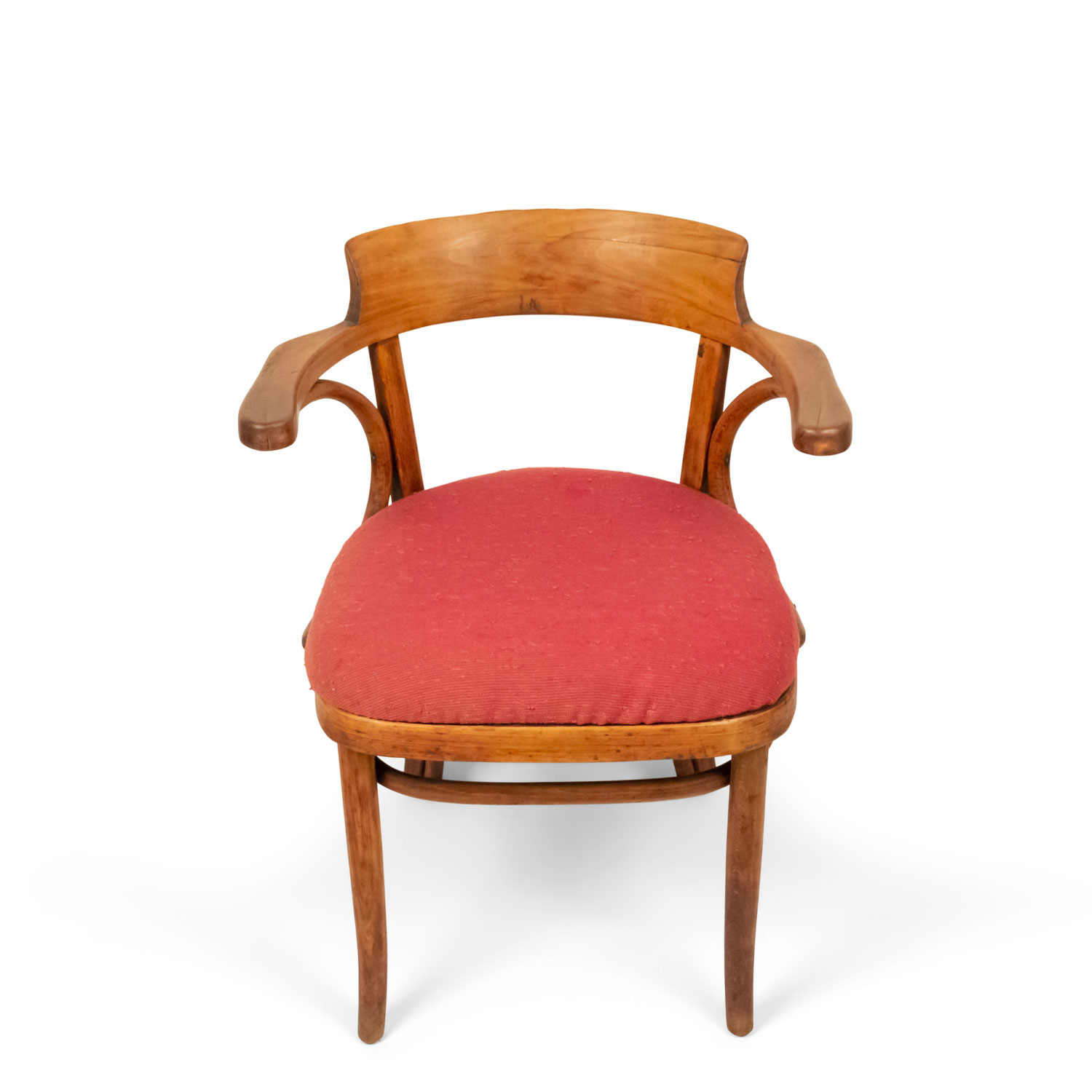 4 Bentwood (1st qtr 20th Cent) stripped pine and poplar wood round back captains chairs with red seat with label "Made in Poland. (PRICED EACH)