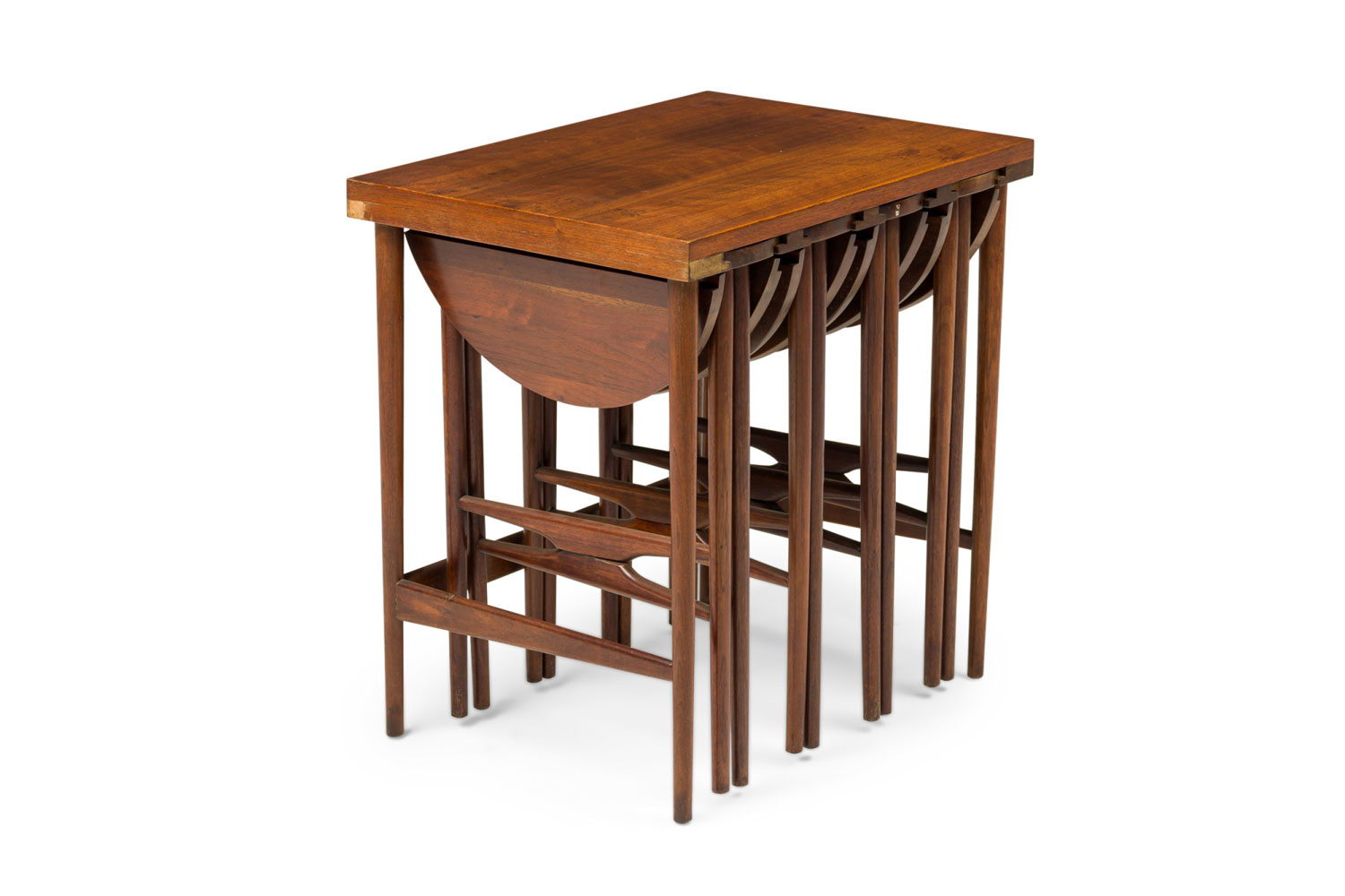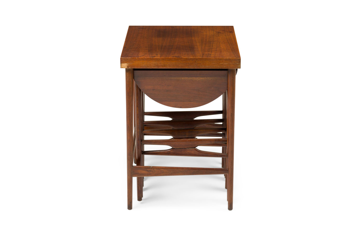 American Mid-Century Walnut Nest of 4 Occasional Tables each having drop leaf oval sides (BERTHA SCHAEFOR FOR M. SINGER & SON)