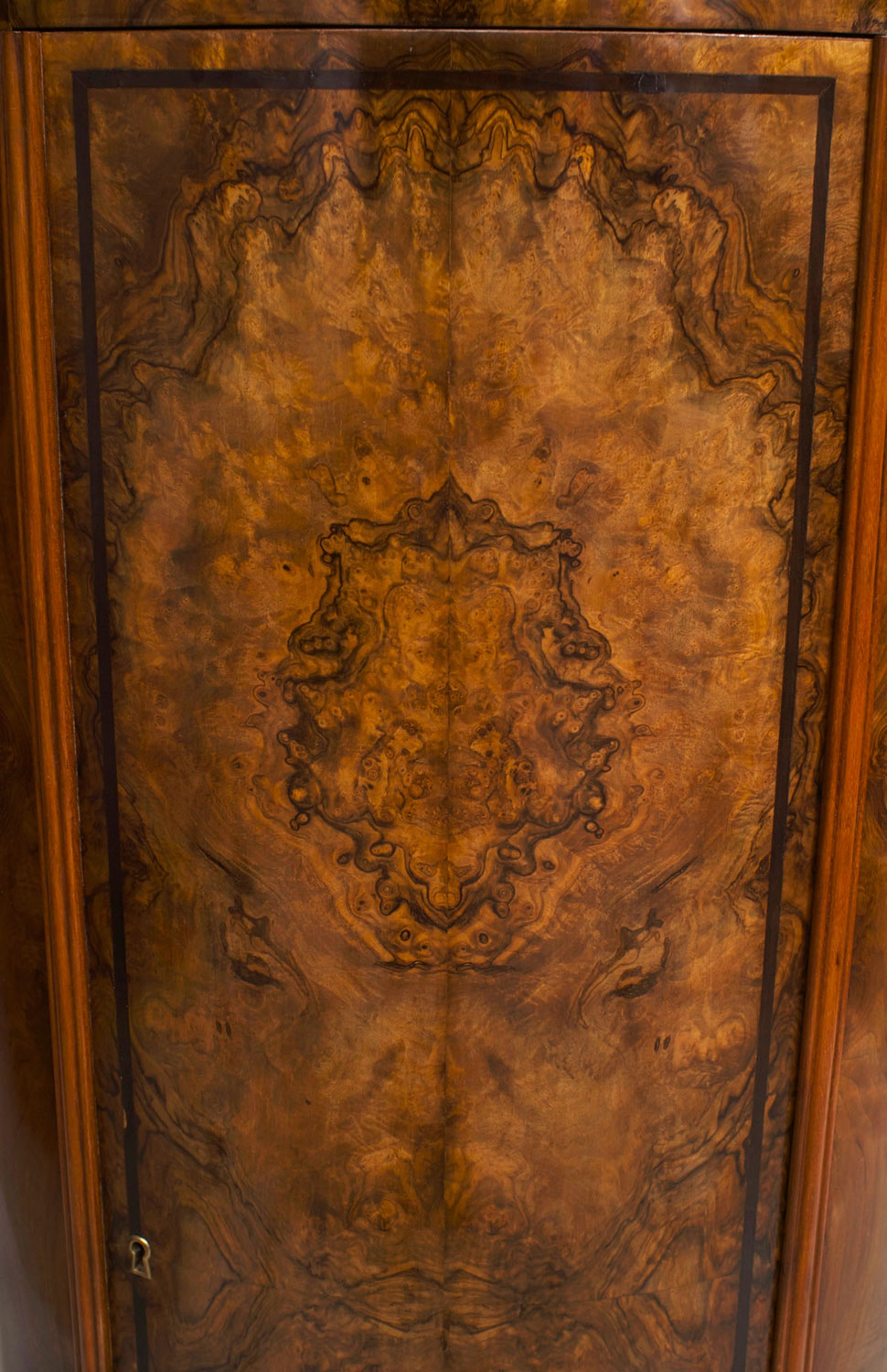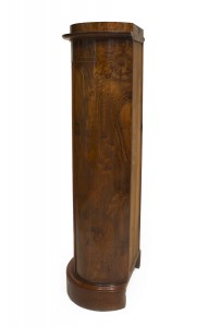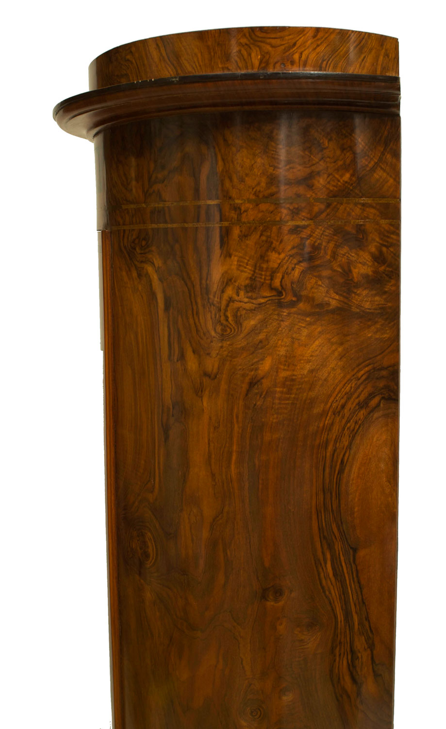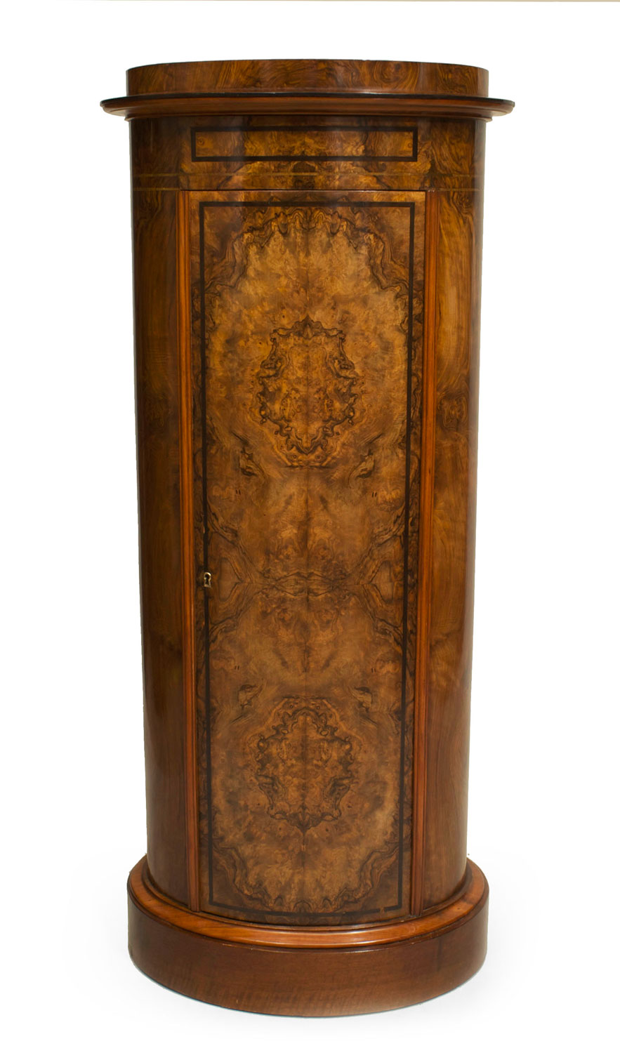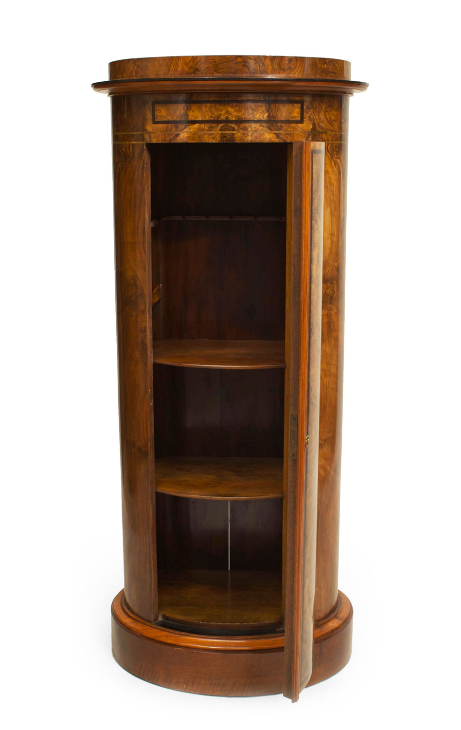 Biedermeier Austrian/German (19th Century) burl walnut tall oval shaped pedestal cabinet with a large single front door and ebonized banded trim..