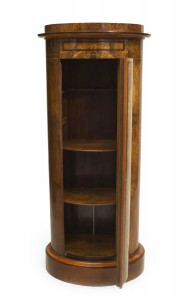 Biedermeier Austrian/German (19th Century) burl walnut tall oval shaped pedestal cabinet with a large single front door and ebonized banded trim.