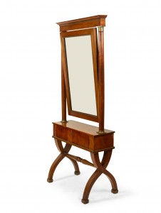 Style: Biedermeier Materials & Techniques: Cherry, cherrywood, wood Category: Mirrors, Bedroom Condition: Minor chip to veneer on the back left side, condition of mirror surface consistent with the age of the piece.