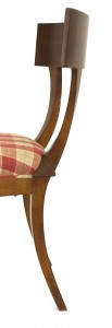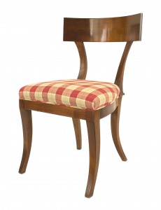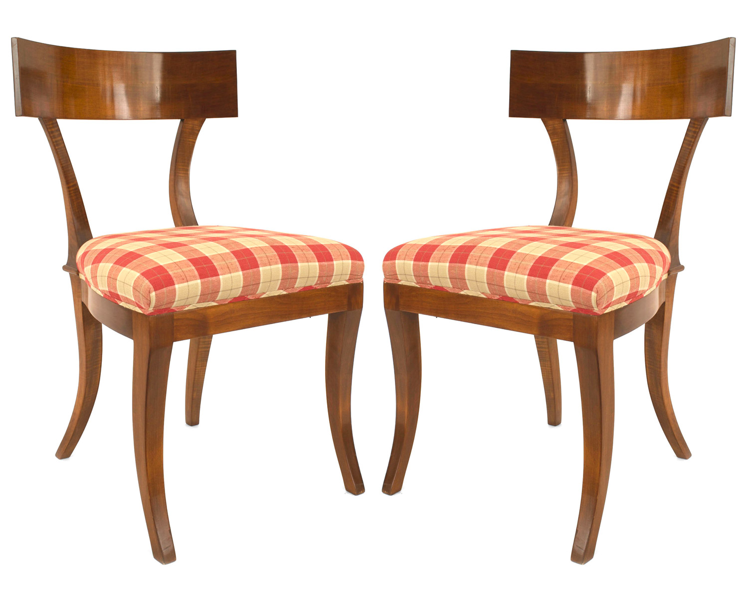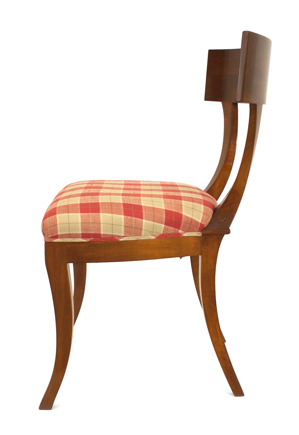 SET of 12 Biedermeier style "Klismo" cherry wood round back side chairs with splayed form legs and a red and white plaid upholstered seat. (4 old/8 copies).