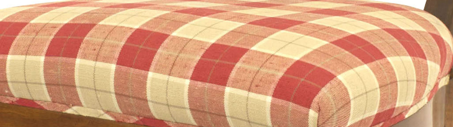 SET of 12 Biedermeier style "Klismo" cherry wood round back side chairs with splayed form legs and a red and white plaid upholstered seat. (4 old/8 copies)