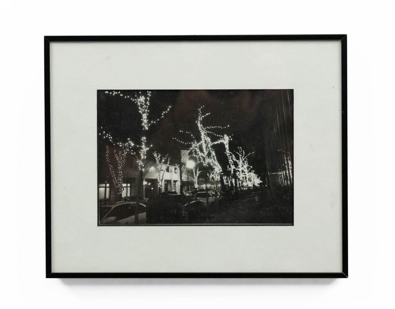 Black and white photograph in a black frame of a street scene with festive lights strung in trees. Photography by Shelley Harrison..