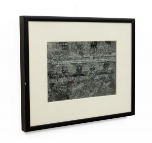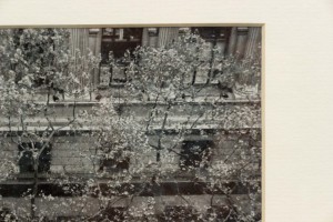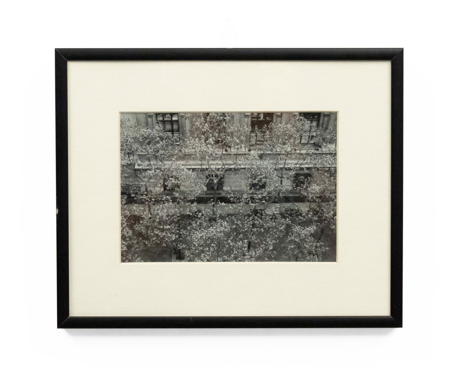 Black and white photograph in a black frame of a streetscape with flowering trees. Photograph by Shelley Harrison.