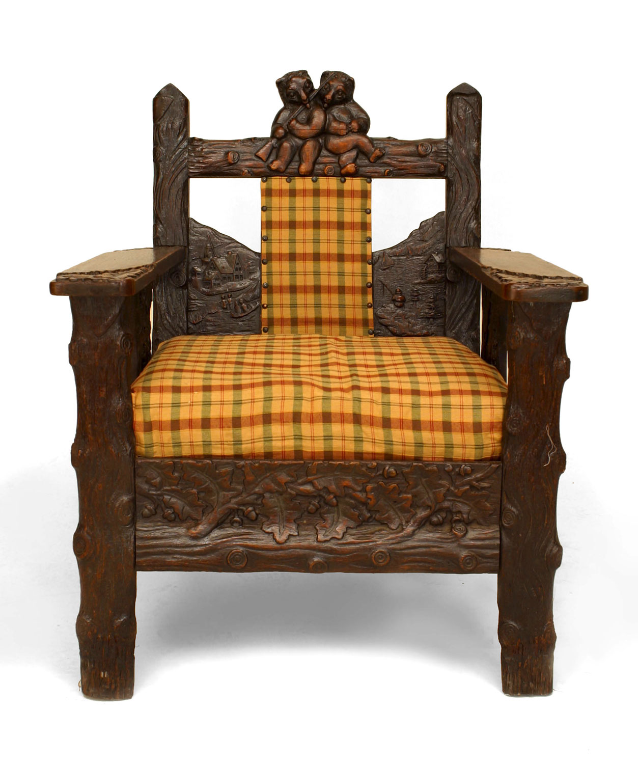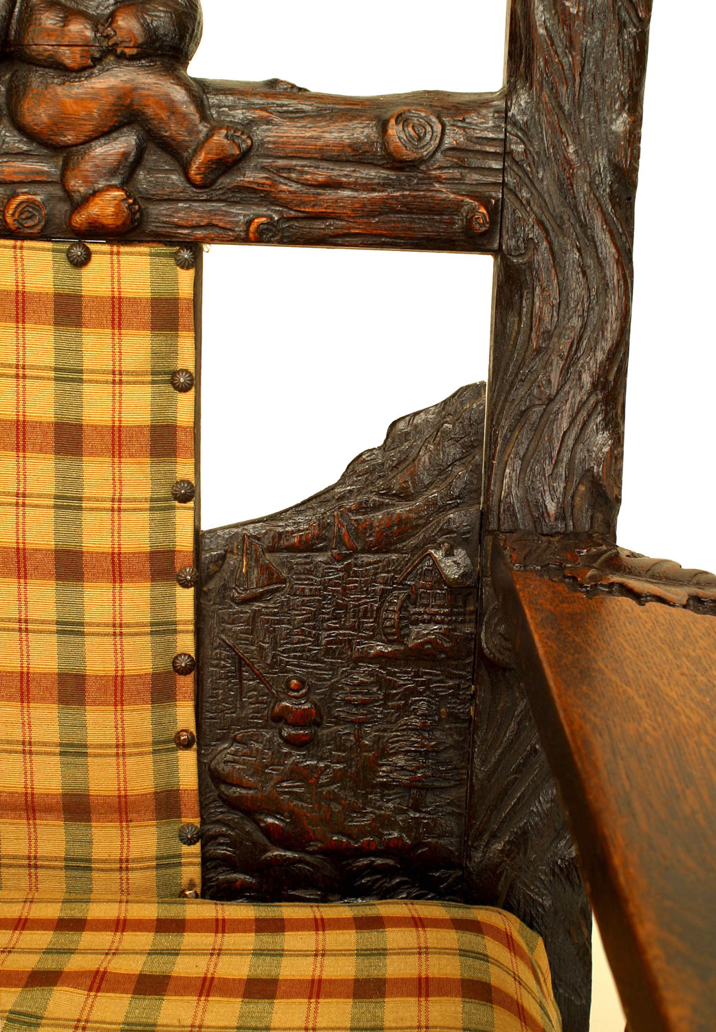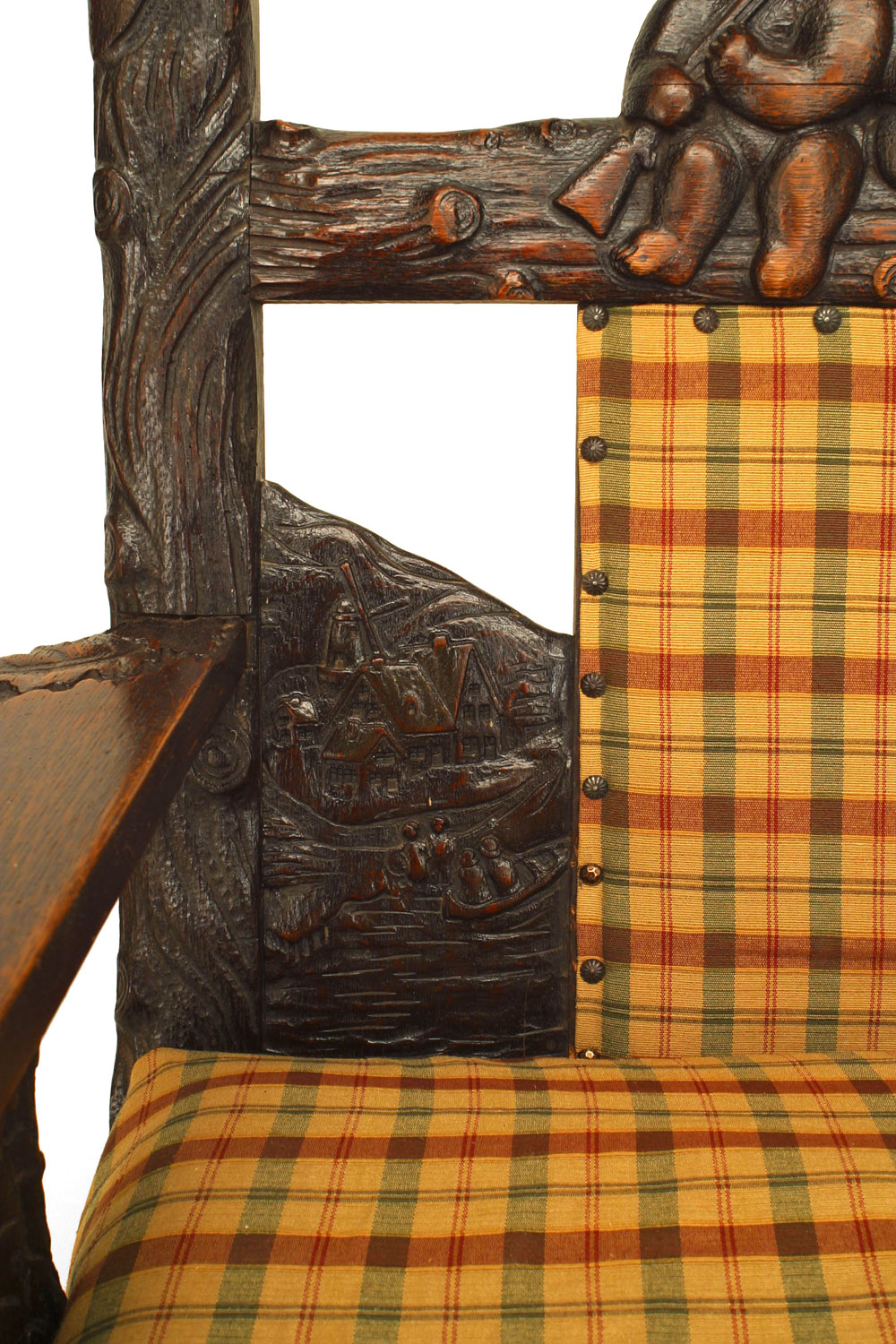 Rustic Black Forest style (19/20th Cent) oak arm chair with 2 carved bears on top of back along with country scenes & oak leaves in relief with an upholstered seat & back panel.