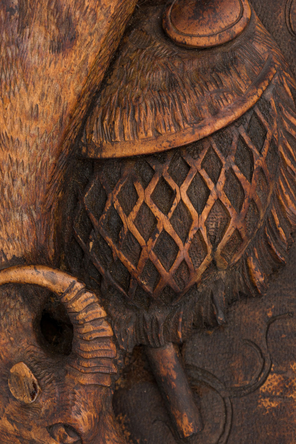 Black Forest-style carved wooden wall plaque featuring a game motif of a ram, pheasant, gun, and satchell with bordering oak leaves..