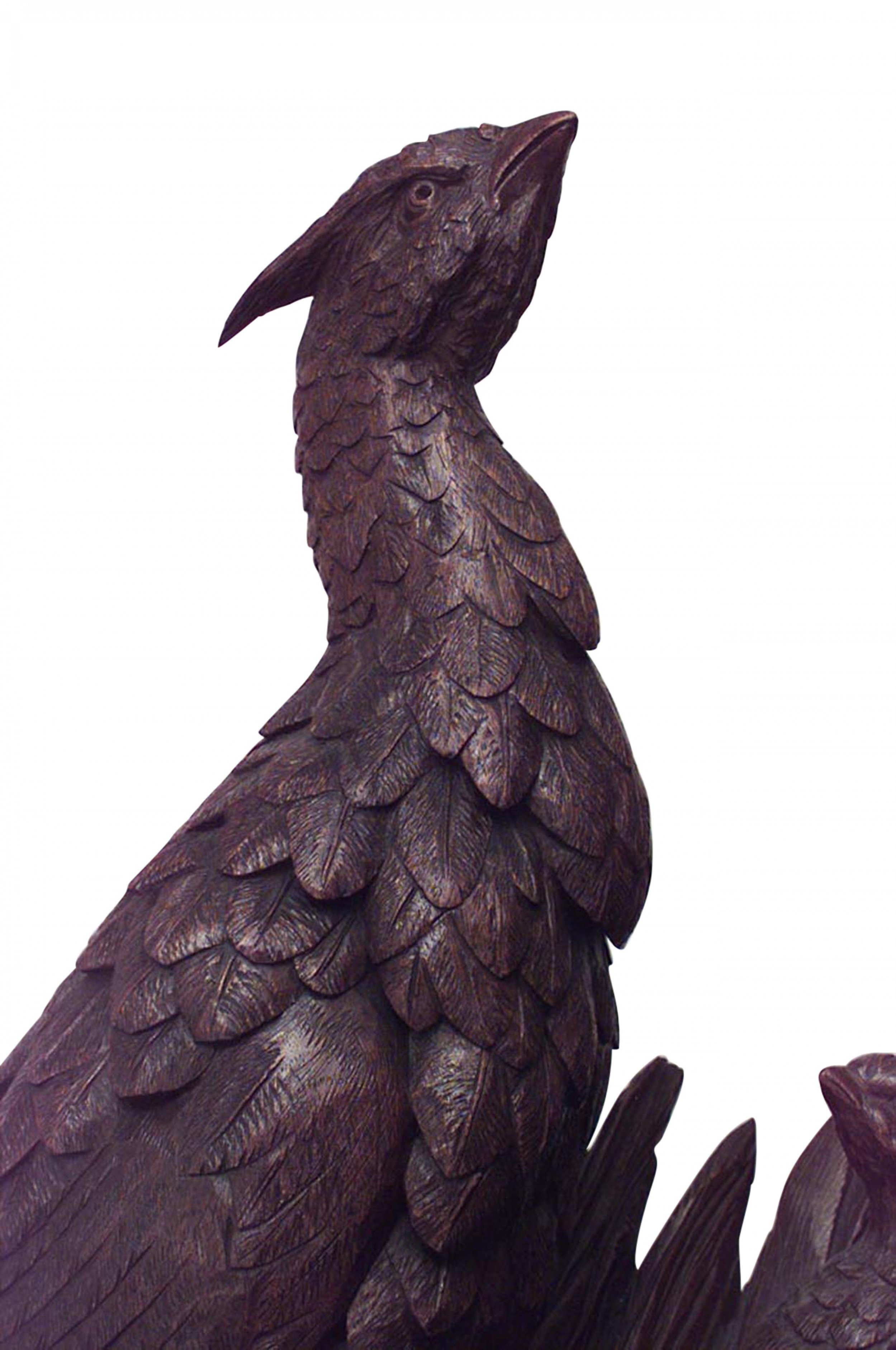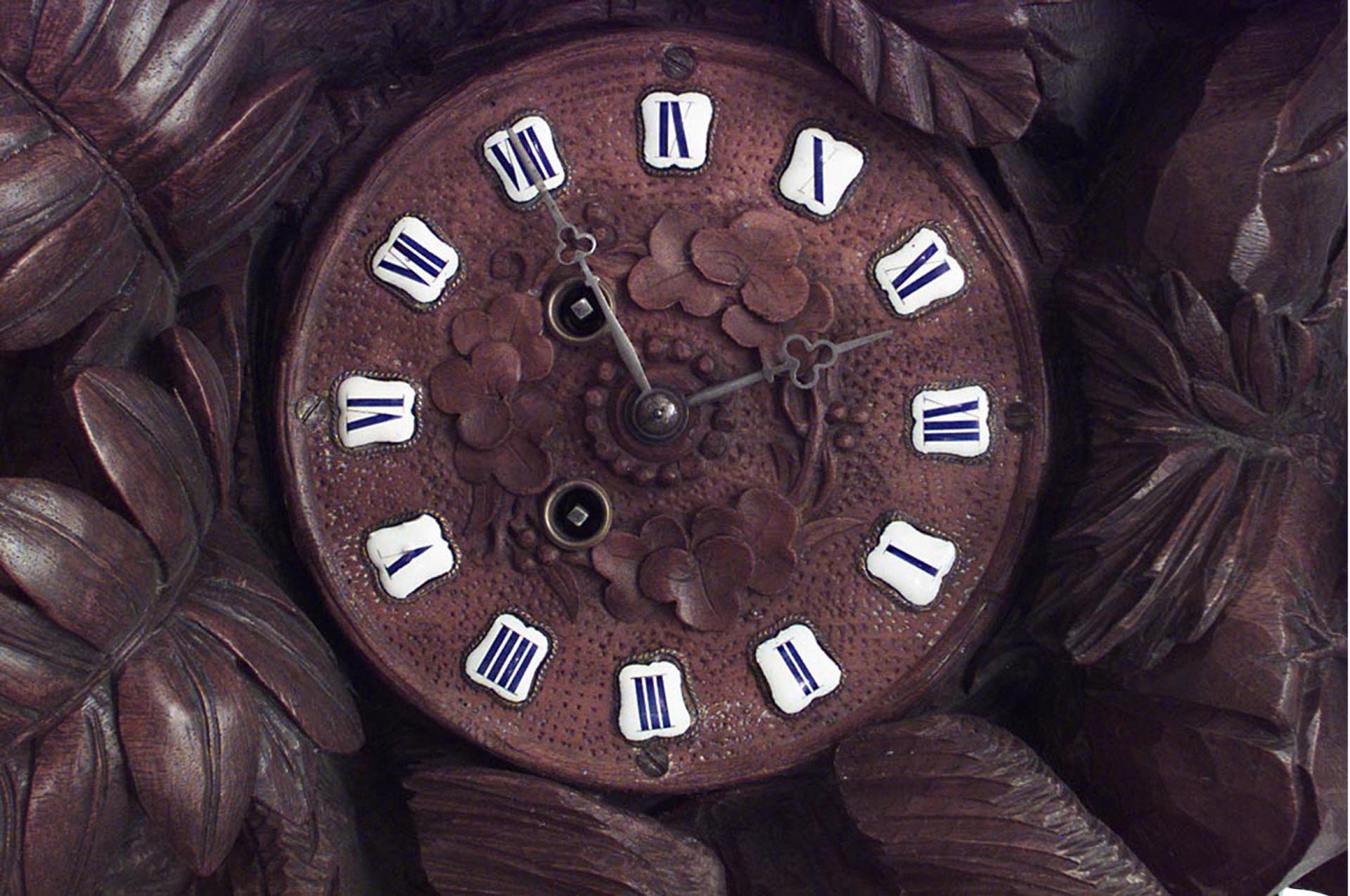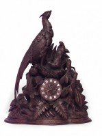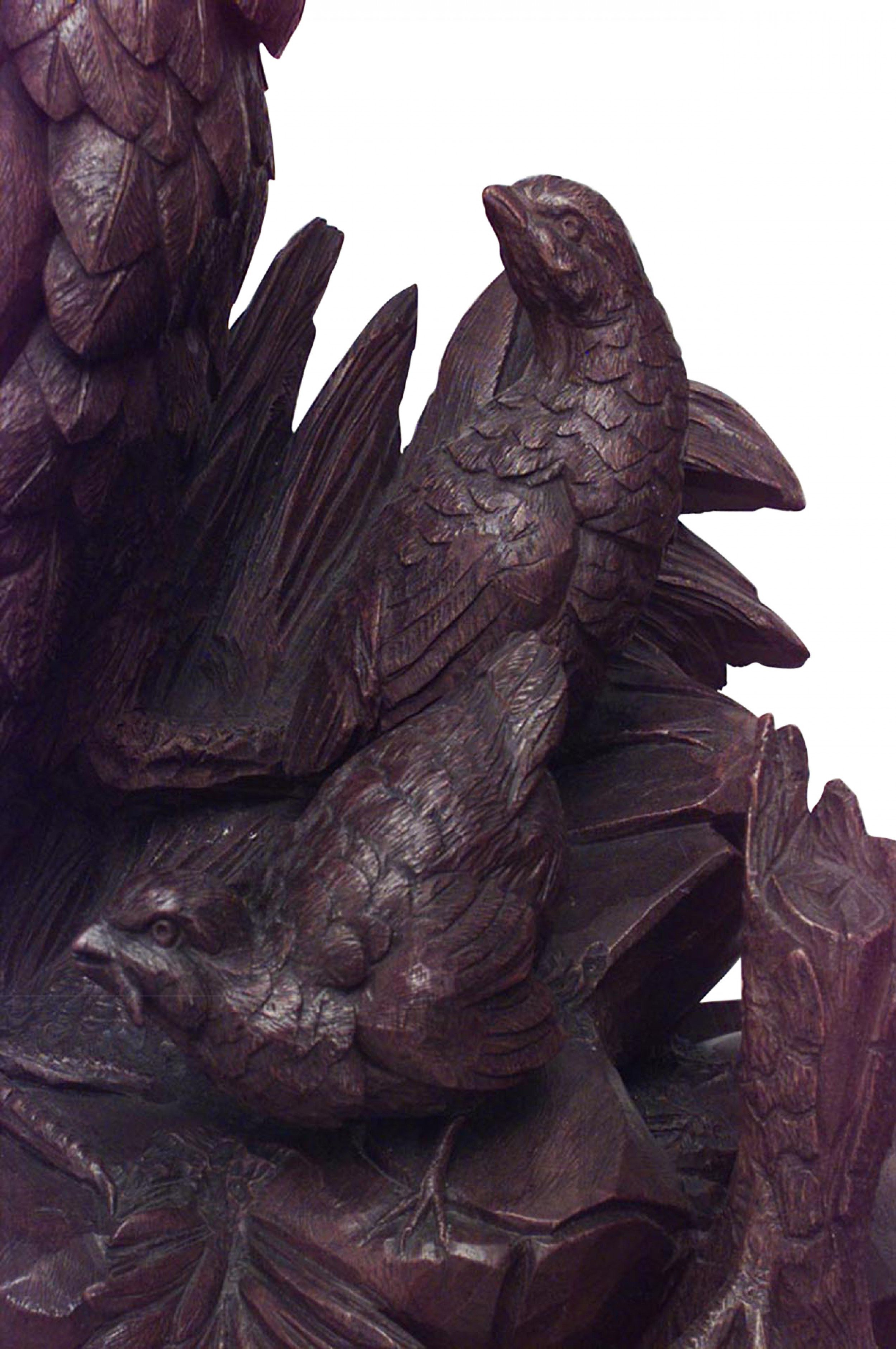 Rustic Black Forest (19th Century) walnut carved mantel clock with 1 large bird and several small chicks within a floral environment. (Not working).