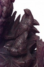 Rustic Black Forest (19th Century) walnut carved mantel clock with 1 large bird and several small chicks within a floral environment. (Not working)