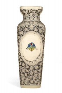 Austrian (Bohemia) Secessionist tapered square glass vase with black scroll & leaf design & oval panels with colored urn & flowers (att: Urban Janke & Ludwig Heinrich Jungnickel.