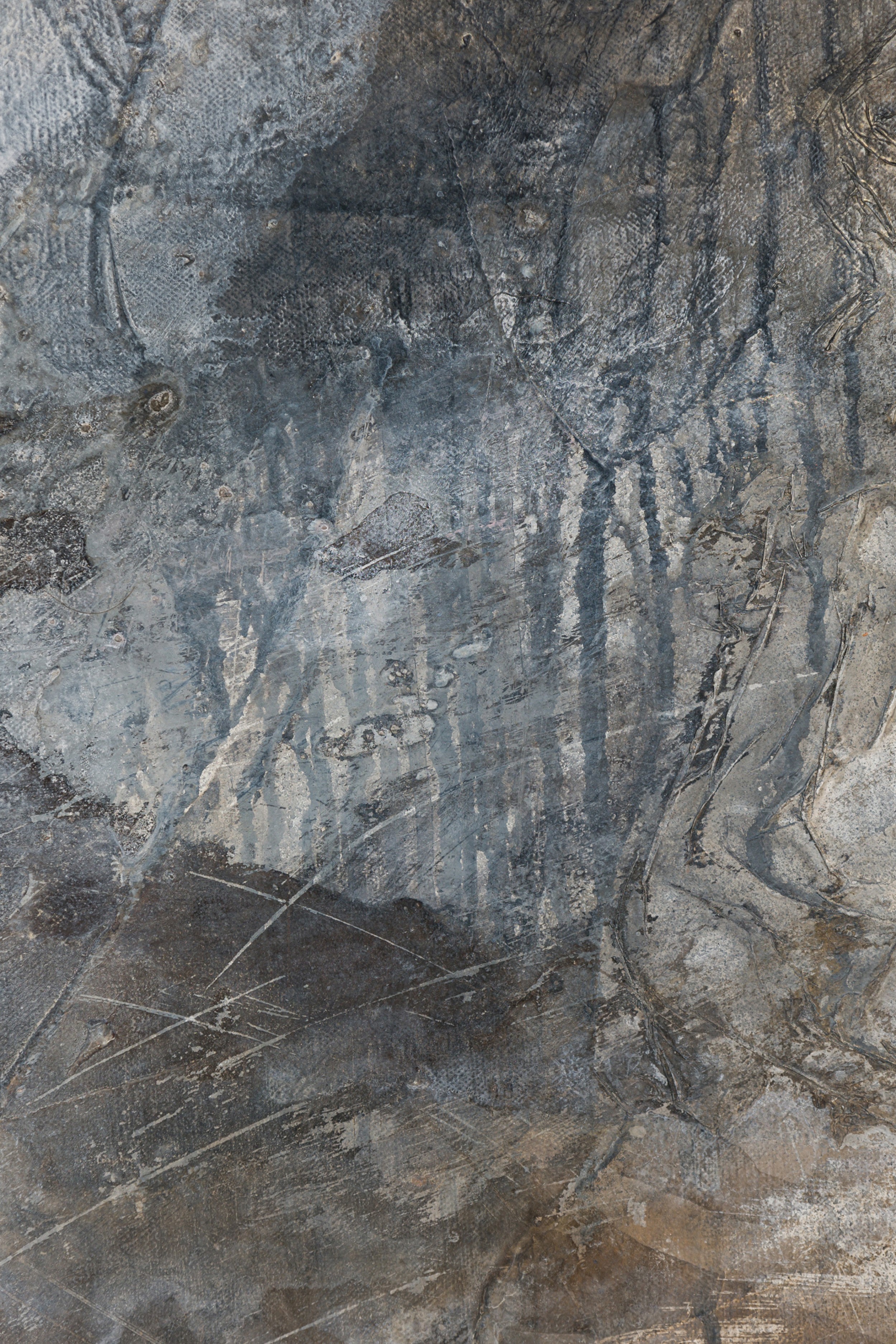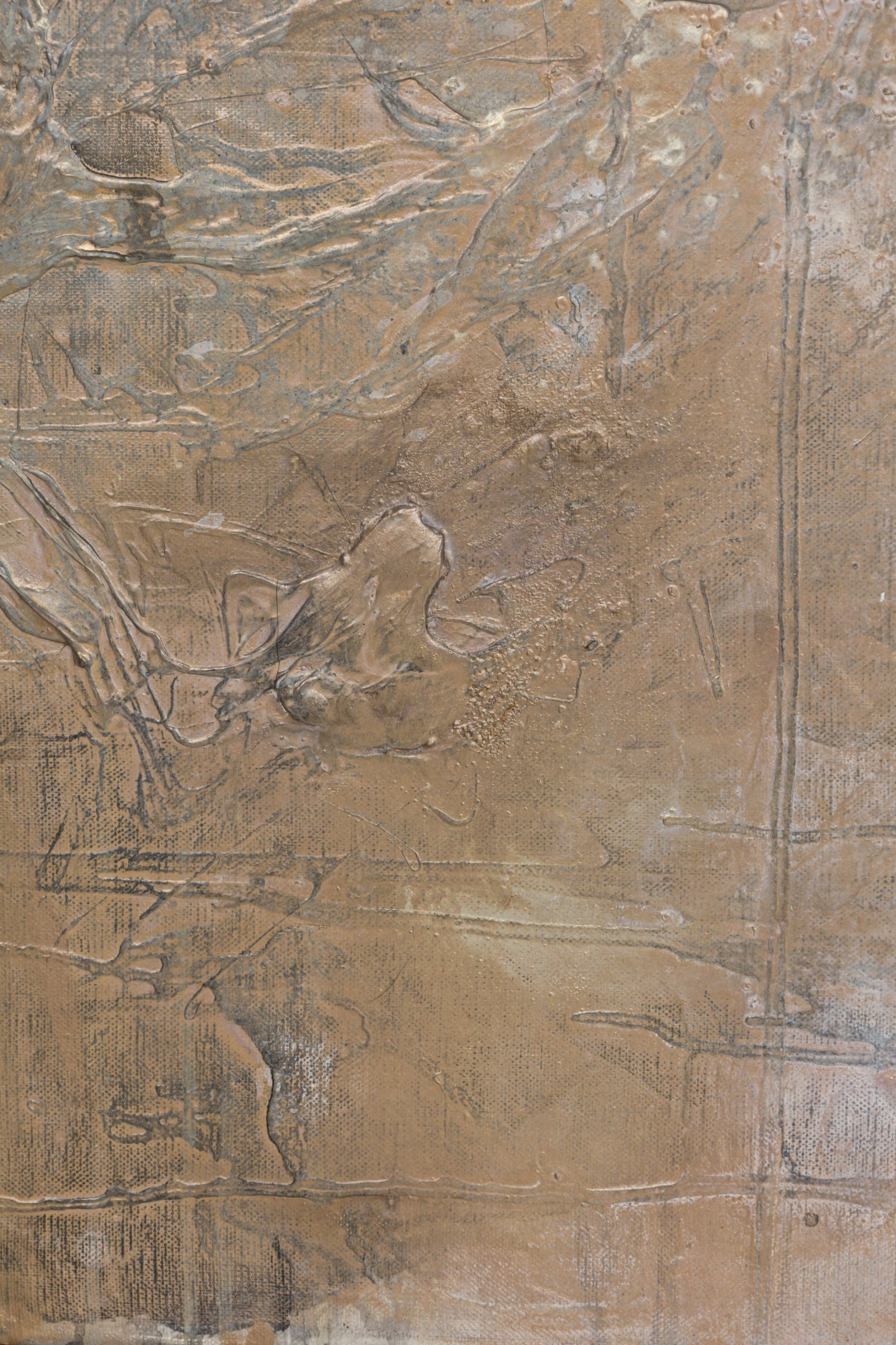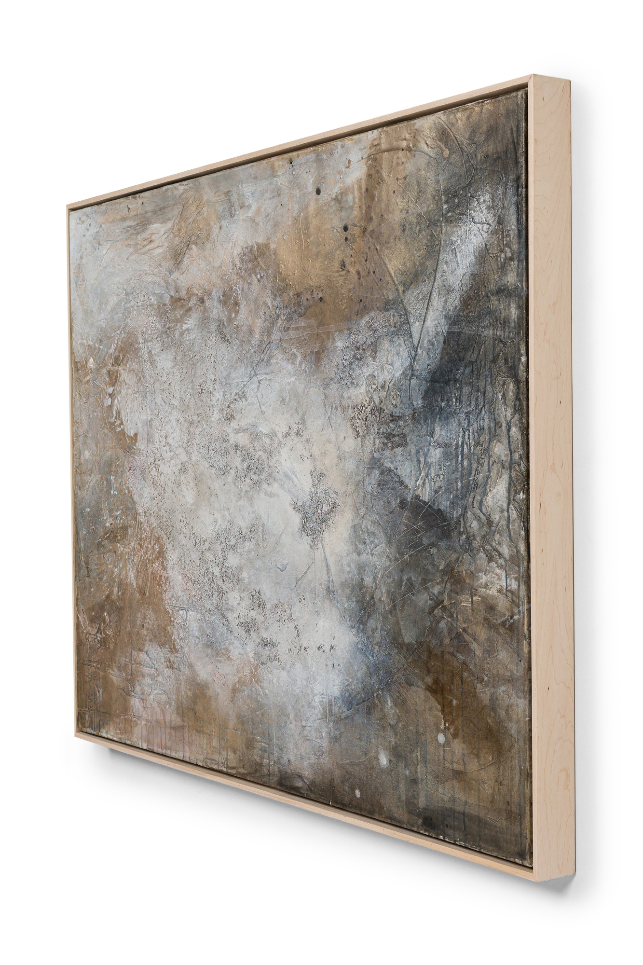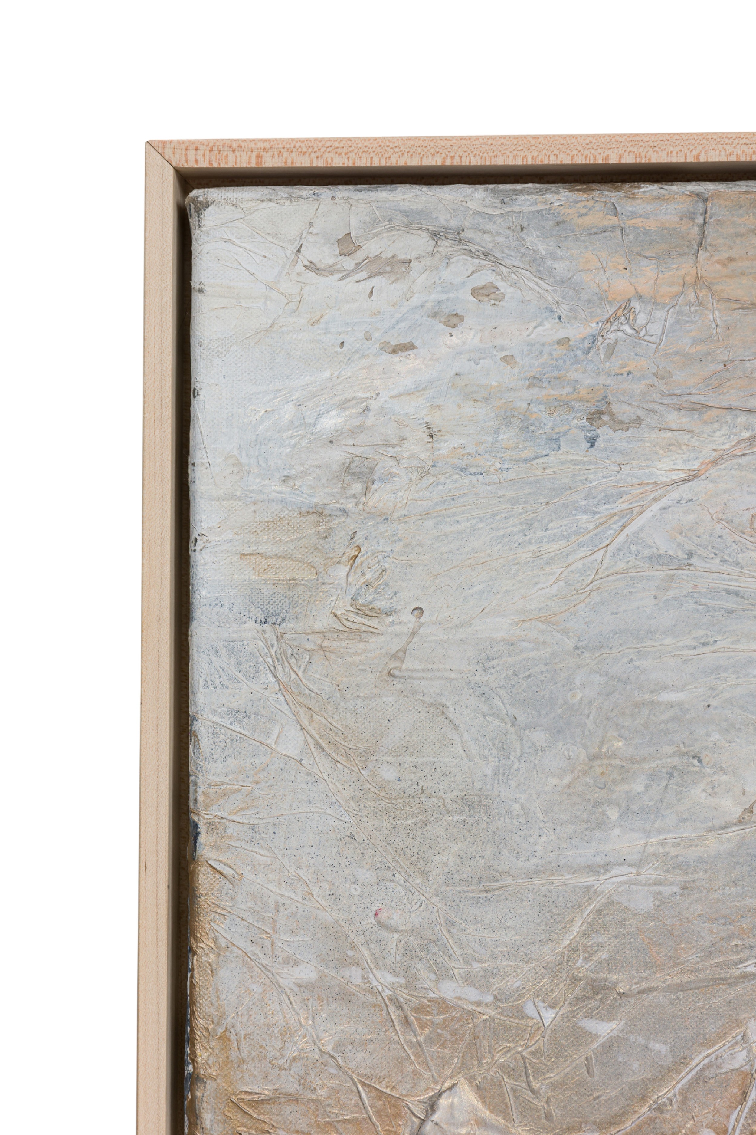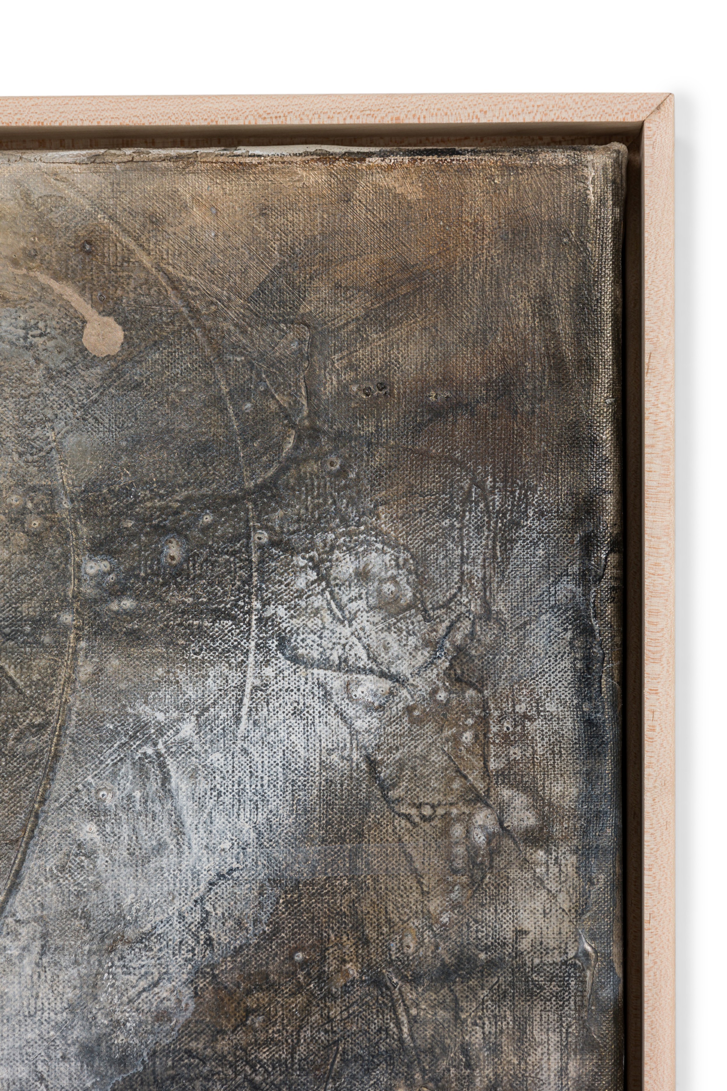 American contemporary abstract expressionist composition of textural and metallic silvers and bronze in mixed media and acrylic on linen in a raw maple gallery frame (signed verso) (BRITTNEY CICCONE)
