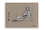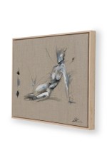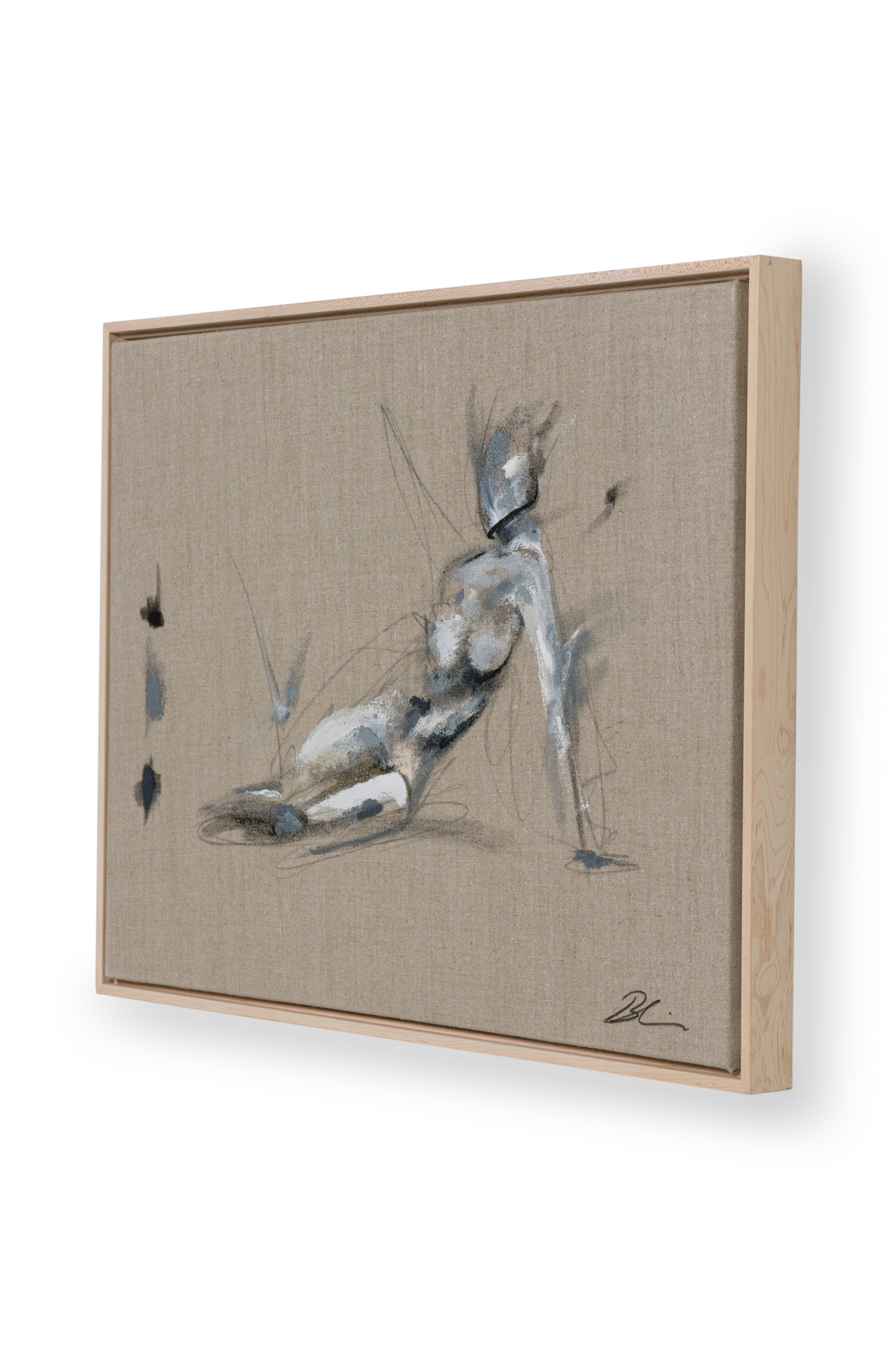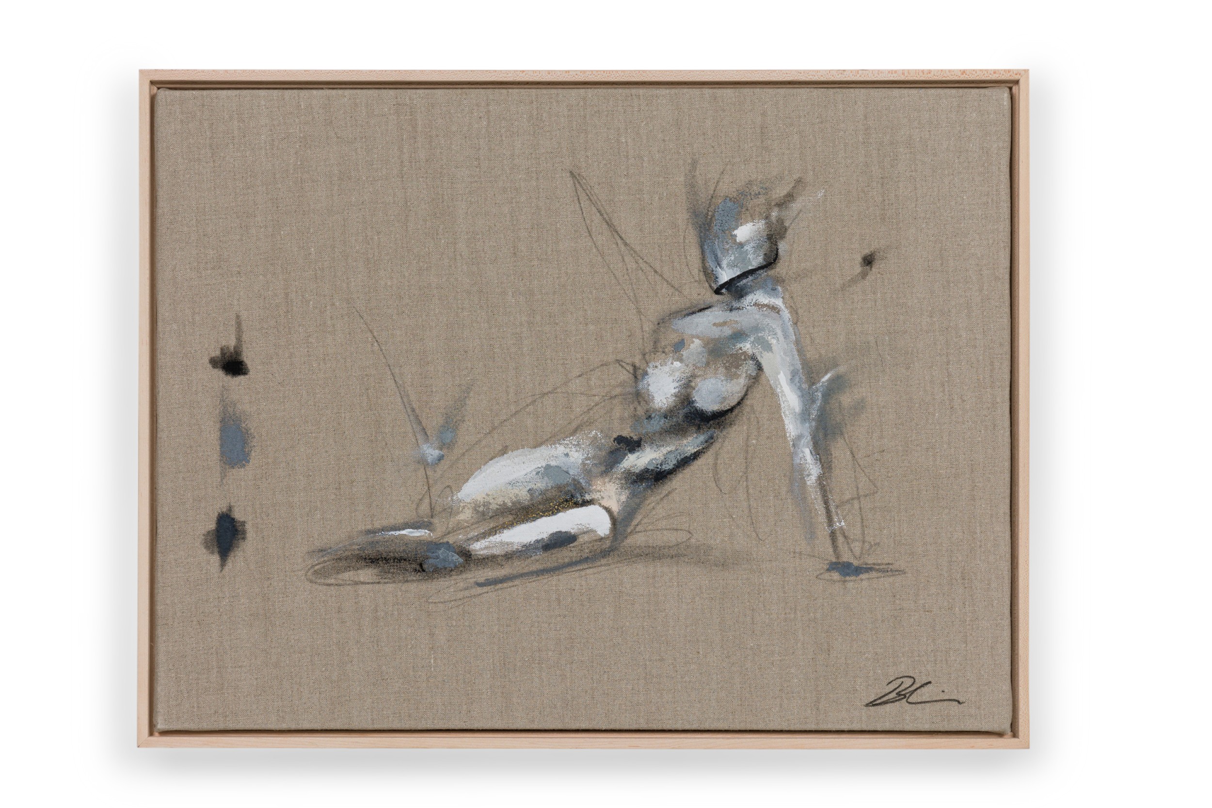 American contemporary figural study of a reclining female model in grey, white and black acrylic on unprimed linen in a raw maple gallery frame (signed lower right) (BRITTNEY CICCONE)