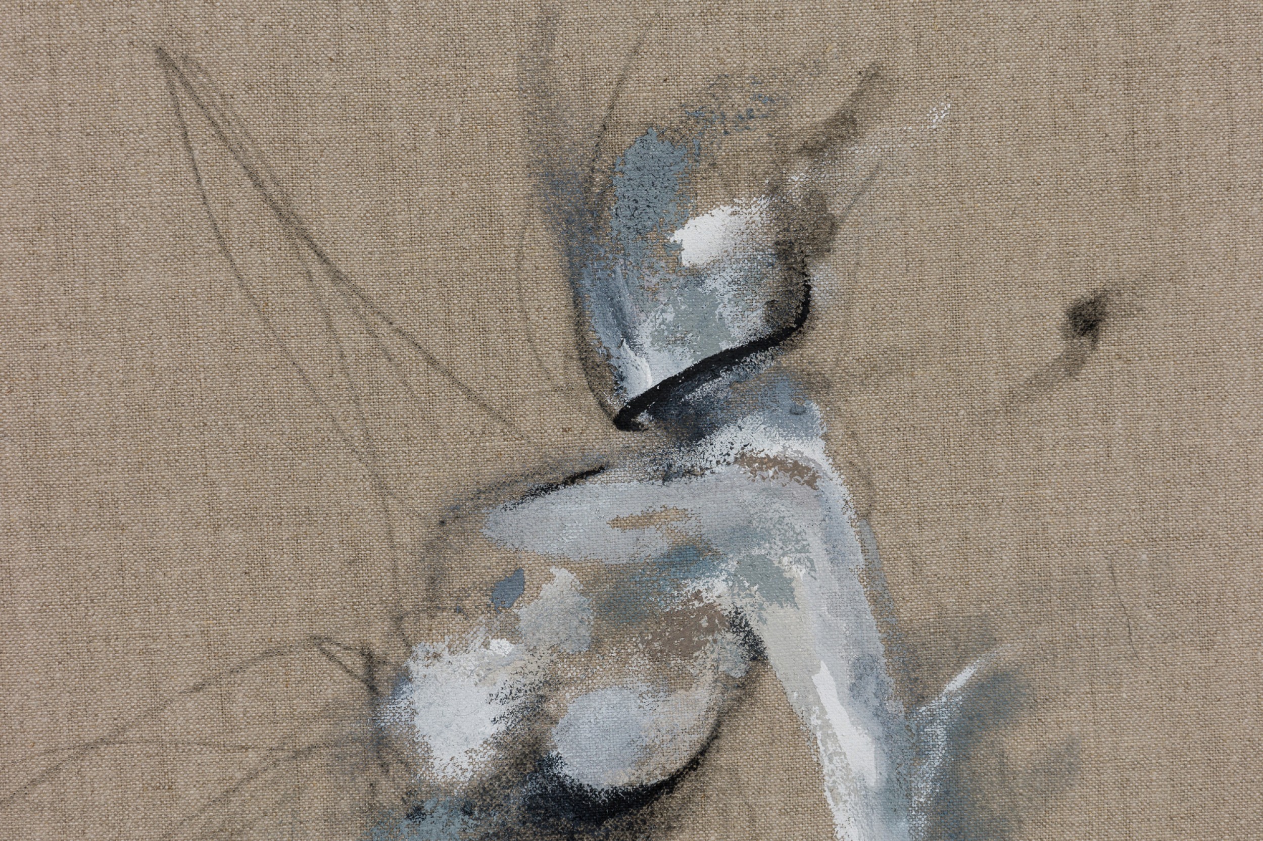 American contemporary figural study of a reclining female model in grey, white and black acrylic on unprimed linen in a raw maple gallery frame (signed lower right) (BRITTNEY CICCONE).