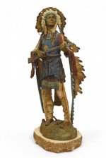 Continental Austrian style bronze multicolored patinaed figure of Native American chief with rifle standing on a travertine base (Kalba style).