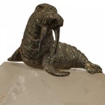 English Victorian small bronze walrus perched on a rock crystal form iceberg.
