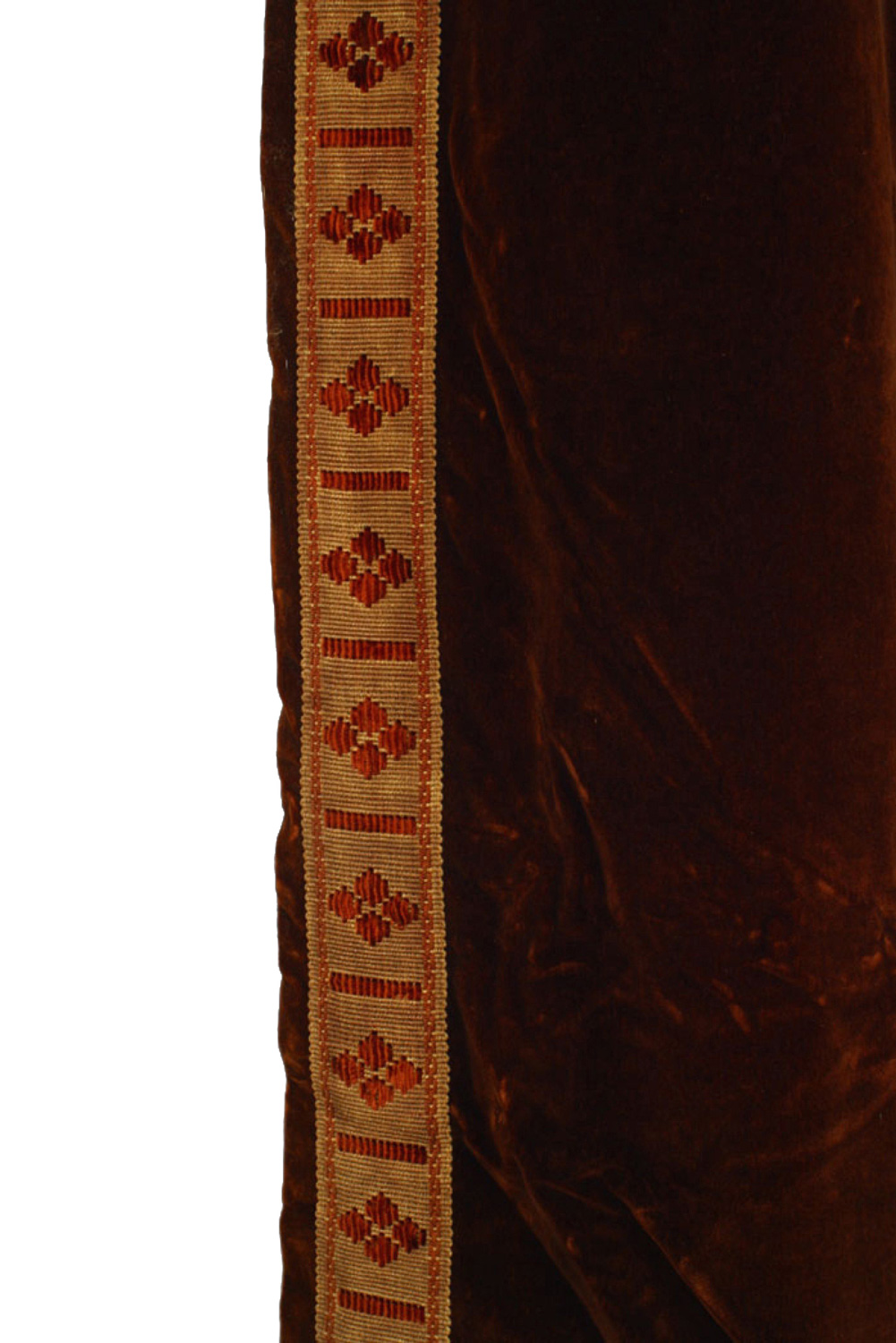 Italian Renaissance style single brown velvet drape with wide metallic thread & velvet border.