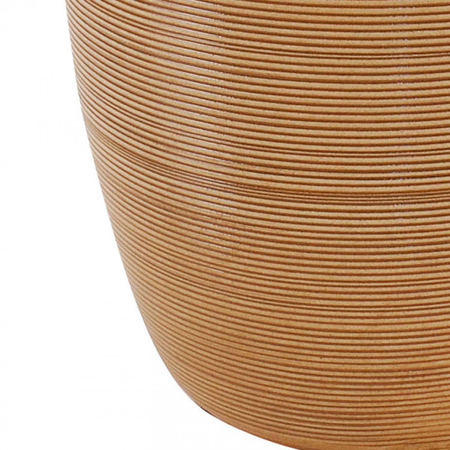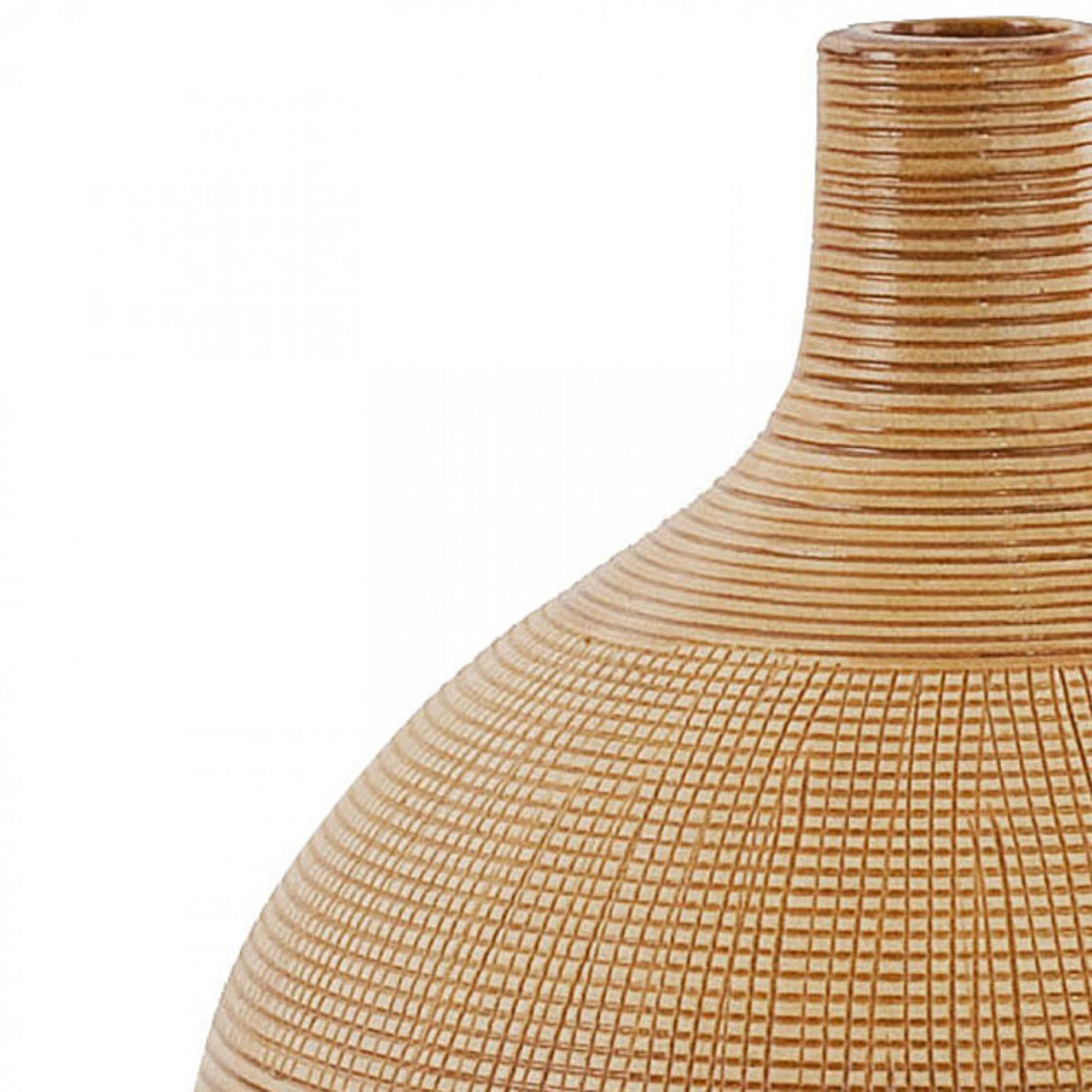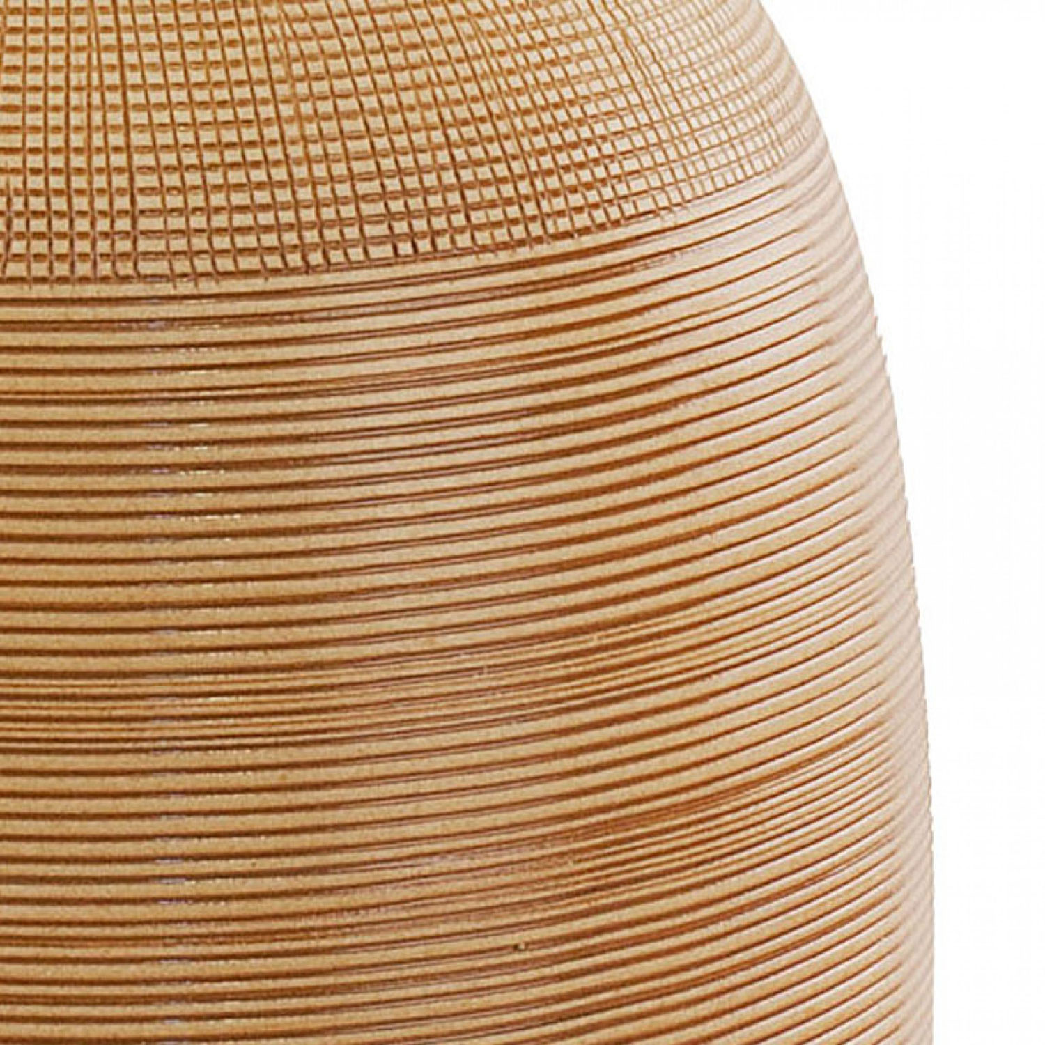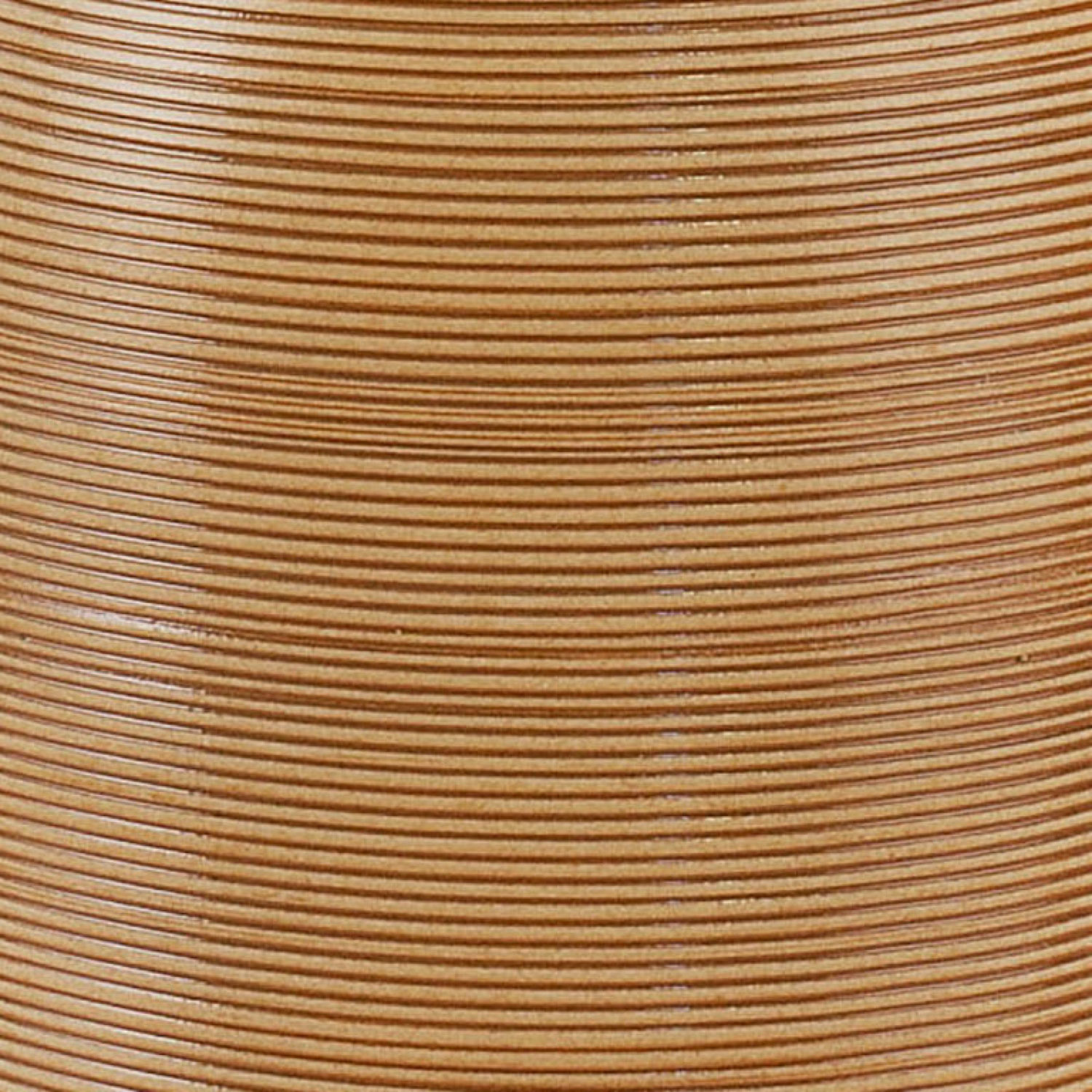 Cylindrical ceramic vase with a rounded top and small, short opening with a gold horizontally ribbed finish